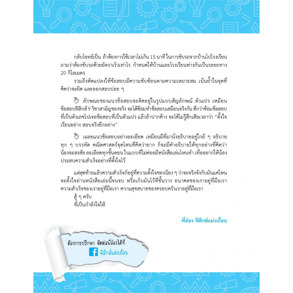 สรุปเข้มเนื้อหาและเทคนิคสำคัญวิชาฟิสิกส์ ครบทุกเรื่องที่จำเป็นก่อนสอบ ไม่ว่าจะเป็น กลศาสตร์ สมบัติของสสาร ความยืดหยุ่น ไฟฟ้า - แม่เหล็ก และฟิสิกส์ยุคใหม่ แบบอธิบายแบบเจาะลึก กระชับ ชัดเจน เข้าใจง่าย พร้อมแนวข้อสอบเสมือนจริงของฟิสิกส์ 9 วิชาสามัญให้ฝึกทำ โดยมีเฉลยแบบละเอียดเหมือนมีติวเตอร์มานั่งติวตัวต่อตัว เหมาะอย่างยิ่งสำหรับใช้ทบทวนเนื้อหาและเตรียมความพร้อม ให้มีความมั่นใจในการสอบมากยิ่งขึ้น