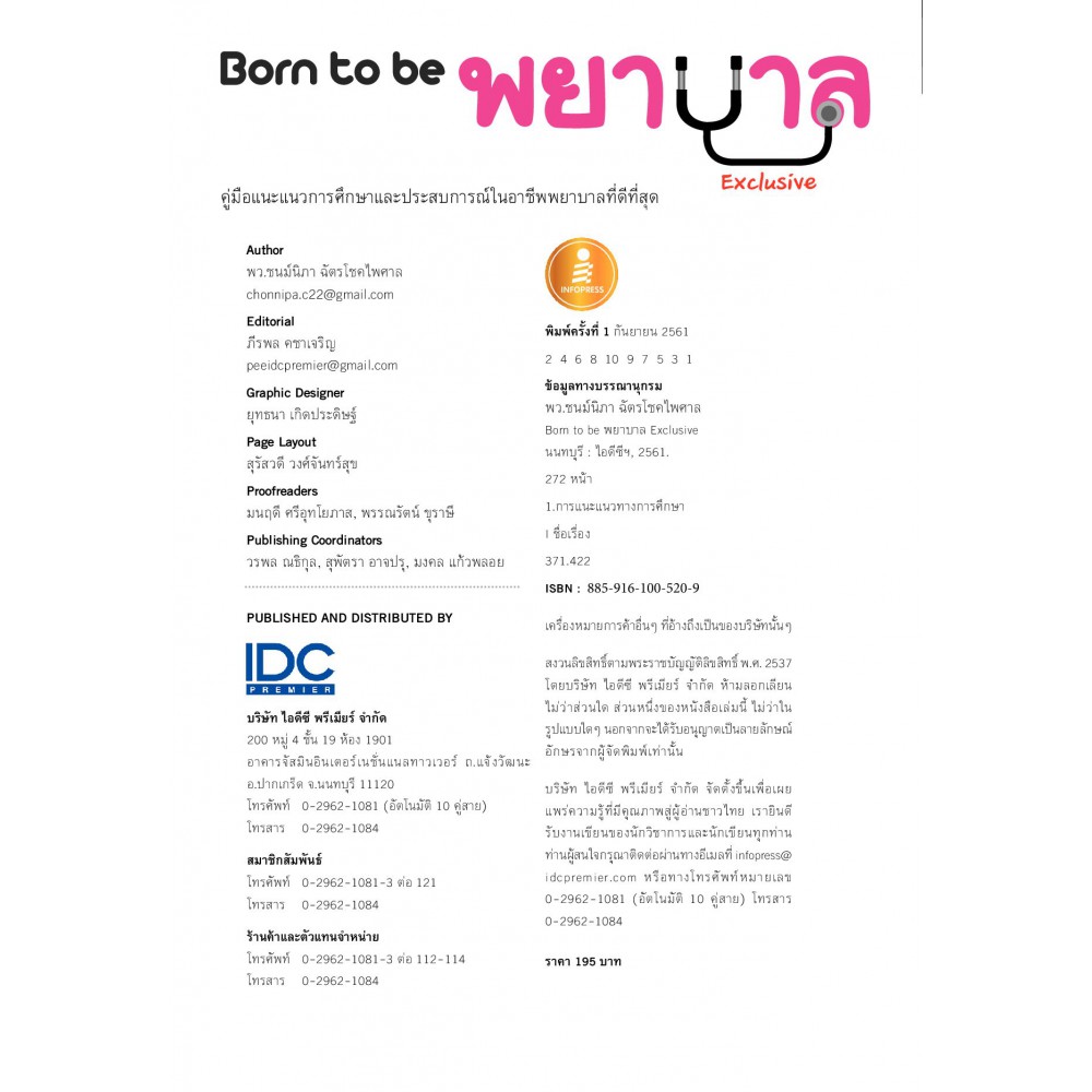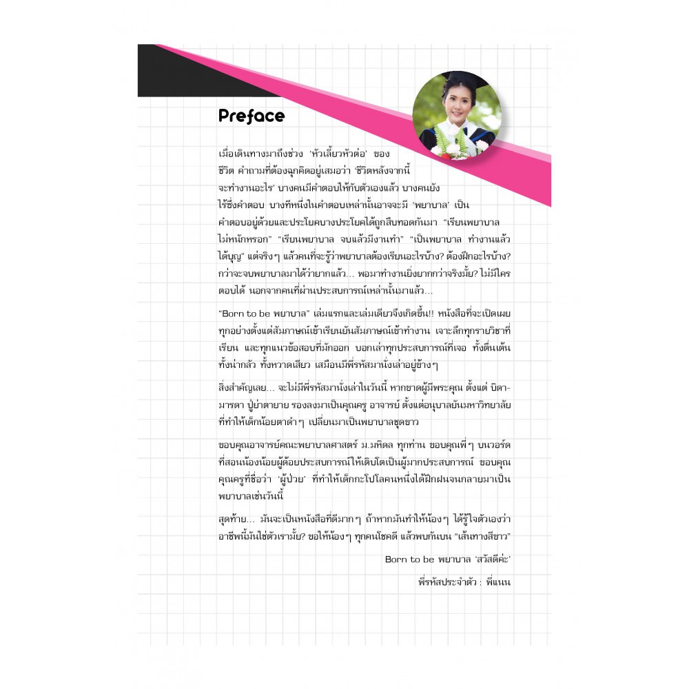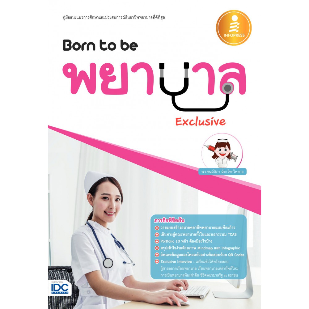 Born to be พยาบาล Exclusive เล่มนี้ เป็นหนังสือแนะแนวการศึกษาและประสบการณ์ใน "อาชีพพยาบาล" เพื่อเป็นแนวทางให้กับนักเรียนในระดับมัธยมเพื่อใช้ค้นหาตนเองในการหาคำตอบว่า อาชีพพยาบาลเหมาะกับตนเองหรือไม่ บอกเส้นทางสู่คณะพยาบาล การเตรียมตัวสอบทั้งในและนอกระบบ "TCAS" เล่าบรรยากาศการเรียนตลอด 4 ปี ลงรายละเอียดวิชาเรียนครบทุกวิชา เพื่อให้ประเมินตนเองได้ว่า ตัวเองถนัดที่จะเรียนหรือไม่