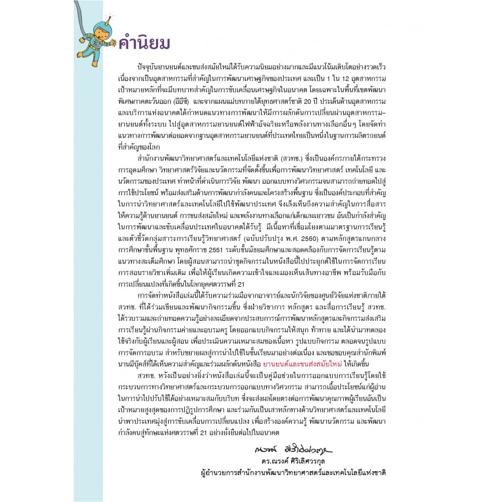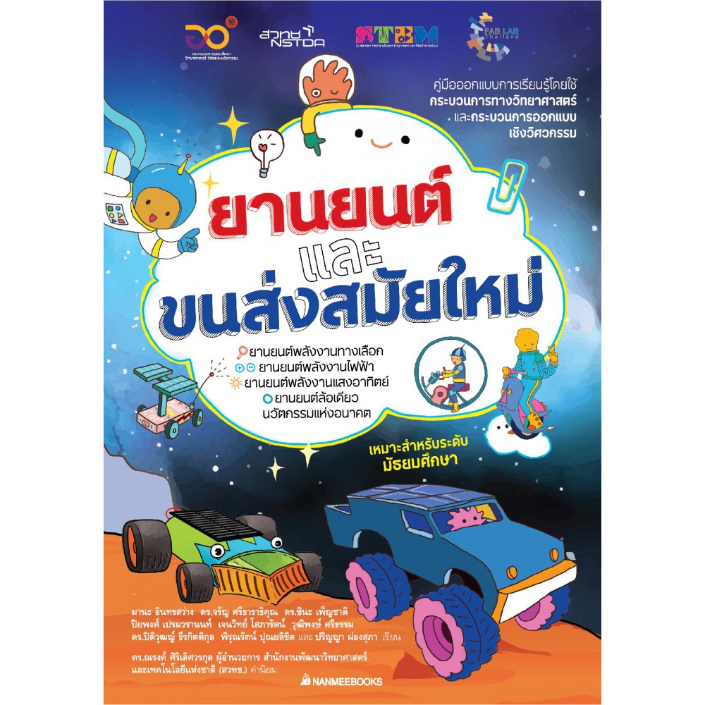 แนวทางการจัดกิจกรรมเสริมการเรียนรู้ตามแนวทางสะเต็มศึกษาเกี่ยวกับยานยนต์และขนส่งสมัยใหม่ ซึ่งประกอบด้วย 4 เรื่อง ได้แก่ ยานยนต์พลังงานทางเลือก ยานยนต์พลังงานไฟฟ้า ยานยนต์พลังงานแสงอาทิตย์ และยานยนต์ล้อเดียว นวัตกรรมแห่งอนาคต ด้วยรูปแบบการเรียนรู้โดยใช้กระบวนการทางวิทยาศาสตร์ และกระบวนการออกแบบเชิงวิศวกรรม เรียนรู้การนำพลังงานทางเลือกและกระบวนการคิดเชิงออกแบบเชื่อมโยงการพัฒนายานยนต์และขนส่งสมัยใหม่ ถ่ายทอดผ่านประสบการณ์จากนักวิจัยของศูนย์วิจัยแห่งชาติ สวทช. พัฒนาทักษะความคิดริเริ่มสร้างสรรค์ การแก้ปัญหา และฝึกทักษะการใช้เครื่องมือสร้างชิ้นงาน