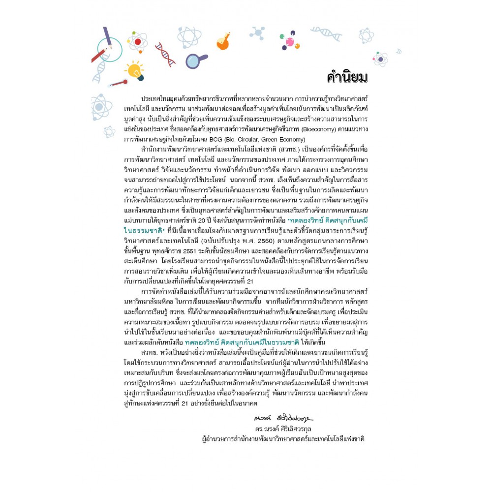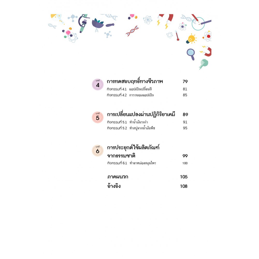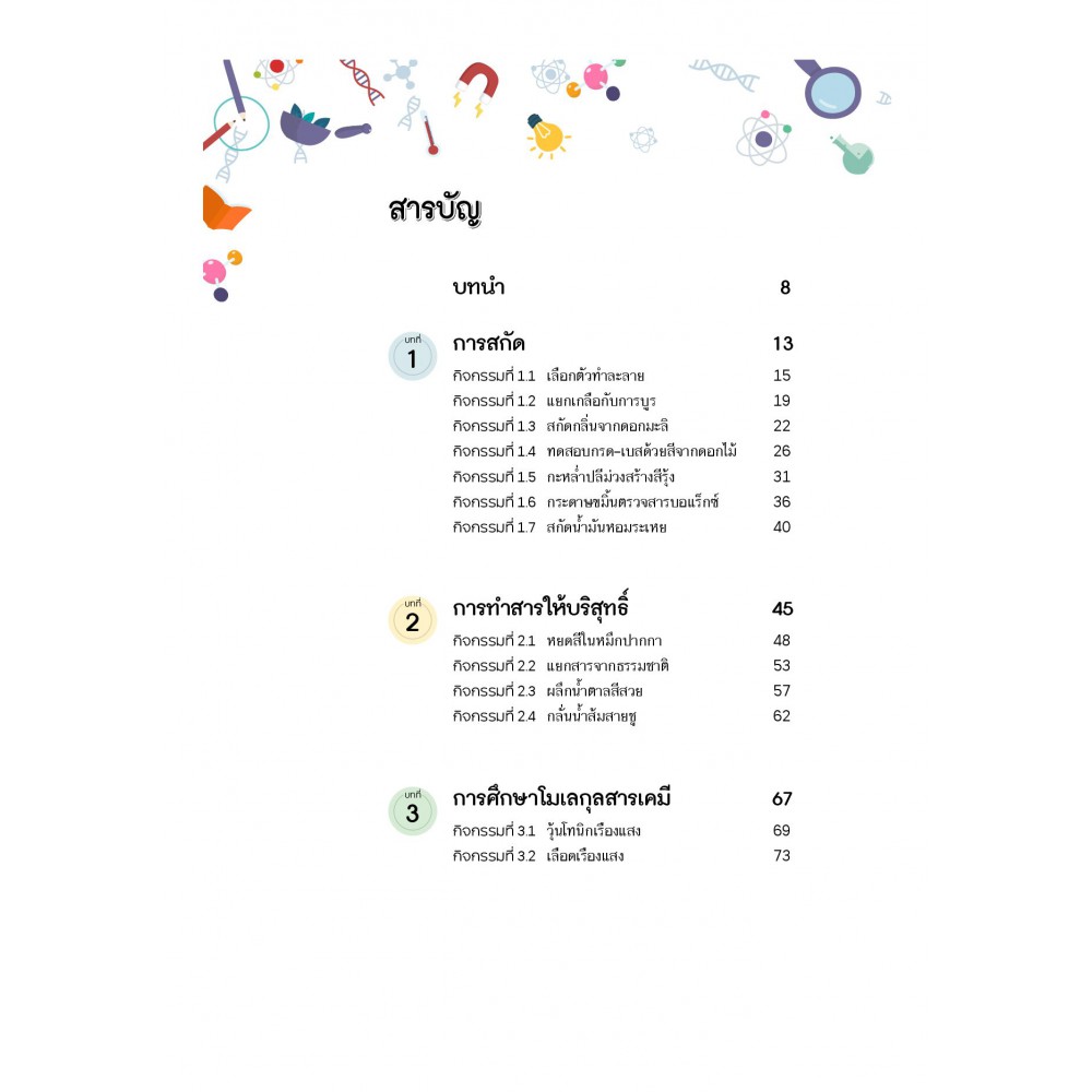 แนวทางการจัดกิจกรรมและเสริมการเรียนรู้การทดลองเคมีพื้นฐาน นำเสนอแนวคิดและกระบวนการวิจัย รวมถึงพัฒนาสารผลิตภัณฑ์ธรรมชาติ 6 ขั้นตอนหลัก ได้แก่ การสกัดสารตัวอย่าง การทำสารให้บริสุทธิ์ การศึกษาโมเลกุลสารเคมี การทดสอบฤทธิ์ทางชีวภาพ การเปลี่ยนแปลงผ่านปฏิกิริยาเคมีเพื่อพัฒนาประสิทธิภาพ และการนำไประยุกต์ใช้ประโยชน์ เหมาะสำหรับครูนำไปใช้ประกอบการสอนในห้องเรียนและผู้ที่ชื่นชอบการทดลอง