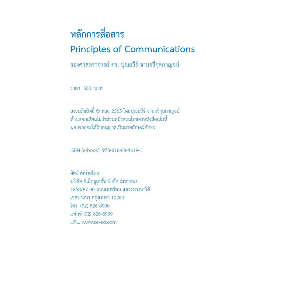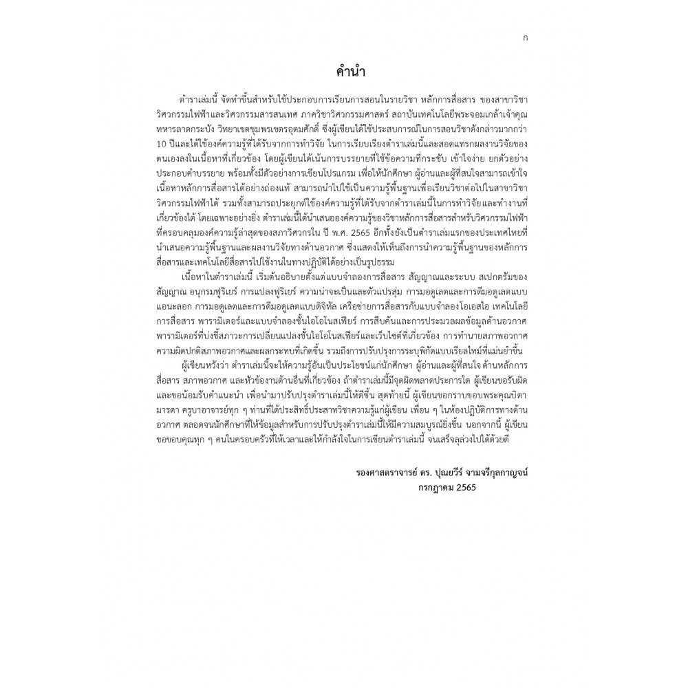 ตำราเล่มนี้ จัดทำขึ้นสำหรับใช้ประกอบการเรียนการสอนในรายวิชา หลักการสื่อสาร ของสาขาวิชาวิศวกรรมไฟฟ้าและวิศวกรรมสารสนเทศ ภาควิชาวิศวกรรมศาสตร์ สถาบันเทคโนโลยีพระจอมเกล้าเจ้าคุณทหารลาดกระบัง วิทยาเขตชุมพรเขตรอุดมศักดิ์ ซึ่งผู้เขียนได้ใช้ประสบการณ์ในการสอนวิชาดังกล่าวมากกว่า10 ปีและได้ใช้องค์ความรู้ที่ได้รับจากการทำวิจัย ในการเรียบเรียงตำราเล่มนี้และสอดแทรกผลงานวิจัยของตนเองลงในเนื้อหาที่เกี่ยวข้อง โดยผู้เขียนได้เน้นการบรรยายที่ใช้ข้อความที่กระชับ เข้าใจง่าย ยกตัวอย่างประกอบคำบรรยาย พร้อมทั้งมีตัวอย่างการเขียนโปรแกรม เพื่อให้นักศึกษา ผู้อ่านและผู้ที่สนใจสามารถเข้าใจเนื้อหาหลักการสื่อสารได้อย่างถ่องแท้ สามารถนำไปใช้เป็นความรู้พื้นฐานเพื่อเรียนวิชาต่อไปในสาขาวิชาวิศวกรรมไฟฟ้าได้ รวมทั้งสามารถประยุกต์ใช้องค์ความรู้ที่ได้รับจากตำราเล่มนี้ในการทำวิจัย และทำงานที่เกี่ยวข้องได้ โดยเฉพาะอย่างยิ่ง ตำราเล่มนี้ได้นำเสนอองค์ความรู้ของวิชาหลักการสื่อสารสำหรับวิศวกรรมไฟฟ้าที่ครอบคลุมองค์ความรู้ล่าสุดของสภาวิศวกรใน ปี พ.ศ. 2565 อีกทั้งยังเป็นตำราเล่มแรกของประเทศไทยที่นำเสนอความรู้พื้นฐานและผลงานวิจัยทางด้านอวกาศ ซึ่งแสดงให้เห็นถึงการนำความรู้พื้นฐานของหลักการสื่อสารและเทคโนโลยีสื่อสารไปใช้งานในทางปฏิบัติได้อย่างเป็นรูปธรรม