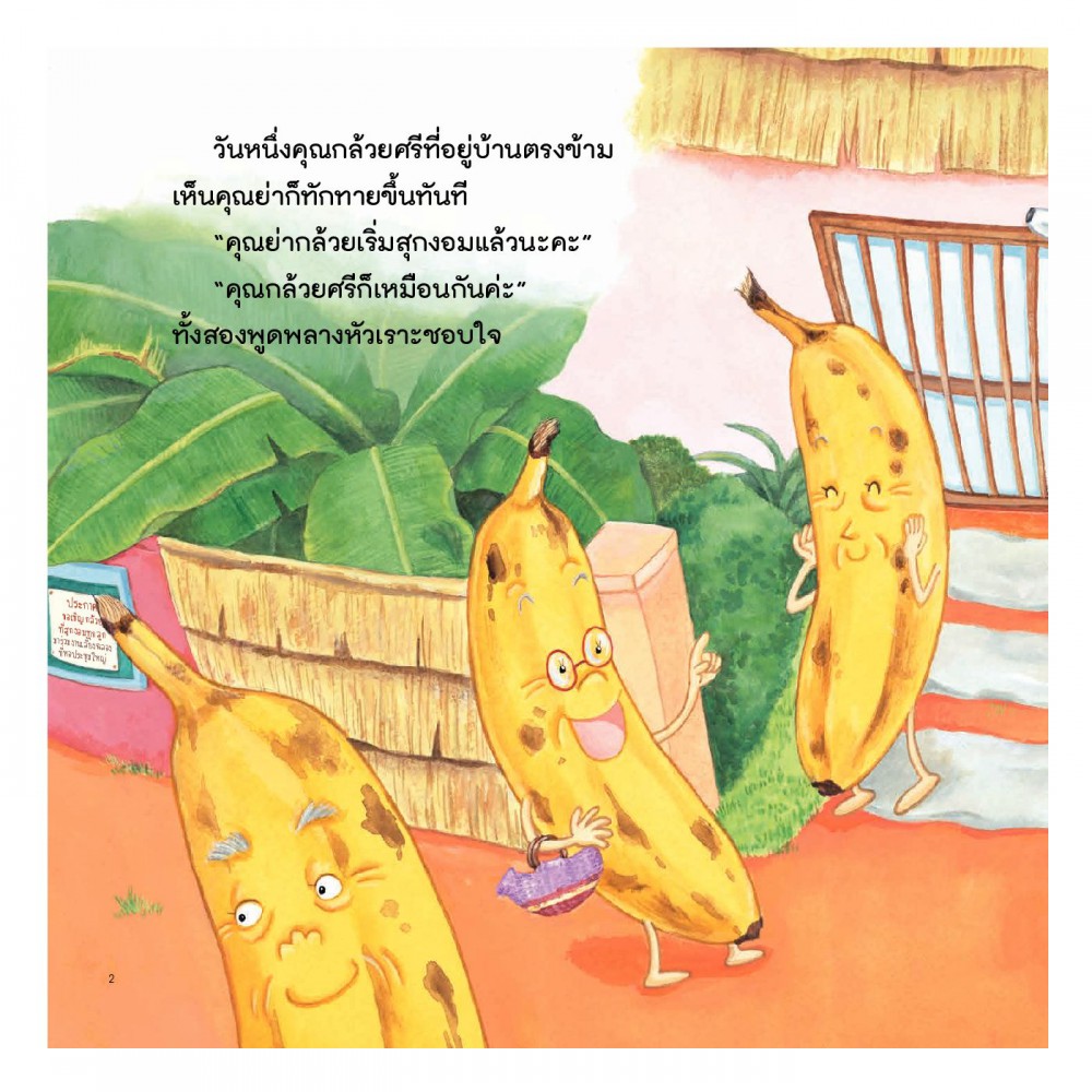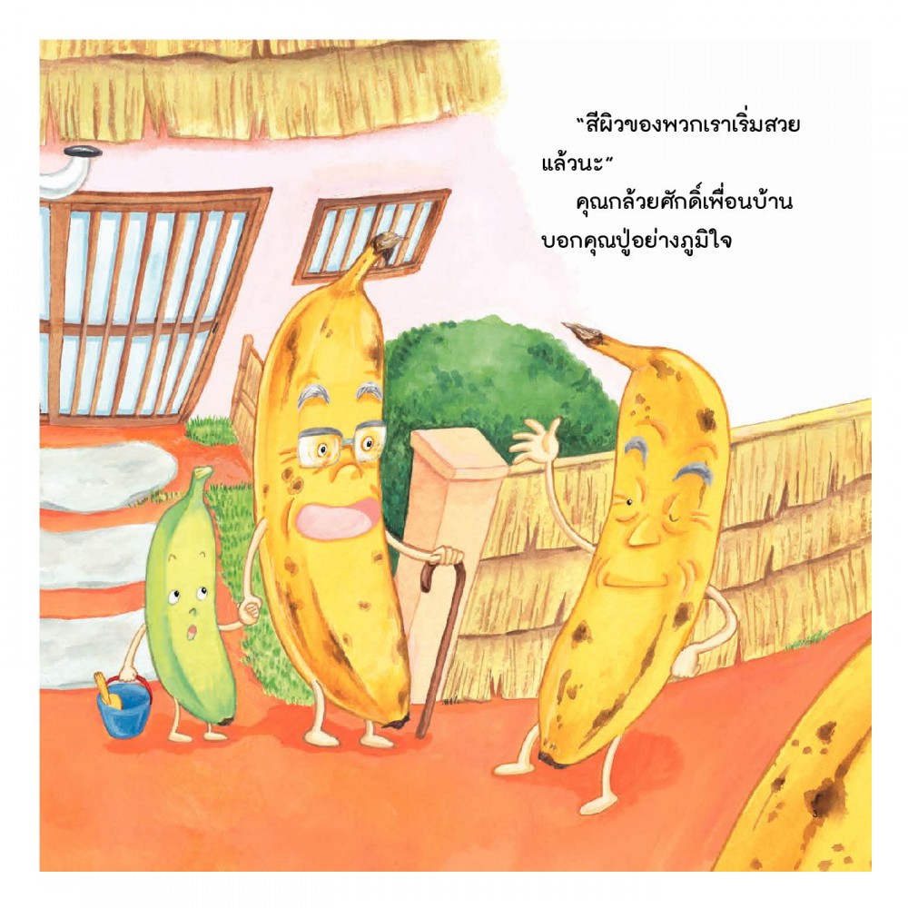 จู่ ๆ กล้วยน้อยที่วิ่งเล่นอยู่ก็ลื่นล้มไปเสียแล้ว! ใครมาปอกเปลือกกล้วยทิ้งไว้กันนะ รู้ไหมจ๊ะว่าจากกล้วยสีเขียวค่อย ๆ สุกงอมเป็นสีเหลืองและแปลงร่างได้มากมายเชียวล่ะ!"