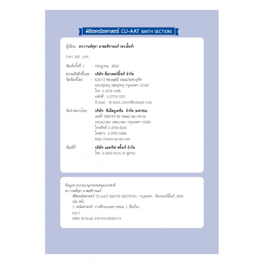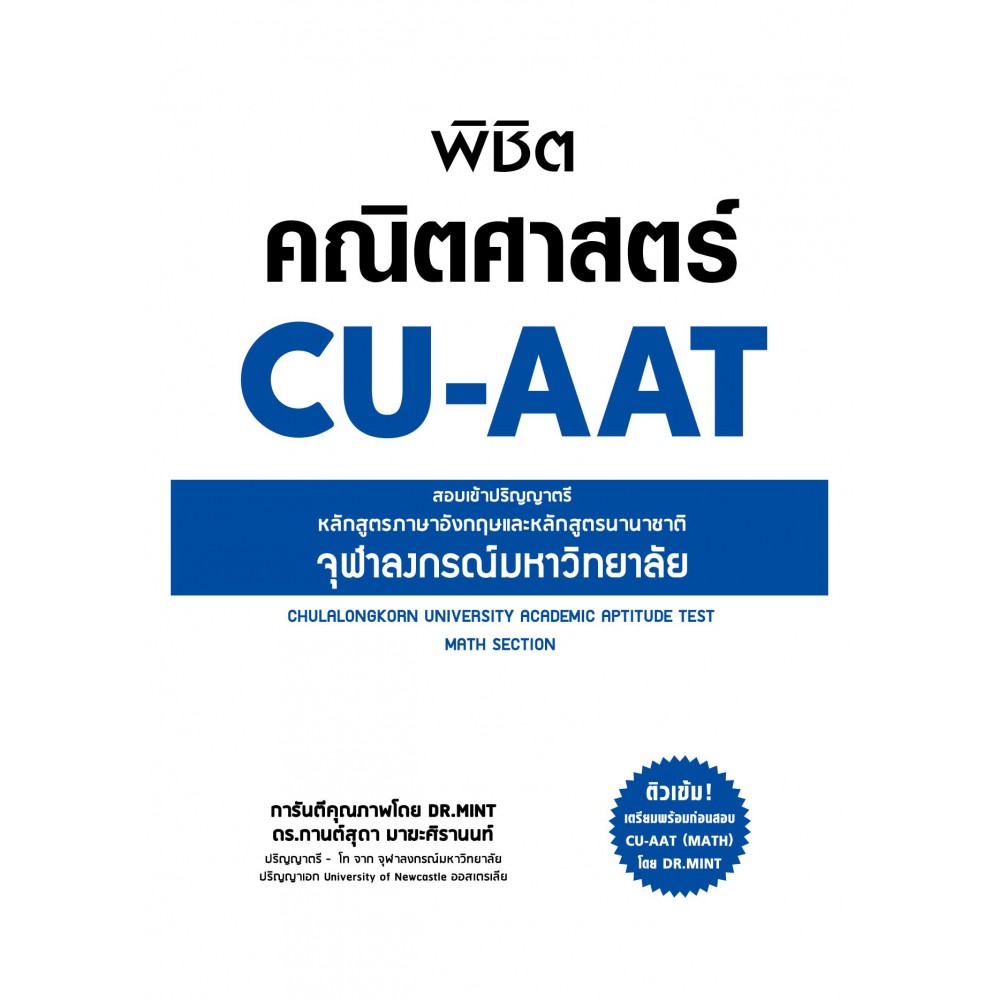 "พิชิตคณิตศาสตร์ CU-AAT หนังสือสุดยอดคู่มือคณิตศาสตร์ CU-AAT เล่มนี้ ได้สรุปเนื้อหาสำคัญ ๆ ของคณิตศาสตร์ทั้ง 4 ส่วนที่ประกอบไปด้วย คณิตศาสตร์ (Arithmetic) พีชคณิต (Algebra) เรขาคณิต (Geometry) ปัญหาโจทย์ข้อความ (Word Problems) เพื่อใช้สอบเข้าเรียนต่อระดับปริญญาตรีหลักสูตรภาษาอังกฤษและนานาชาติที่จุฬาลงกรณ์มหาวิทยาลัย ซึ่งในแต่ละบทจะมีแบบทดสอบพร้อมเฉลยและคำอธิบาย รวมทั้งในตอนท้ายยังรวบรวมแนวข้อสอบ คณิตศาสตร์ CU-AAT พร้อมเฉลยและเทคนิควิธีคิดไว้อย่างละเอียดอีกด้วย