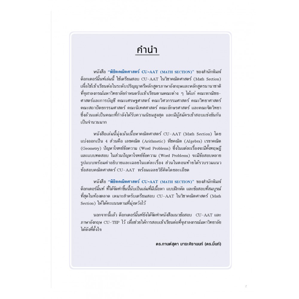 สรุปเนื้อหาคณิตศาสตร์เข้มข้น มีแบบฝึกหัดและตัวอย่างข้อสอบเพื่อเตรียมสอบคณิตศาสตร์ CU-AAT ARITHMETIC ALGEBRA GEOMETRY PROBLEM SOLVING เคล็ดลับทำข้อสอบคณิตศาสตร์ CU-AAT คะแนนทะลุ 800 ! พร้อมเฉลยและคำอธิบายอย่างละเอียด การันตีคุณภาพโดย DR.MINT ดร.กานต์สุดา มาฆะศิรานนท์