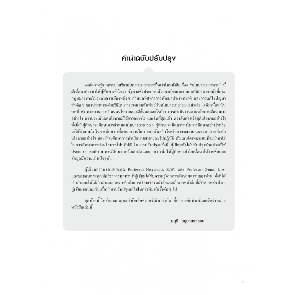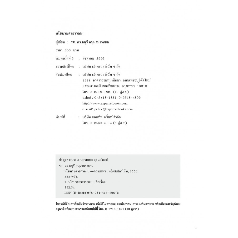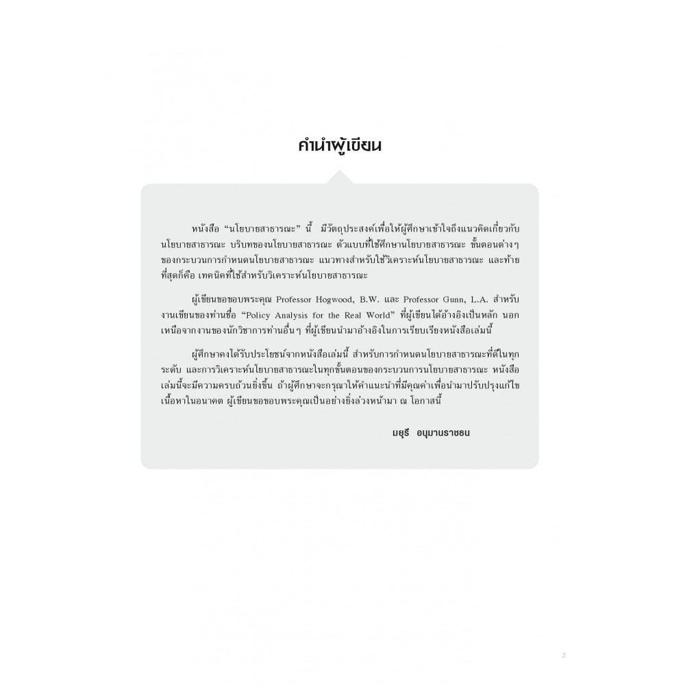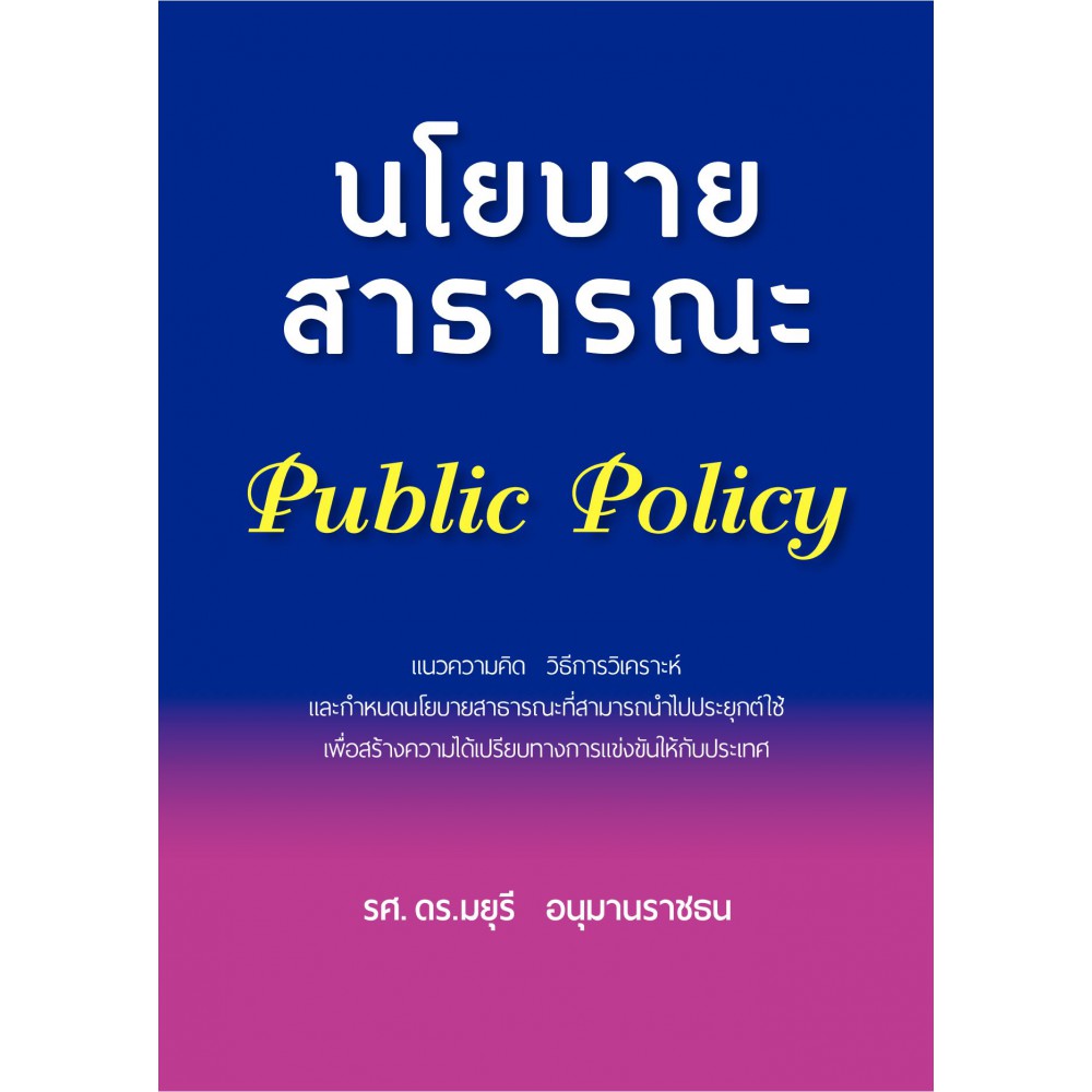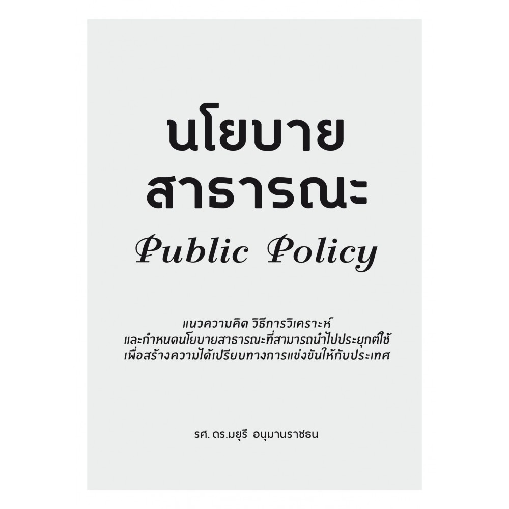 นโยบายสาธารณะ เป็นปัจจัยสำคัญที่ส่งผลต่อการพัฒนาทางเศรษฐกิจและสังคมของประเทศ ผู้บริหารงานภาครัฐทั่งส่วนกลางและส่วนท้องถิ่นจึงต้องเน้นในการวิเคราะห์ประเด็นปัญหาสาธารณะให้ถูกต้อง พยากรณ์แนวโน้มของพัฒนาการด้านต่างๆ อย่างสมเหตุสมผล กำหนดวัตถุประสงค์ของนโยบายใดๆได้อย่างบูรณาการ และนำนโยบายไปปฏิบัติอย่างมีประสิทธิผล นโยบายสาธารณะ เป็นเครื่องมือที่สำคัญต่อการกำหนดทิศทางการพัฒนาเศรษฐกิจ สังคมและการเมืองของประเทศ ทำให้รัฐบาลของทุกประเทศในโลกต้องสนใจที่จะกำหนดนโยบายที่ดี และให้มีการนำนโยบายไปปฎิบัติอย่างมีประสิทธิผลและประสิทธิภาพ เพื่อสร้างความอยู่ดีมีสุข ความเสมอภาค และความเป็นธรรมให้กับประชาชนและความเจริญมั่งคั่งให้กับประเทศ นโยบายสาธารณะถือเป็นปัจจัยสำคัญในการกำหนดความสำเร็จและความล้มเหลวของการบริหารประเทศ หนังสือเล่มนี้ได้รวบรวมเนื้อหาที่เกี่ยวข้องซึ่งจะเป็นประโยชน์ที่จะนำไปประยุกต์ใช้ได้จริง