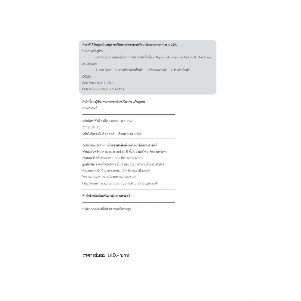 ตำราเล่มนี้จัดทำขึ้นเพื่อให้นักศึกษากายภาพบำบัด นักกายภาพบำบัด และผู้สนใจ มีความตระหนักถึงกิจกรรมทางกาย พฤติกรรมเนือยนิ่ง และกลุ่มอาการเมตาบอลิก ตั้งแต่ช่วงวัยเด็ก ซึ่งเป็นสาเหตุสำคัญของการเกิดโรคไม่ติดต่อเรื้อรังเมื่อเข้าสู่วัยผู้ใหญ่ รวมทั้งพฤติกรรม การใช้ชีวิตในสังคมยุคปัจจุบันมีแนวโน้มไม่มีกิจกรรมทางกาย และมีพฤติกรรมเนือยนิ่งมากขึ้นตั้งแต่วัยทารก เนื่องจากกลไกการเกิดโรคไม่ติดต่อเรื้อรังที่มีสาเหตุจากการไม่มีกิจกรรมทางกายเป็นคนละกลไกกับการมีพฤติกรรมเนือยนิ่งมาก ดังนั้นเพื่อให้เกิดการปรับเปลี่ยนพฤติกรรมส่งเสริมสุขภาพ และป้องกันการเกิดโรคไม่ติดต่อเรื้อรังตั้งแต่วัยเด็ก จึงควรส่งเสริมให้เด็กมีกิจกรรมทางกายระดับสูง และลดพฤติกรรมเนือยนิ่งควบคู่กัน