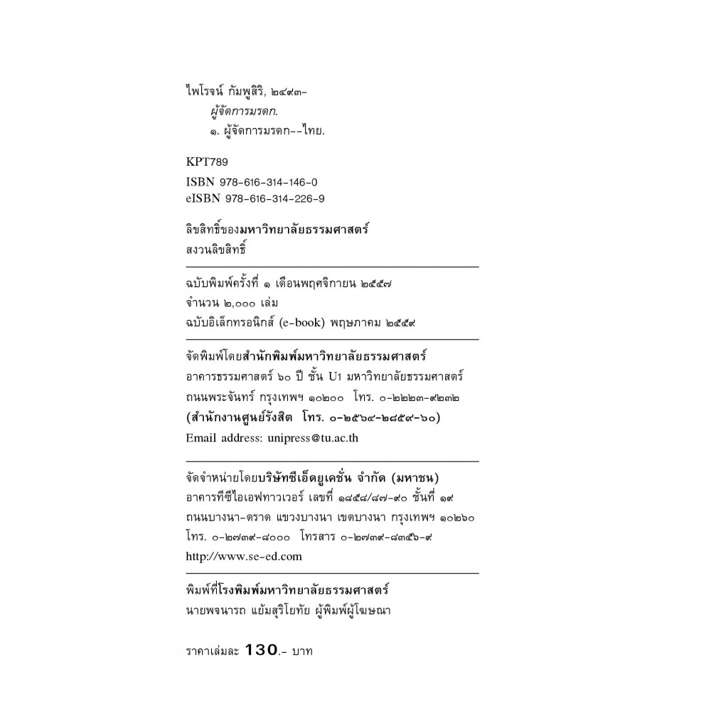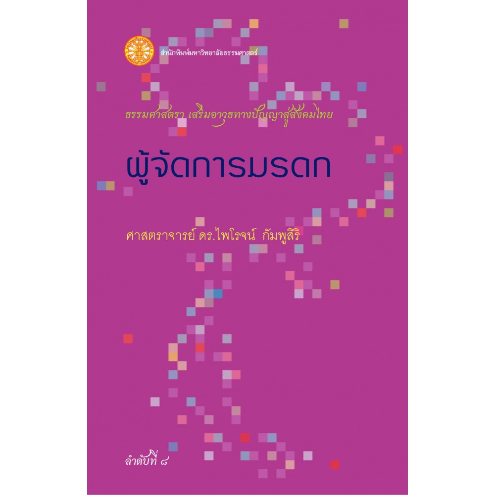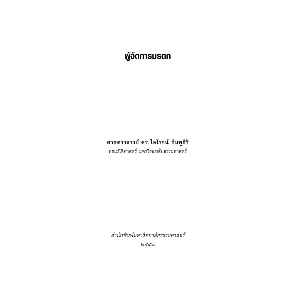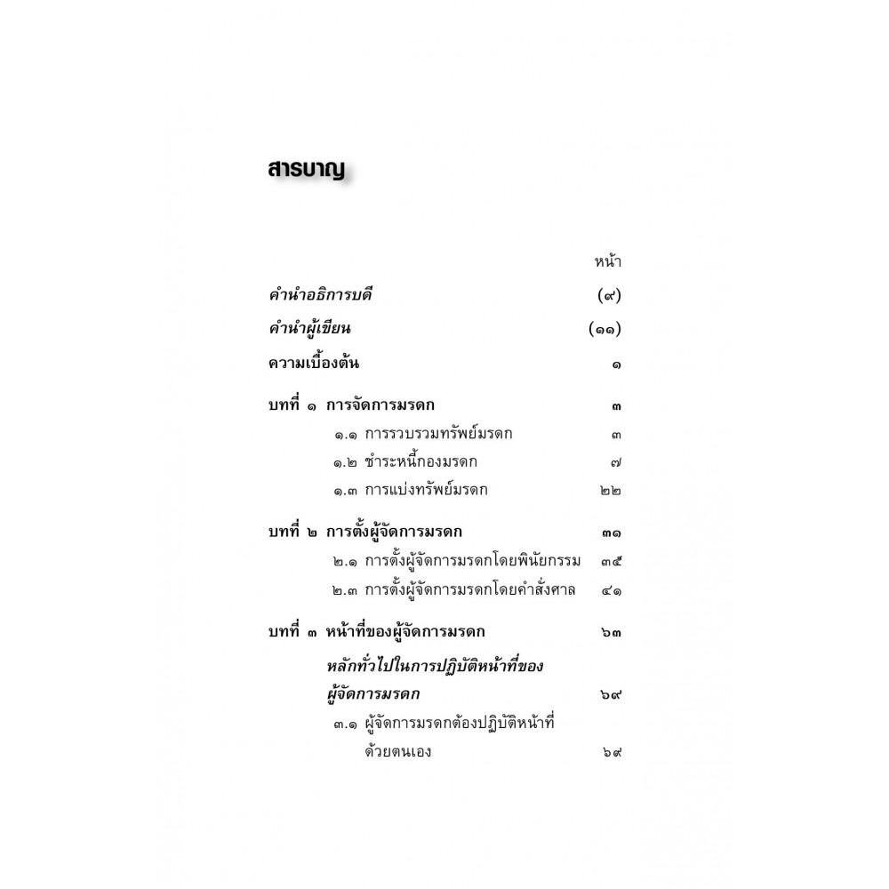ผู้จัดการมรดก เล่มนี้ มุ่งอธิบายการทำงานของผู้จัดการมรดก ตั้งแต่เสาะหาและรวบรวมทรัพย์สินของผู้ตาย จัดการชำระหนี้มรดก และจัดแบ่งทรัพย์มรดกให้แก่ผู้รับพินัยกรรม ตลอดจนทายาทโดยธรรม เนื้อหากะทัดรัด เหมาะสำหรับนักศึกษา ผู้ประกอบวิชาชีพกฎหมาย และประชาชนผู้สนใจทุกท่าน