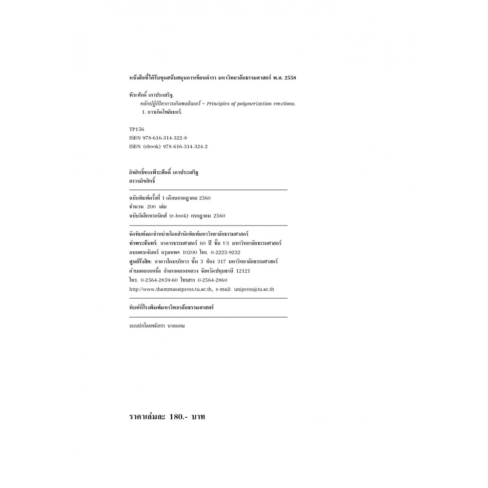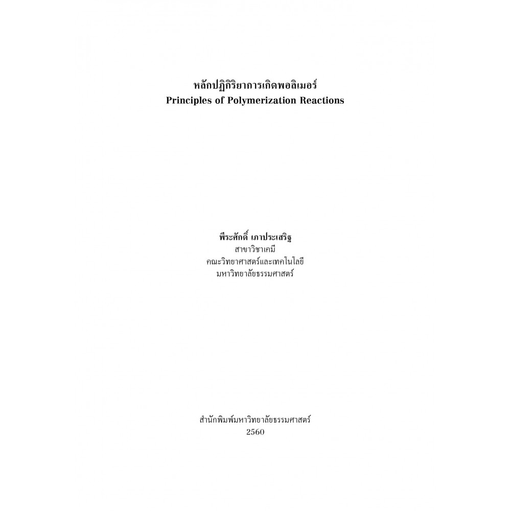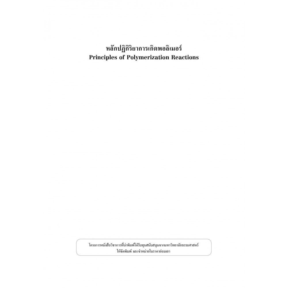 เป็นตำราที่อธิบายถึงความรู้เบื้องต้นเกี่ยวกับพอลิเมอร์ และรวบรวมหลักการเกิดพอลิเมอร์ประเภทต่างๆ เช่น ปฏิกิริยาการเกิดพอลิเมอร์แบบขั้น, แบบควบคุม, แบบโคออร์ดิเนชัน, แบบร่วม เป็นต้น รวมถึงการสังเคราะห์พอลิเมอร์ มีการสอดแทรกแบบฝึกหัดเพื่อให้ได้ฝึกคิดวิเคราะห์โจทย์ปัญหาและมีเฉลยประกอบไว้ท้ายเล่ม สารบัญ บทที่ 1 ความรู้เบื้องต้นเกี่ยวกับพอลิเมอร์ บทที่ 2 ปฏิกิริยาการเกิดพอลิเมอร์แบบขั้น บทที่ 3 ปฏิกิริยาการเกิดพอลิเมอร์ด้วยอนุมูลอิสระ บทที่ 4 ปฏิกิริยาการเกิดพอลิเมอร์ด้วยอนุมูลอิสระแบบควบคุม บทที่ 5 ปฏิกิริยาการเกิดพอลิเมอร์ด้วยไอออน บทที่ 6 ปฏิกิริยาการเกิดพอลิเมอร์แบบโคออร์ดิเนชัน บทที่ 7 ปฏิกิริยาการเกิดพอลิเมอร์แบบเปิดวง บทที่ 8 ปฏิกิริยาการเกิดพอลิเมอร์ร่วม บทที่ 9 เทคนิคการสังเคราะห์พอลิเมอร์ บทที่ 10 พอลิเมอร์ที่สำคัญ