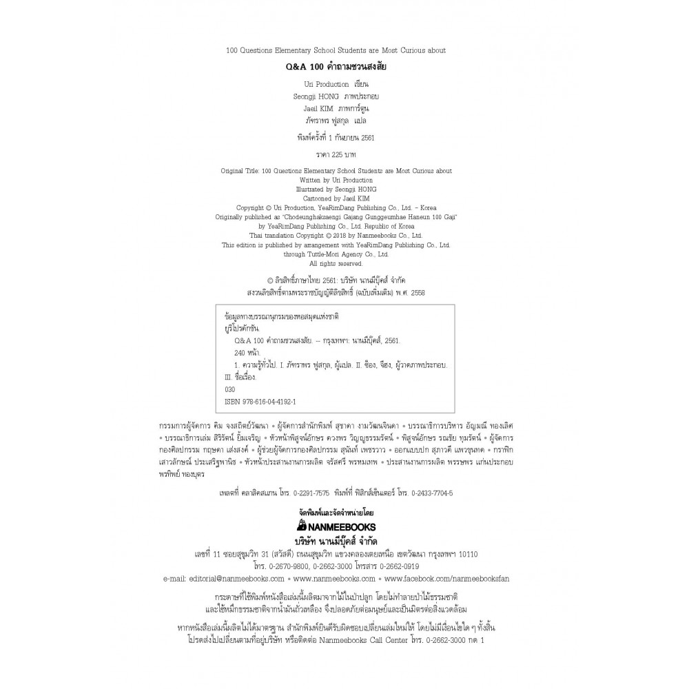 Q & A 100 คำถามชวนสงสัย :ชุด 100 คำถาม รวบรวมหลากหลายคำถามที่เด็ก ๆ สนใจและอยากรู้คำตอบ ไม่ว่าจะเป็นด้าน วิทยาศาสตร์ เช่น ทำไมมีฟองฟู่เมื่อเทน้ำยาฆ่าเชื้อใส่แผล ,สังคมศาสตร์ เช่น มีกฎหมายเกี่ยวกับการอนุรักษ์พืชหรือไม่ ,ประวัติศาสตร์ เช่น สงครามโลกครั้งที่ 2 ส่งผลต่อไทยอย่างไร และความรู้ทั่วไป เช่น ข้อมูลในอินเทอร์เน็ตมาจากไหน และอื่น ๆ อีกมากมาย ไขข้อข้องใจด้วยคำอธิบายง่าย ๆ และภาพประกอบ 4 สี สวยงาม ช่วยเปิดโลกความรู้ให้กว้างขึ้น สามารถนำไปใช้ประโยชน์ทั้งในการเรียน และการดำเนินชีวิตประจำวัน