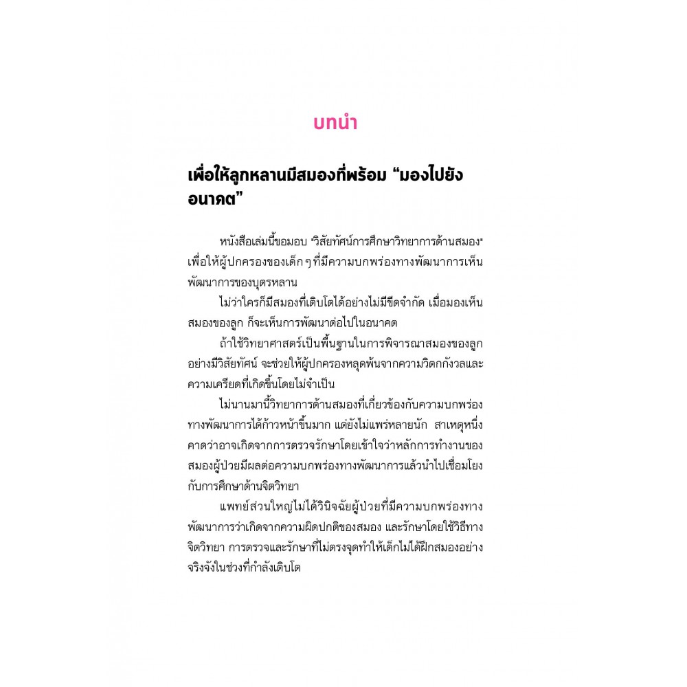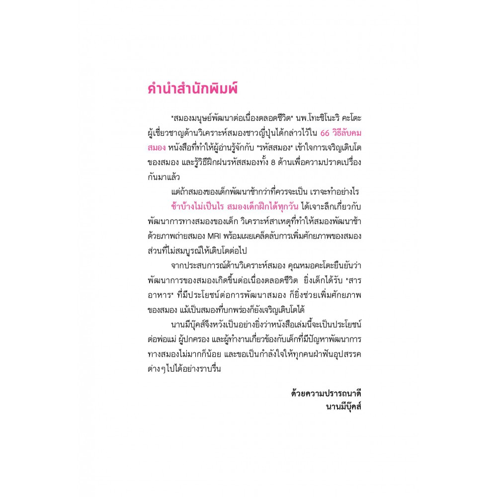 พ่อแม่ผู้ปกครองที่คิดว่าบุตรหลานอาจมีความบกพร่องทางพัฒนาการ คุณครูหรือเจ้าหน้าที่ที่คอยดูแลเด็กๆในสถานศึกษาหรือสถานพยาบาล หรือกระทั่งผู้ใหญ่ที่กังวลว่าตนอาจมีพัฒนาการผิดปกติบางด้านก็นำหนังสือ "ช้าบ้างไม่เป็นไร สมองเด็กฝึกได้ทุกวัน" เล่มนี้ไปปรับใช้ได้ เพื่อไม่ให้ความบกพร่องทางพัฒนาการสร้างปัญหาในการใช้ชีวิตร่วมกับผู้อื่น ในเล่มอธิบายถึงพัฒนาการของสมองตั้งแต่ขั้นประกอบเป็นรูปร่าง สร้างโครงข่ายประสาท และหน้าที่ของแต่ละพื้นที่ในสมองหรือที่เรียกว่า “รหัสสมอง” ผู้อ่านจะได้เข้าใจกระบวนการการเติบโตของสมองในแต่ละช่วงวัย รู้วิธีสังเกตพฤติกรรมของบุตรหลานในเบื้องต้น รวมถึงรู้จักลักษณะเฉพาะของความบกพร่องทางพัฒนาการที่สัมพันธ์กับความผิดปกติทางสมอง เพื่อเตรียมความพร้อมสำหรับวางแผนการเลี้ยงดู แผนการรักษา ตลอดจนแผนการศึกษาที่เหมาะสม ก่อนปิดท้ายด้วยกิจกรรมสนุกๆ ซึ่งถือเป็นสารอาหารสำคัญสำหรับการเจริญเติบโตของสมอง ไม่เว้นแม้แต่กับสมองที่มีความบกพร่องทางพัฒนาการ