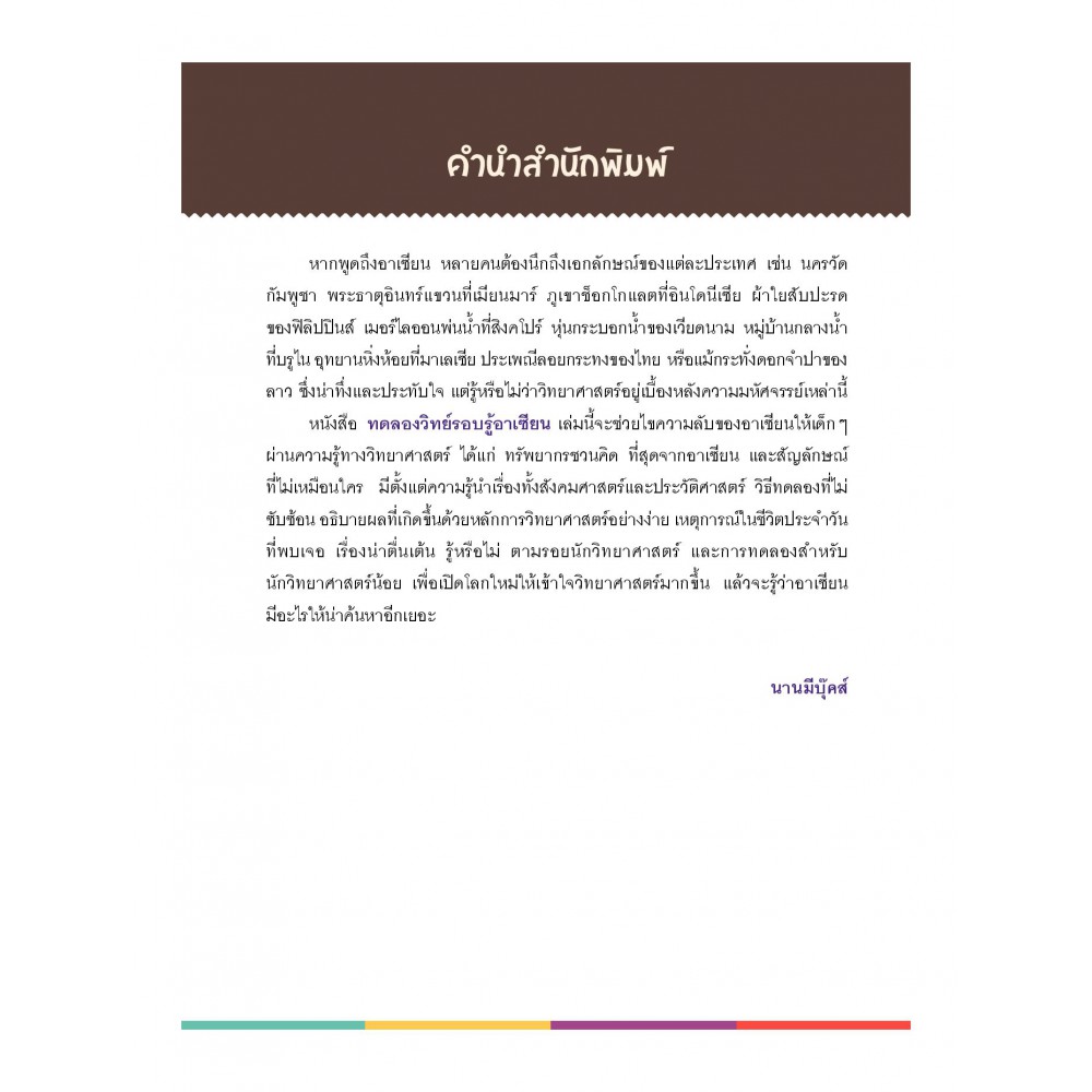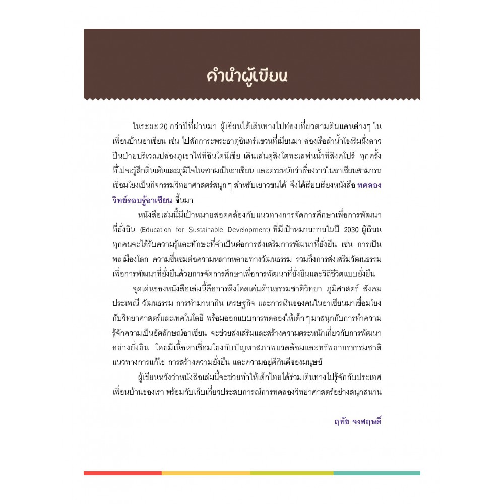 หนังสือ "ทดลองวิทย์รอบรู้อาเซียน" เหมาะสำหรับผู้อ่านทุกวัย โดยเฉพาะเยาวชนที่สนใจในวิทยาศาสตร์ และวัฒนธรรมอาเซียน ผ่านการทดลองวิทยาศาสตร์หลากหลาย โดยหนังสือเล่มนี้ไม่เพียงแต่เปิดโอกาสให้ผู้อ่านได้เรียนรู้เกี่ยวกับเอกลักษณ์ของแต่ละประเทศในอาเซียนเท่านั้น แต่ยังช่วยให้เข้าใจหลักการทางวิทยาศาสตร์ที่อยู่เบื้องหลังการทดลองได้อย่างง่ายดาย นอกจากนี้ยังส่งเสริมการศึกษาแบบบูรณาการ (STEM Education) และการศึกษาเพื่อการพัฒนาที่ยั่งยืน (ESD) ซึ่งสอดคล้องกับเป้าหมายของการศึกษาในยุคปัจจุบัน