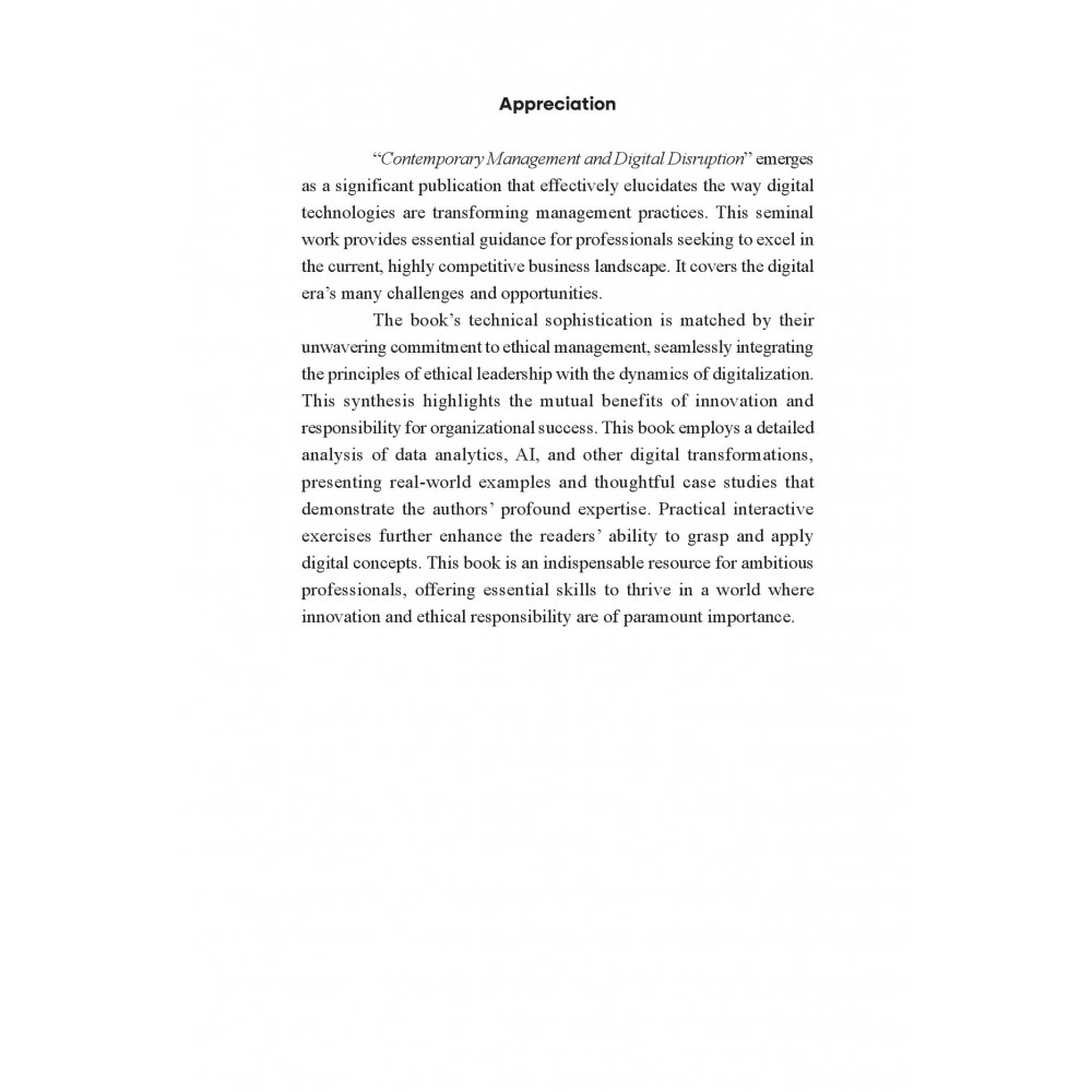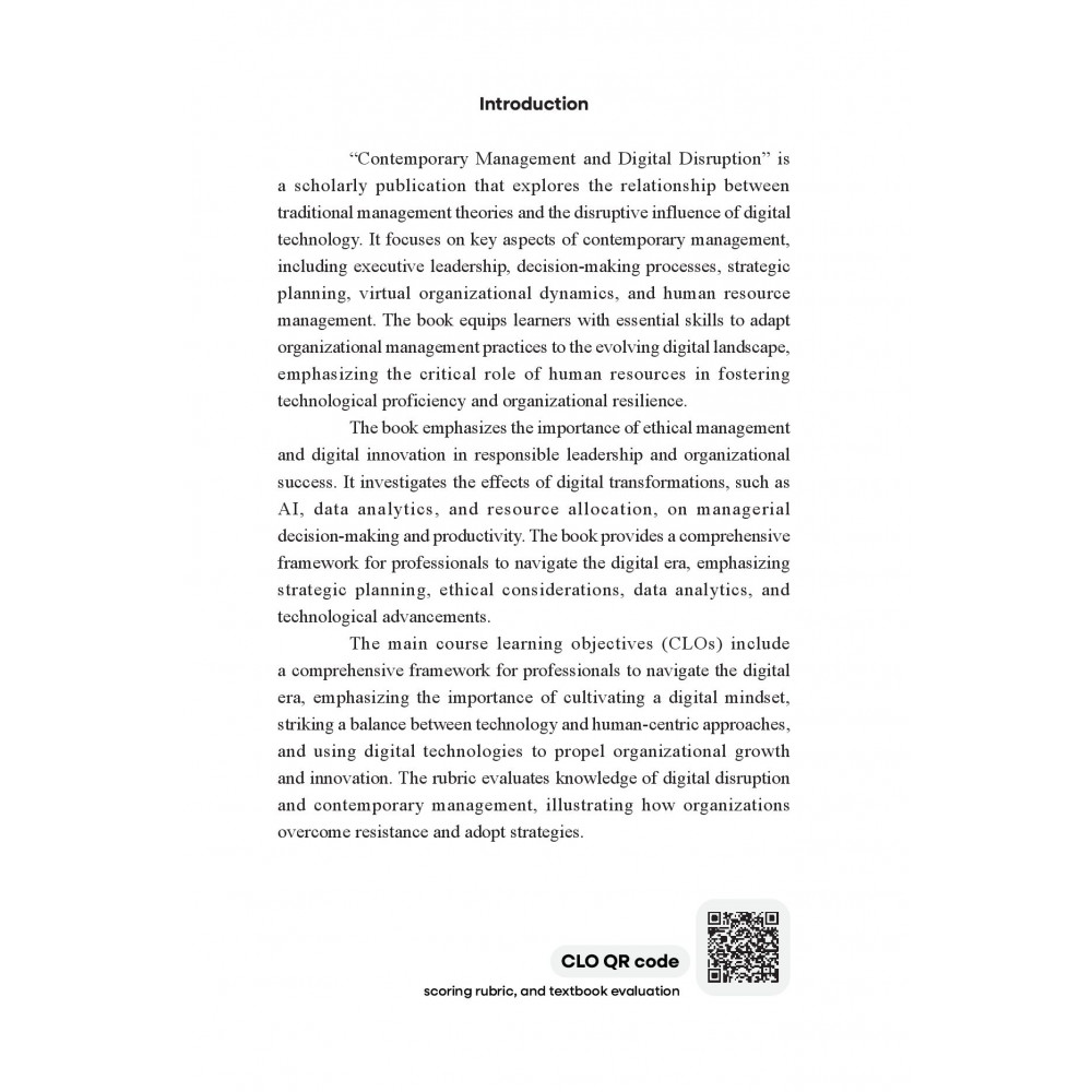 In an era characterized by rapid technological advancement, the key to success lies in the integration of contemporary management practices and digital innovation. This textbook examines innovative strategies that effectively synthesize these elements and provides guidance to assist students in achieving optimal efficiency and adaptability. It explores the most recent theoretical frameworks and empirical insights that will enable organizations to effectively navigate the challenges of digital disruption, ensuring long-term viability and adaptability in a dynamic business environment. This text aims to cultivate the capacity for effective leadership in fostering adaptability and anticipation in the digital age.
