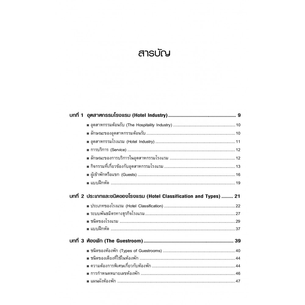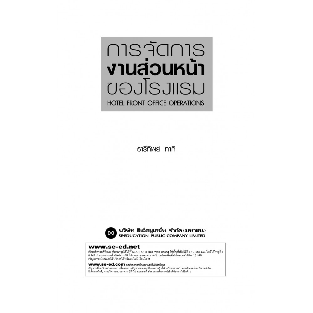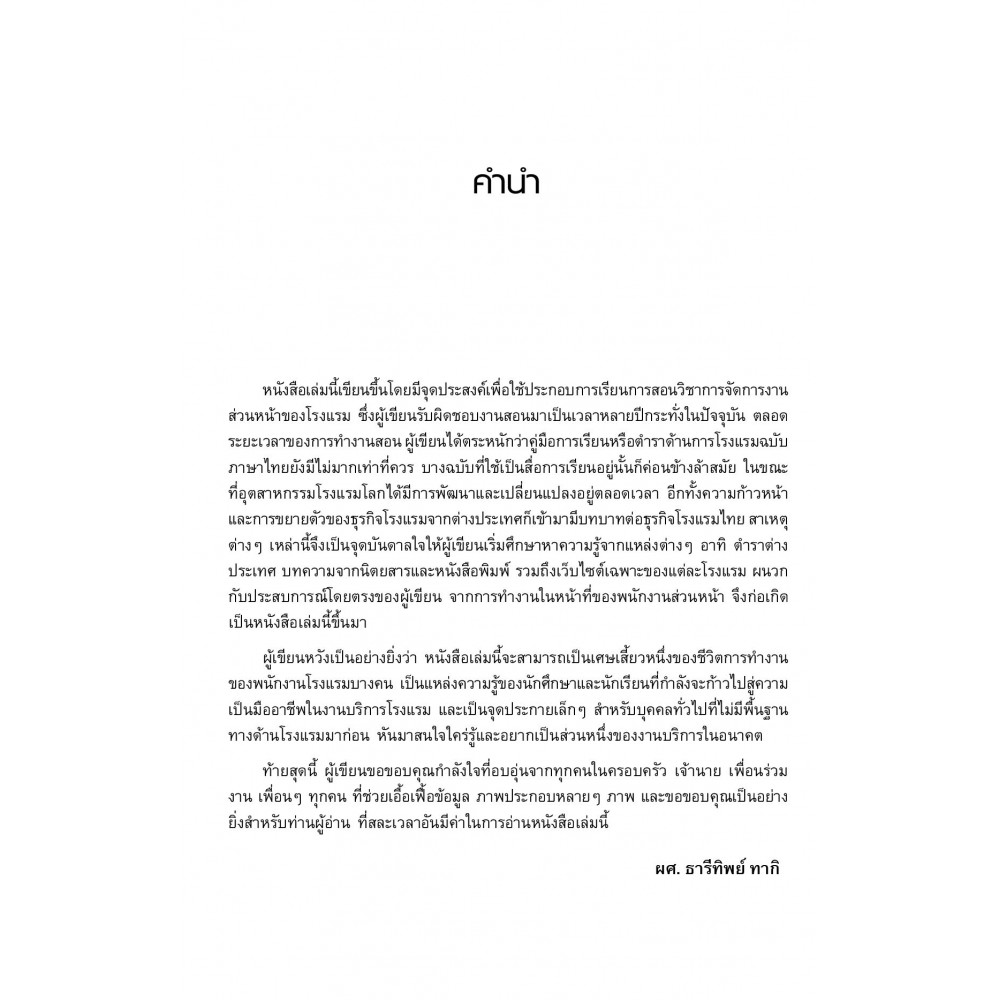 รวมหลักการจัดการและการปฏิบัติงานในขอบข่ายของงานการบริการส่วนหน้า อีกทั้งยังคลอบคลุมเนื้อหาอื่นๆ ที่เกี่ยวข้องกับงานโรงแรมเอาไว้ในรูปของบทเรียนพรอบรูปประกอบ เพื่อให้ผู้อ่านได้รับความรู้ ความเข้าใจ และเห็นถึงความสำคัญของงานบริการสส่วนหน้า ตั้งแต่ขั้นตอนแรกกระทั่งขั้นตอนสุดท้าย