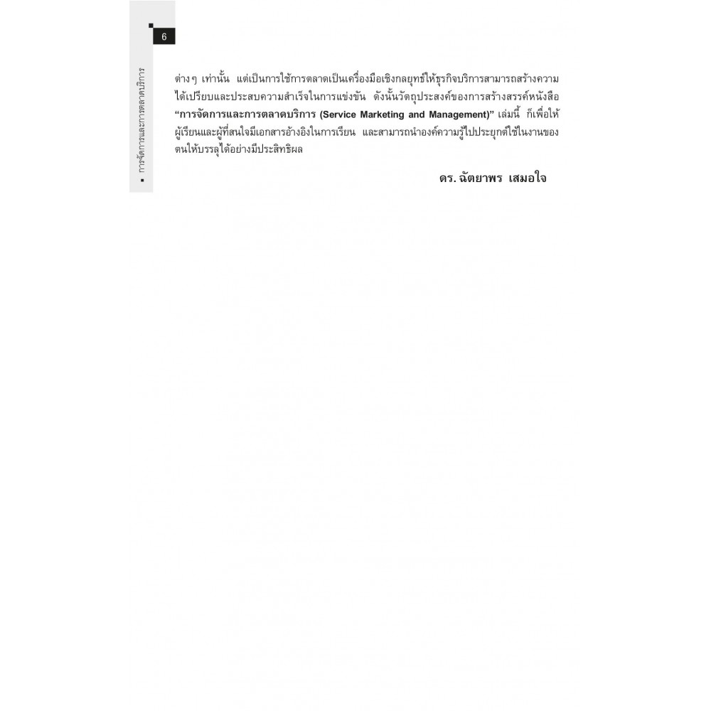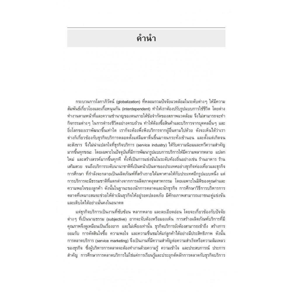 ความสำคัญต่อความสำเร็จหรือความล้มเหลวของธุรกิจซึ่งผู้บริหารการตลาดจะต้องทำงานด้วยความรู้ ความเข้าใจ และประสบการณ์ประการสำคัญ การศึกษาการตลาดบริการไม่ใช่แค่การเรียนรู้และประยุกต์หลักการตลาดกับธุรกิจประการต่างๆ เท่านั้น วัตถุประสงค์สำคัญของการสร้างสรรค์หนังสือเล่มนี้ ไม่เพียงแค่ต้องการให้เป็นตำราด้านการบริหารการตลาดสำหรับธุรกิจและนำไปปรับใช้ในการบริหารและการพัฒนากลยุทธ์การตลาดสำหรับธุรกิจบริการทุกประเภทได้จริง
