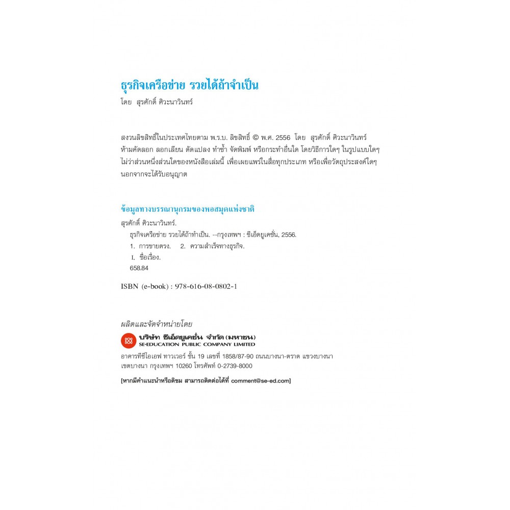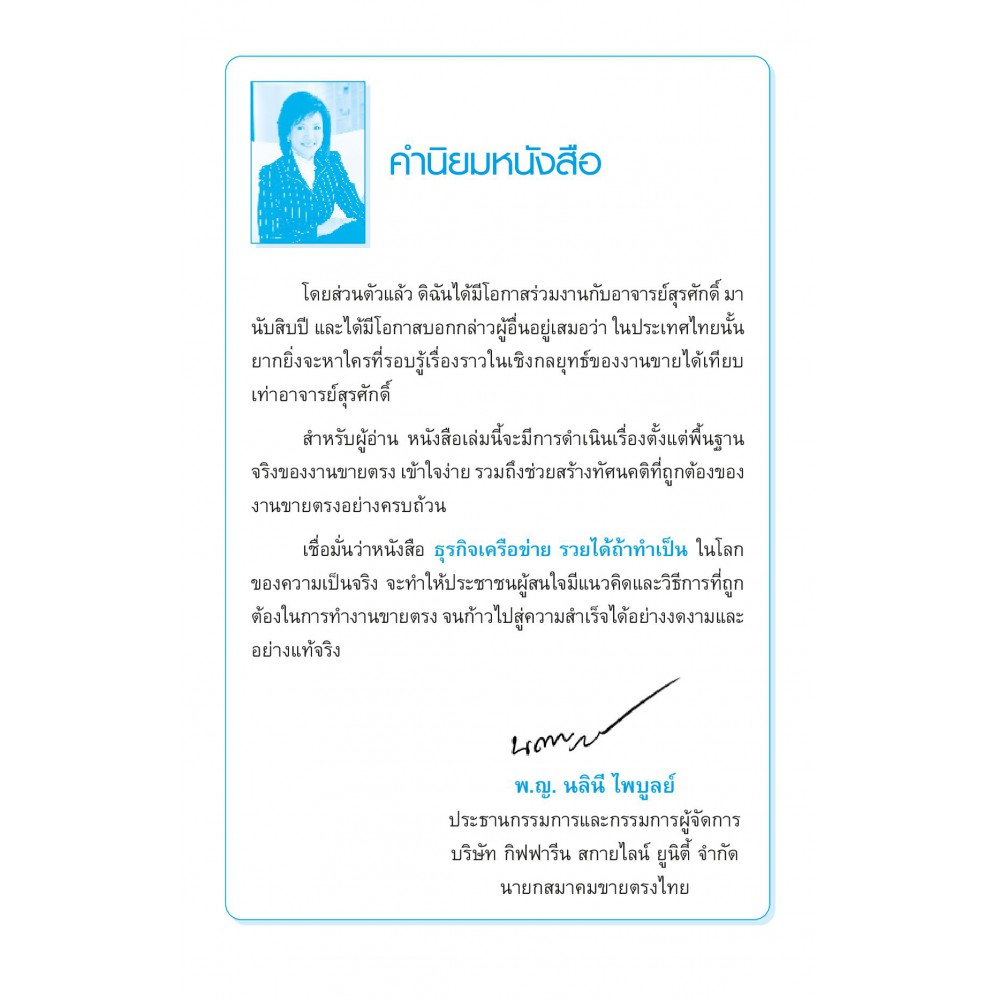 เผยแนวทางการสร้างความสำเร็จในธุรกิจเครือข่ายแบบไทยๆ บนโลกของความเป็นจริง พร้อมลูกล่อลูกชนในการพัฒนาสายงานที่มีนิสัยแบบไทยๆ ถ่ายทอดจากประสบการณ์ตรงของผู้เขียนและจากคำบอกเล่าของนักธุรกิจขายตรง รวมถึงการตอบคำถามและให้คำปรึกษากับคนที่ทำงานในภาคสนาม
