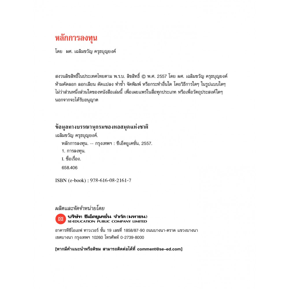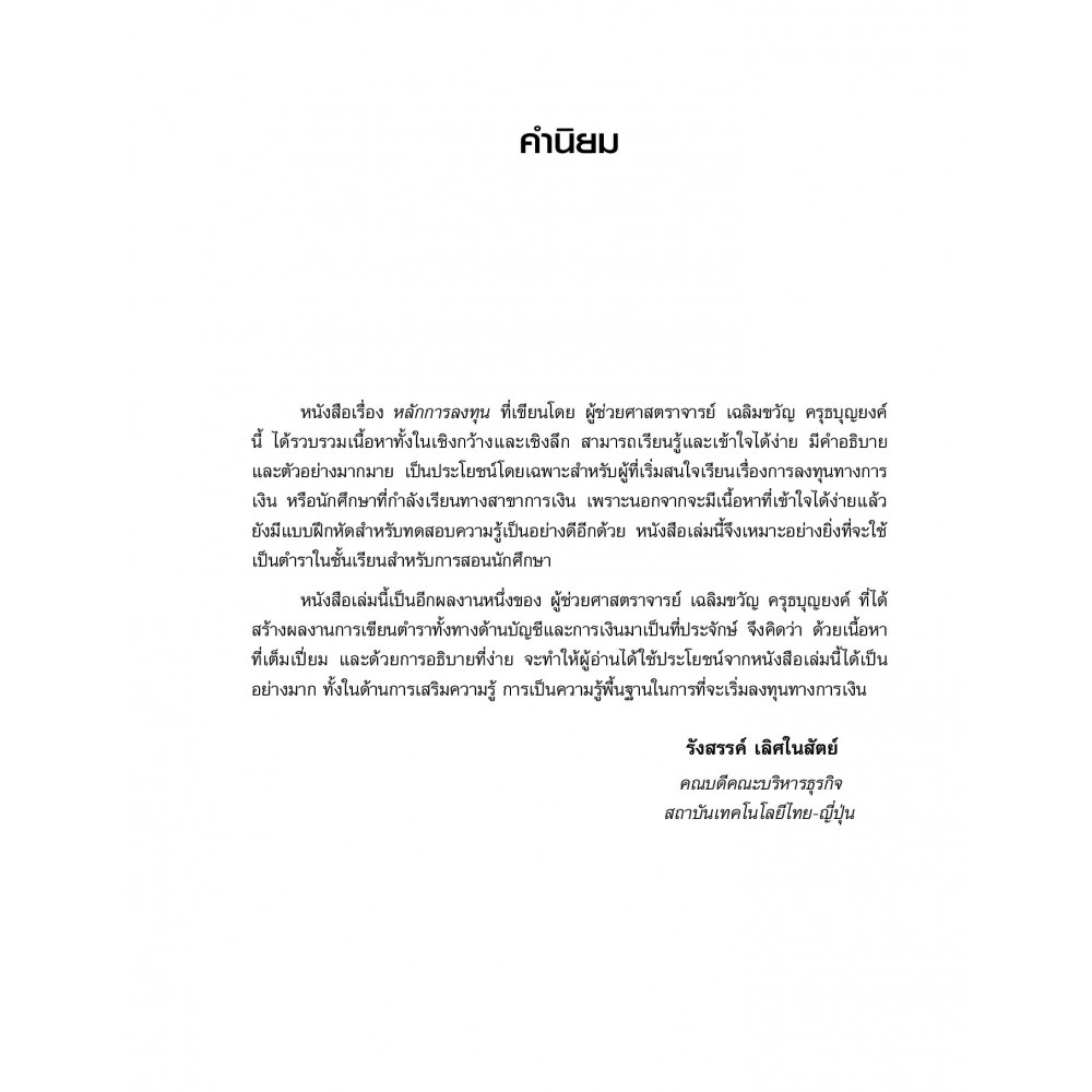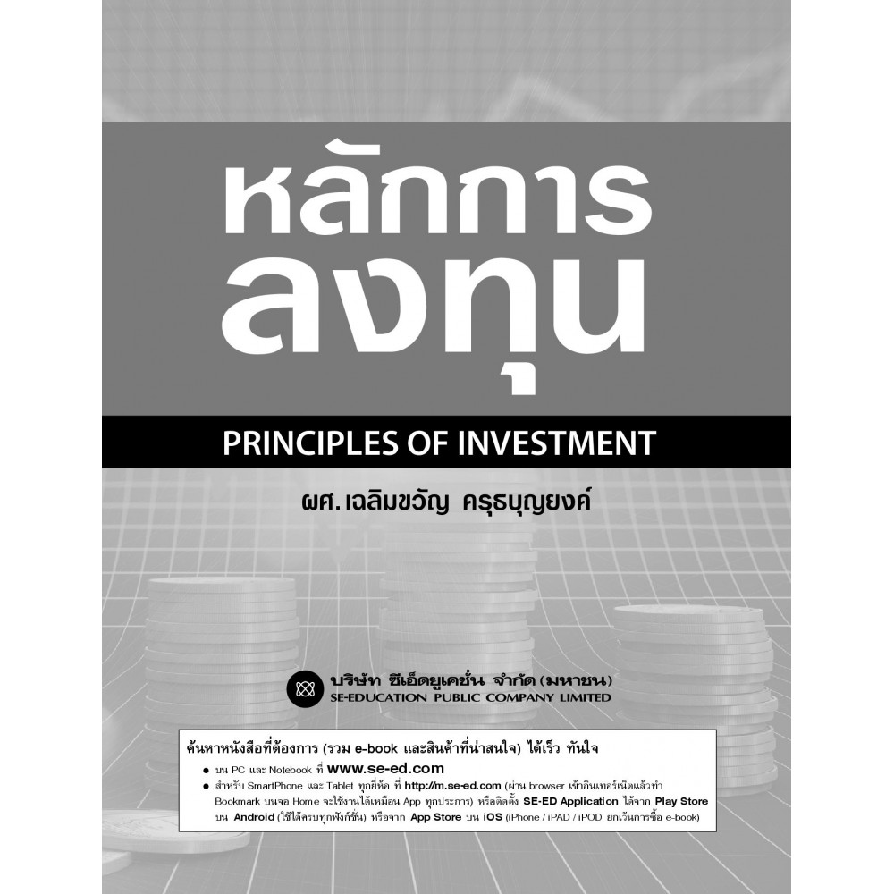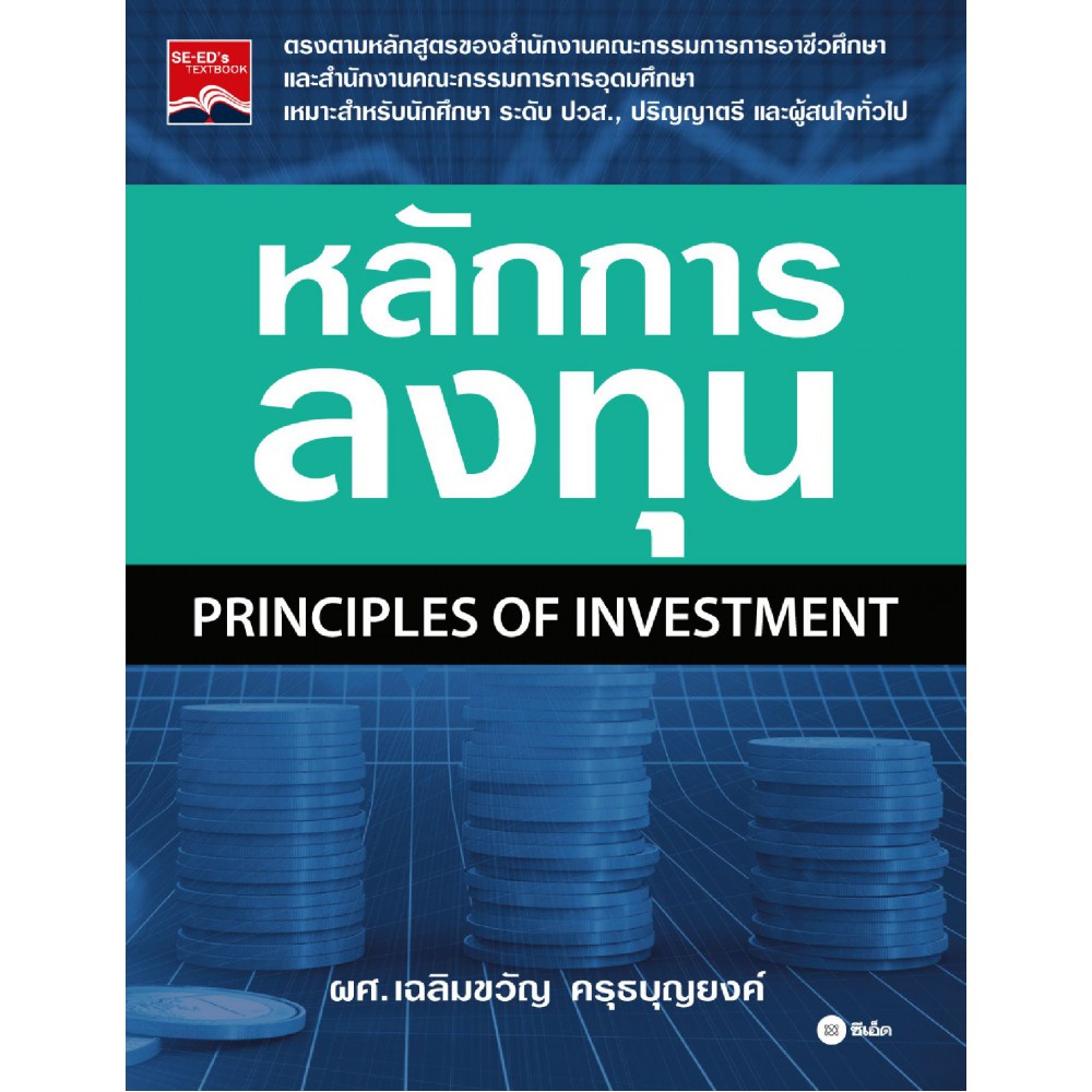 หลักการลงทุน (Principle Investment) เป็นหนังสือที่เรียบเรียงขึ้น โดยมีเนื้อหาที่สำคัญประกอบด้วย หลักและนโยบายการลงทุนเบื้องต้น ตลาดหลักทรัพย์ ตลาดหลักทรัพย์ใหม่ ตลาดหลักทรัพย์แห่งประเทศไทย การคำนวณดัชนีราคาหุ้นในตลาดหลักทรัพย์ ลักษณะของหลักทรัพย์ ลักษณะของหุ้นกู้ หุ้นสามัญ หุ้นบุริมสิทธิ ตลอดจนอธิบายถึงสิทธิในการซื้อขายหุ้น การวิเคราะห์ผลตอบแทนและความเสี่ยงในการลงทุน เครื่องมือในการวิเคราะห์ความเสี่ยง รวมทั้งเทคนิคขั้นตอนในการวิเคราะห์บริษัท วิเคราะห์อุตสาหกรรมและวิเคราะห์เศรษฐกิจ เป็นหนังสือซึ่งมีเทคนิคการนำเสนอที่เข้าใจง่าย ผู้อ่านสามารถประยุกต์ใช้กับการทำงานในชีวิตประจำวันได้จริง เหมาะสำหรับนักศึกษาระดับ ปวส., ปริญญาตรี, ปริญญาโท และผู้สนใจทางด้านหลักการและนโยบายในการลงทุน โดยเนื้อหาครอบคลุมหลักสูตรของคณะกรรมการอาชีวศึกษา และสำนักงานคณะกรรมการการอุดมศึกษา กระทรวงศึกษาธิการ