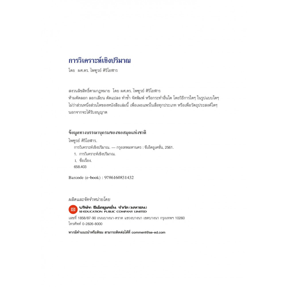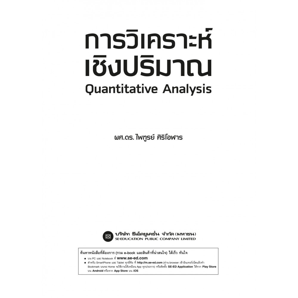 การวิเคราะห์เชิงปริมาณ เล่มนี้ จัดทำขึ้นเพื่อให้นักศึกษาในหลายๆ คณะ ได้แก่ คณะบริหารธุรกิจ คณะเศรษฐศาสตร์ รวมถึงนักศึกษาหรือผู้สนใจศึกษาด้านวิชาการวิจัยการดำเนินงานในคณะวิทยาศาสตร์ และวิศวกรรมศาสตร์ ได้ใช้ประกอบการเรียนการสอน โดยเนื้อหาประกอบด้วยเรื่องการโปรแกรมเชิงเส้นตรง ปัญหาการขนส่ง ปัญหาการมอบหมายงาน ตัวแบบโครงข่าย การโปรแกรมเชิงพลวัต การพยากรณ์เชิงปริมาณ ปริมาณการสั่งซื้อที่ประหยัด ตัวแบบมาร์คอฟ ปัญหาการเดินทางของพนักงานขาย และตัวแบบแถวคอย เป็นต้น
