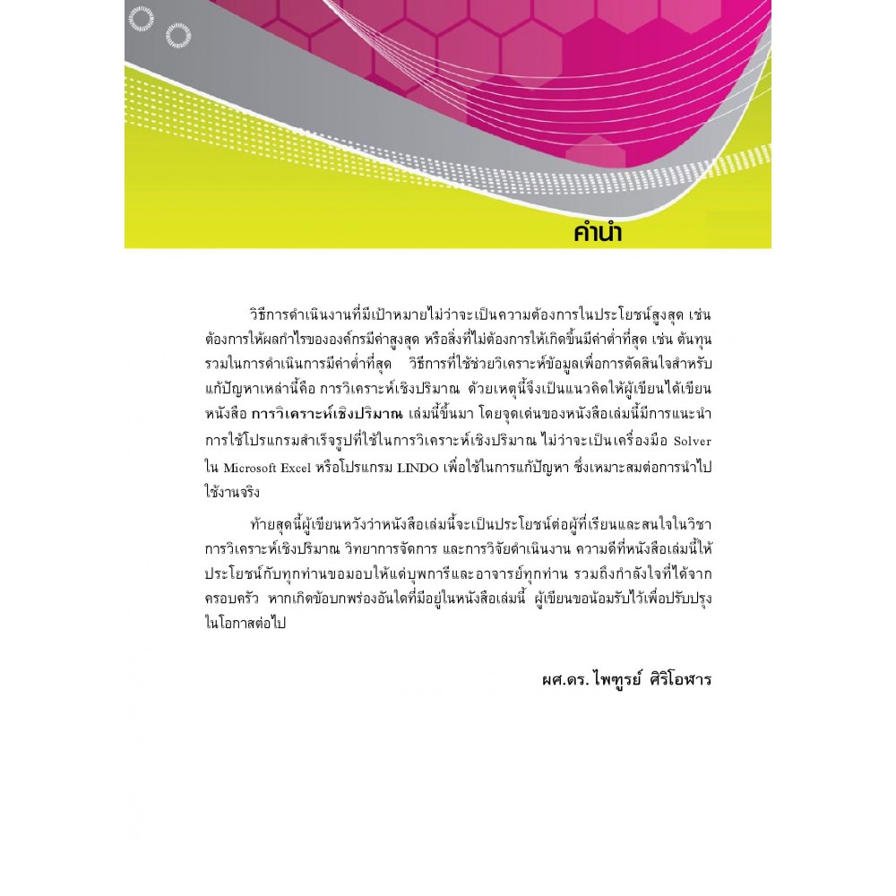 หนังสือเล่มนี้ ยังแนะนำการใช้โปรแกรมสำเร็จรูปในการประมวลผลเพื่อหาผลลัพธ์และคำตอบ เนื้อหาทุกบทมีตัวอย่างประกอบพร้อมแบบฝึกหัดให้นักศึกษาหรือผู้สนใจได้ศึกษา จึงเหมาะอย่างยิ่งที่จะนำไปใช้ประกอบการเรียนการสอนในวิชา การวิเคราะห์เชิงปริมาณ หรือวิชาการวิจัยการดำเนินงานได้ต่อไป