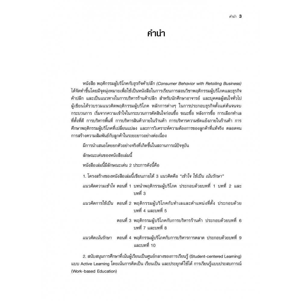 พฤติกรรมผู้บริโภคกับธุรกิจค้าปลีก เป็นหนังสือในการเรียนการสอนวิชาพฤติกรรมผู้บริโภคและธุรกิจค้าปลีก และเป็นแนวทางในการบริหารร้านค้าปลีก สำหรับนักศึกษา อาจารย์และบุคคลผู้สนใจทั่วไป โดยรวบรวมแนวคิดพฤติกรรมผู้บริโภค หลักการต่างๆ ในการประกอบธุรกิจตั้งแต่ต้นน้ำจนถึงปลายน้ำ เริ่มจากความเข้าใจในกระบวนการตัดสินใจก่อนซื้อ ขณะซื้อ หลังการซื้อ การเลือกทำเลที่ตั้งที่ดี การบริหารพื้นที่และการบริหารสินค้าภายในร้านค้า การบริหารความขัดแย้งภายในร้านค้า รวมถึงการศึกษาพฤติกรรมผู้บริโภคที่เปลี่ยนแปลง การวิเคราะห์ความต้องการของลูกค้าที่แท้จริง ตลอดจนการสร้างความสัมพันธ์กับลูกค้าในระยะยาวอย่างต่อเนื่อง