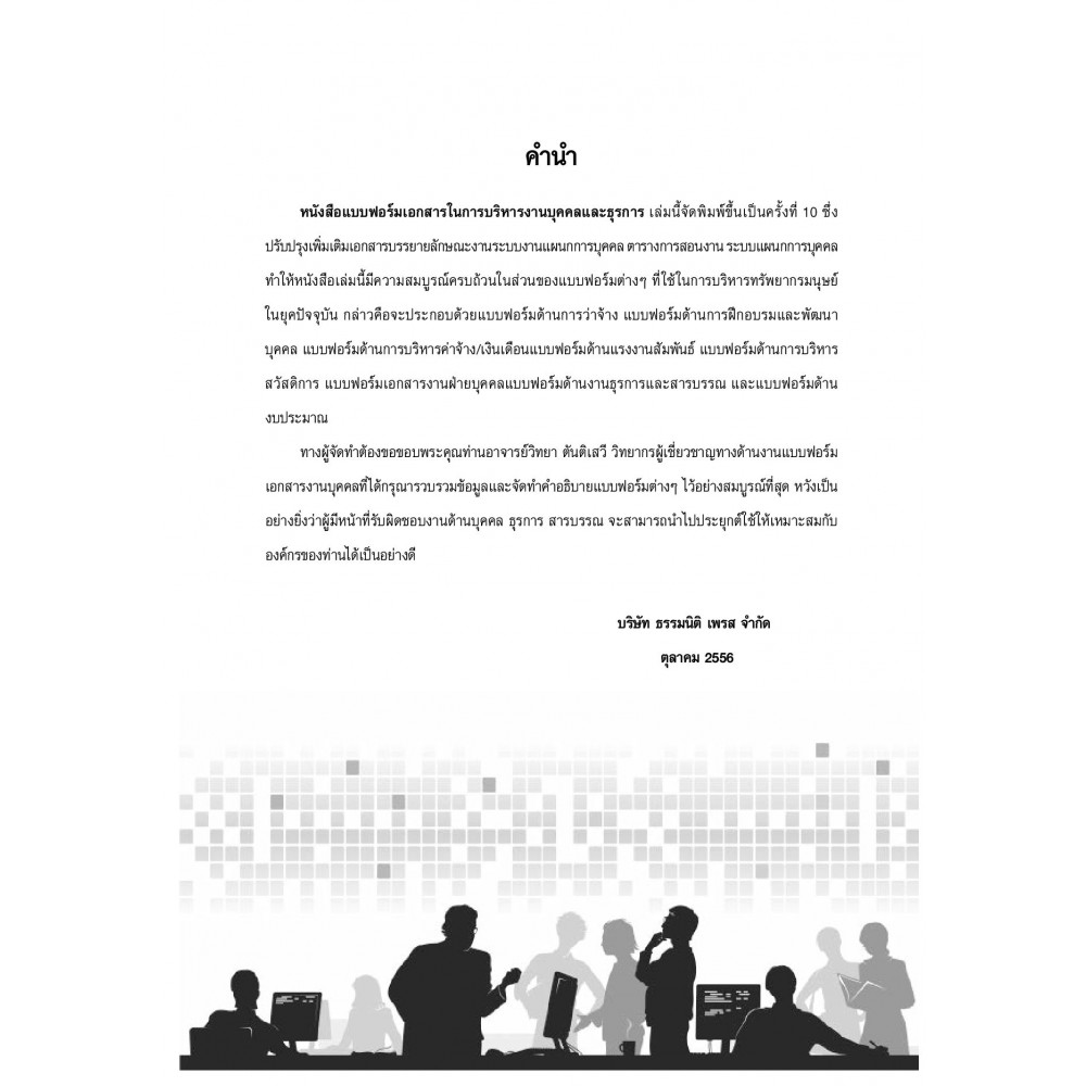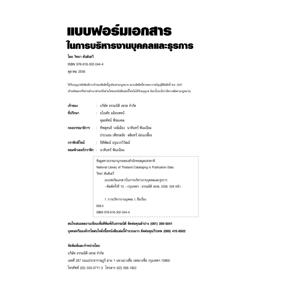 แบบฟอร์มเอกสารในการบริหารงานบุคคลและธุรการ เล่มนี้จัดพิมพ์ขึ้นเป็นครั้งที่ 10 ซึ่งปรับปรุงเพิ่มเติมเอกสารบรรยายลักษณะงานระบบงานแผนกการบุคคล ตารางการสอนงาน ระบบแผนกการบุคคล ทำให้หนังสือเล่มนี้มีความสมบูรณ์ครบถ้วนในส่วนของแบบฟอร์มต่างๆ ที่ใช้ในการบริหารทรัพยากรมนุษย์ในยุคปัจจุบัน กล่าวคือจะประกอบด้วยแบบฟอร์มด้านการว่าจ้าง แบบฟอร์มด้านการฝึกอบรมและพัฒนาบุคคล แบบฟอร์มด้านการบริหารค่าจ้าง/เงินเดือน แบบฟอร์มด้านแรงงานสัมพันธ์ แบบฟอร์มด้านการบริหารสวัสดิการ แบบฟอร์มเอกสารฝ่ายบุคคล แบบฟอร์มด้านงานธุรการและสารบรรณ และแบบฟอร์มด้านงบประมาณ