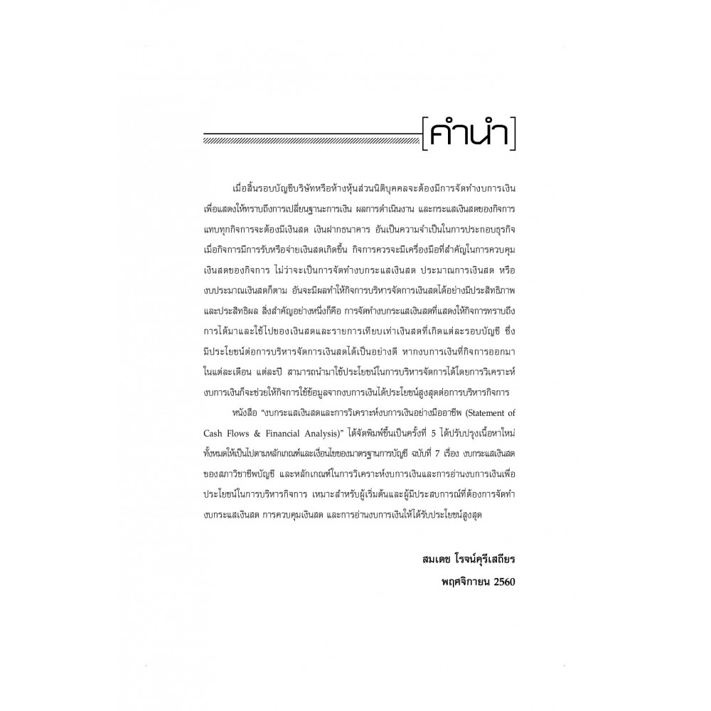 เมื่อสิ้นรอบระยะเวลาบัญชี บริษัทหรือห้างหุ้นส่วนนิติบุคคลจะต้องจัดทำงบการเงินเพื่อแสดงฐานะการเงิน ผลการดำเนินงาน และการเปลี่ยนแปลงในเงินสดของกิจการ โดยการจัดทำงบดุล งบกำไรขาดทุน และงบกระแสเงินสด โดยเฉพาะการจัดทำงบกระแสเงินสด (Statement of Cash Flows) ถือเป็นส่วนหนึ่งของงบการเงินที่นอกเหนือจากการที่กิจการจะต้องจัดทำงบกำไร ขาดทุนและงบดุลแล้ว การจัดทำงบกระแสเงินสดเป็นการแสดงการได้มาและจ่ายไปในเงินสดของกิจการที่จะ ทำให้นักบัญชีหรือผู้บริหารได้ทราบถึงการเปลี่ยนแปลงในเงินสด ไม่ว่าจะเป็นกระแสเงินสดรับหรือกระแสเงินสดจ่ายในหนึ่งรอบระยะเวลาบัญชีที่ ผ่านมา เพื่อนำผลที่ได้จากการทำงบกระแสเงินสดไปวางแผนจัดการเงินสดของกิจการจากอดีต ปัจจุบัน และอนาคต หนังสือ งบกระแสเงินสด มองเงินสดอย่างมืออาชีพ (Statement of Cash Flows) จัดพิมพ์ขึ้นเป้นครั้งที่ 4