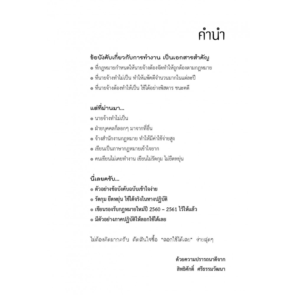 ข้อบังคับเกี่ยวกันการทำงานเป็นเอกสารสำคัญที่กฎหมายได้กำหนดให้นายจ้างจัดทำให้ถูกต้องตามากฎหมายที่นายจ้างทำไม่เป็นทำให้แพ้คดีจำนวนมากในแต่ละปีที่นายจ้างต้องทำให้เป็นใช้ได้อย่างพิสดารชนะคดีแต่ที่ผ่านมานายจ้างทำไม่เป็นฝ่ายบุคคลก็ลอกๆมาจากที่อื่นจ้างสสำนักงานกฎหมายทำให้มีค่าใช้จ่ายสูงเขียนเป็นภาษากฎหมายได้เข้าใจยากคนเขียนไม่เคยทำงานเขียนไม่รัดกุมไม่ยืดหยุ่นนีี่เลยครับตัวอย่างข้อบังคับฉบับเข้าใจง่ายรัดกุมยืดหยุ่นใช้ได้จริงในทางปฏิบัติเขียนรองรับกฎหมายใหม่ปี2560-2561ไว้ให้แล้วมีตัวอย่างภาคปฏิบัติให้ลอกใช้ได้เลยไม่ต้องคิดมากครับตัดสินใจซื้อลอกใช้ได้เลยง่ายสุดๆ