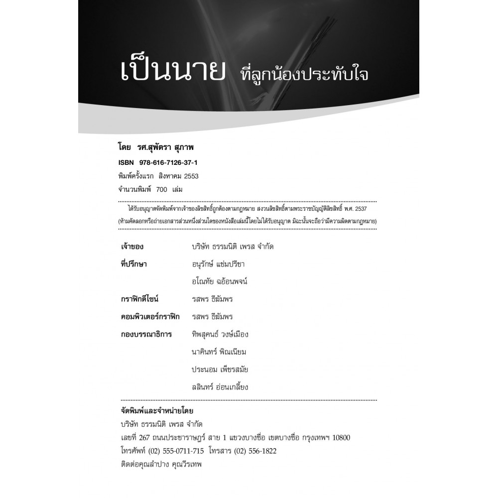 ว่าด้วยการเป็นนาย ที่ลูกน้องประทับใจ เป็นกลยุทธ์ในการบริหารลูกน้องยุคใหม่ให้ทำงานด้วยใจในด้านต่างๆ ให้คนรักองค์กร รักงาน รักนาย การทำงานเป็นทีม มีนุษย์สัมพันธ์ หรือช่วยสอน สั่ง มอบงานอย่างมีคุณภาพ