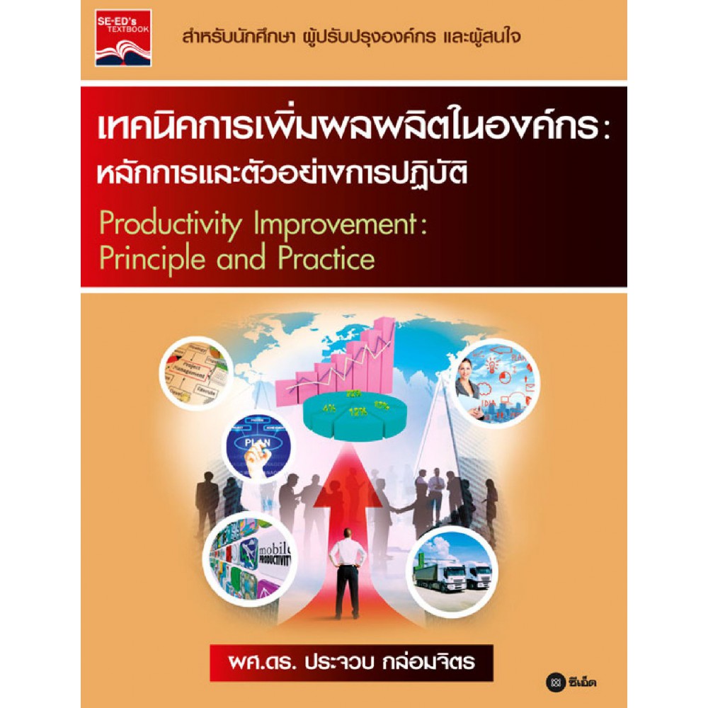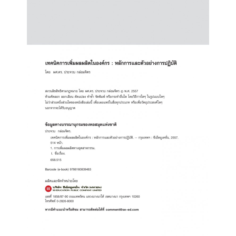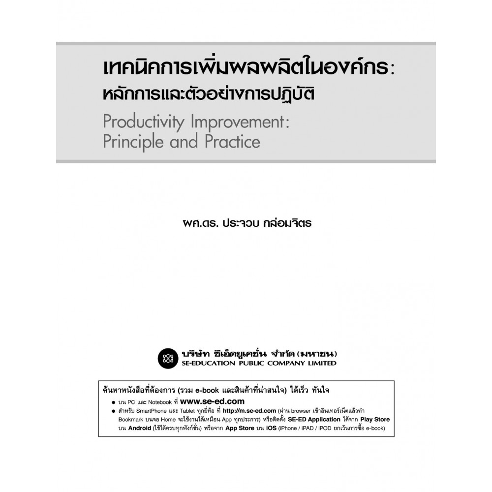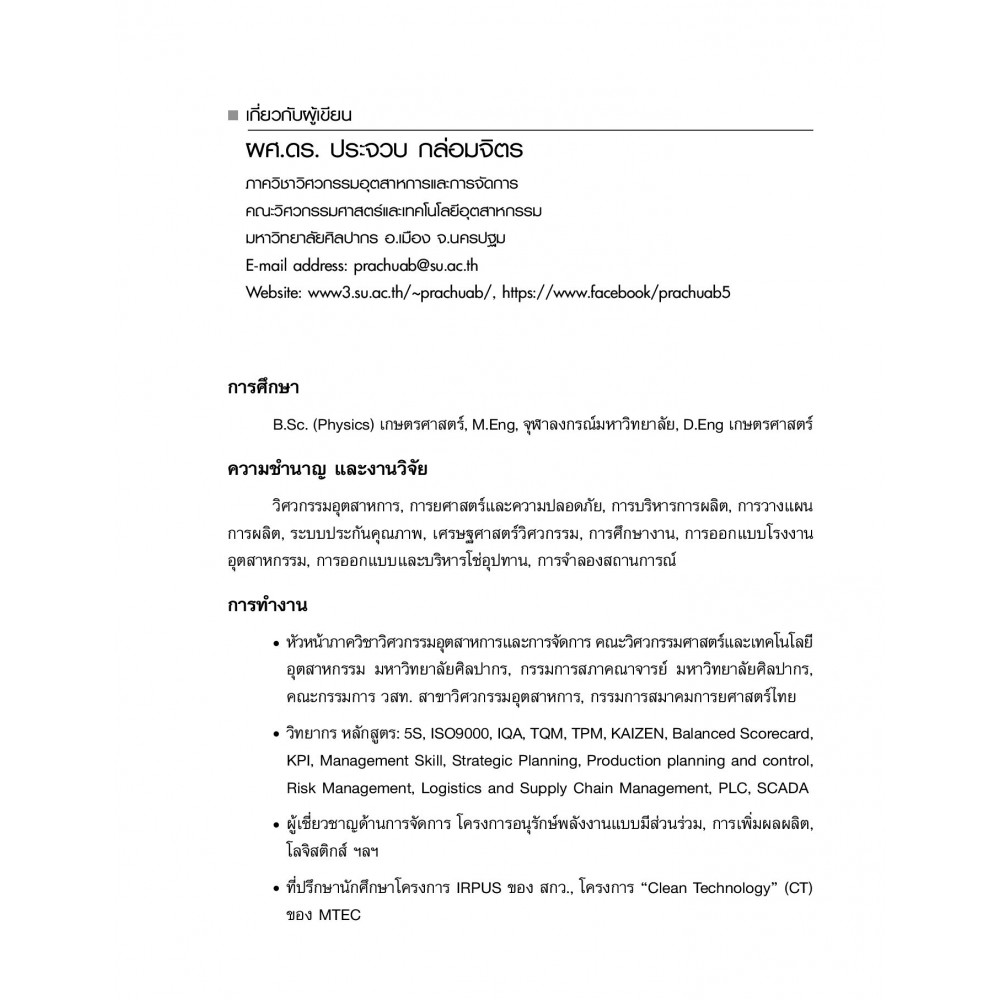เทคนิคการเพิ่มผลผลิตในองค์กร : หลักการและตัวอย่างการปฏิบัติ หลักการจัดการ การบริหารเชิงกลยุทธ์และการวางแผนปฏิบัติการ บริหารกลยุทธ์ด้วย KPI และ Balance Score Card หลักบริหารสำหรับหัวหน้างาน การทำงานเป็นทีม การแก้ปัญหาและปรับปรุงงานอย่างเป็นระบบ การบำรุงรักษา ผู้เขียน ผศ.ดร. ประจวบ กล่อมจิตร "เทคนิคการเพิ่มผลผลิตในองค์กร : หลักการและตัวอย่างการปฏิบัติ" เล่มนี้ ได้รวบรวมเทคนิคที่สำคัญในการจัดการและปรับปรุงงานของกิจการในปัจจุบัน ที่ได้มีการจัดฝึกอบรมสัมมนาและให้คำปรึกษากับหน่วยงานต่างๆ ซึ่งประกอบด้วยหลักการที่ทันสมัยและตัวอย่างที่นำไปปฏิบัติจริงโดยสรุป เพื่อให้การประกอบกิจการดำเนินได้อย่างมีประสิทธิภาพ ตอบสนองความต้องการของของทุกภาคส่วน ไม่ว่าจะเป็นหลักการจัดการ การบริหารเชิงกลยุทธ์และการวางแผนปฏิบัติการ บริหารกลยุทธ์ด้วย KPI และ Balance Score Card หลักบริหารสำหรับหัวหน้างาน การทำงานเป็นทีม การแก้ปัญหาและปรับปรุงงานอย่างเป็นระบบ การบริหารความเสี่ยงและภัยพิบัติ การจัดการนวัตกรรม การลดความสูญเสียโดยแนวคิดลีน (Lean) การบำรุงรักษาและ TPM เบื้องต้น Total Quality Management (TQM) เบื้องต้น QC 7 Tools ความสามารถของกระบวนการ การวางแผนและควบคุมการผลิต การจัดการโลจิสติกส์และโซ่อุปทาน กิจกรรม 5ส และ Visual Control การปรับปรุงผลิตภาพด้วย IE Techniques การยศาสตร์ (Ergonomics) สำหรับปรับปรุงสภาพการทำงาน การจัดการพลังงาน พร้อมตัวอย่างการปรับปรุงและวิเคราะห์งานจริง สารบัญ บทที่ 1 บทนำ บทที่ 2 หลักการจัดการ การบริหารเชิงกลยุทธ์ และการวางแผนปฏิบัติการ บทที่ 3 บริหารกลยุทธ์ด้วย KPI และ Balance Scorecard บทที่ 4 หลักบริหารสำหรับหัวหน้างาน บทที่ 5 การทำงานเป็นทีม บทที่ 6 การแก้ปัญหาและปรับปรุงงานอย่างเป็นระบบ บทที่ 7 การบริหารความเสี่ยงและภัยพิบัติ บทที่ 8 การจัดการนวัตกรรม บทที่ 9 การลดความสูญเสียโดยแนวคิดลีน (Lean) บทที่ 10 การบำรุงรักษาและ TPM เบื้องต้น ฯลฯ