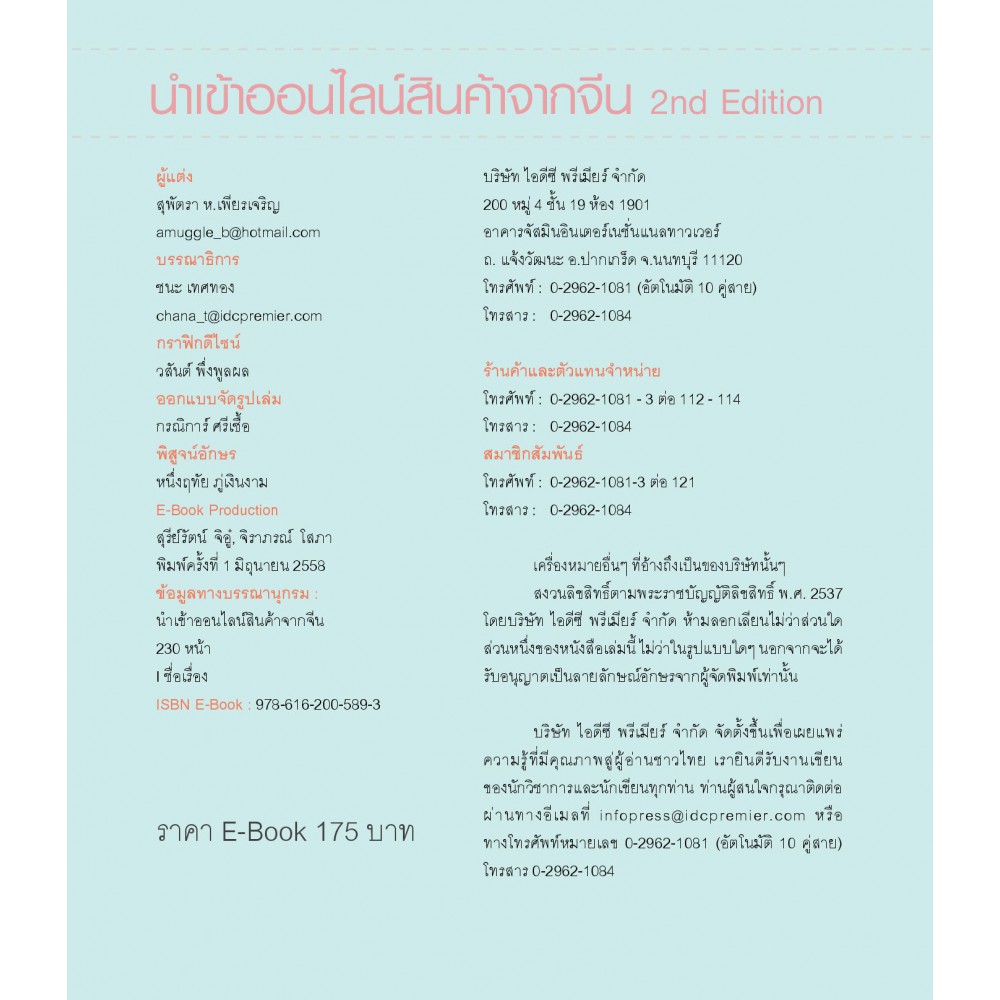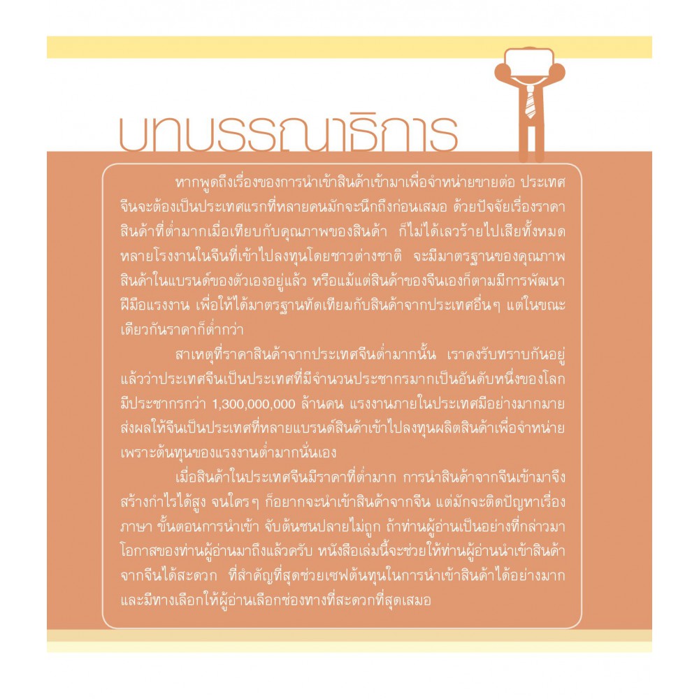 หนังสือ "นำเข้าออนไลน์สินค้าจากจีน 2nd Edition" เล่มนี้ ได้รวบรวมเเหล่งของสินค้าที่มีราคาถูกสุดๆ สำหรับผู้ที่สนใจ โดยจะมีขั้นตอนการสั่งซื้อจากเว็บไซต์ออนไลน์ชั้นนำของประเทศจีน เเละขั้นตอนการนำเข้าที่สะดวกที่สุด อีกทั้งยังมีกระบวนการที่ทำให้ประหยัดต้นทุนที่สุด รวมถึงเทคนิคต่างๆ ที่ใช้ในการนำเข้า ขนสินค้า แปลภาษา เพื่อเจรจาเรื่องราคา การคืนสินค้า การขอเงินคืน และอื่นๆ อีกมากมายที่เกี่ยวข้อง โดยในเล่มอธิบายด้วยเทคนิค Step by Step แบบหนังสือคอมพิวเตอร์ ที่ผู้อ่านสามารถทำตามได้ง่าย และใช้ได้จริง!