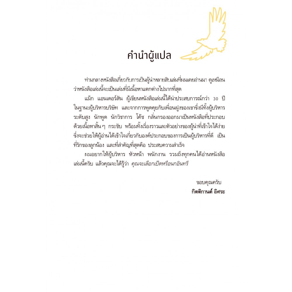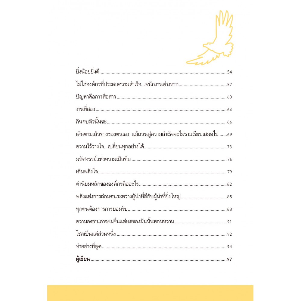 ผู้เขียนได้นำประสบการณ์กว่า 30 ปีในฐานะผู้บริหาร และจากการพูดคุยกับเพื่อนฝูง ซึ่งมีทั้งผู้บริหารระดับสูง นักพูด นักวิชาการ โค้ช มากลั่นกรองเรียบเรียงเป็นหนังสือเล่มนี้ ที่ประกอบด้วยบทความ 29 บท บทละ 1-3 หน้า ด้วยเนื้อหาที่สั้น กระชับ ได้ใจความ พร้อมยกตัวอย่างเรื่องราวการบริหารและจิตวิทยาองค์กรของผู้นำที่ประสบความสำเร็จประกอบในแต่ละบทความ