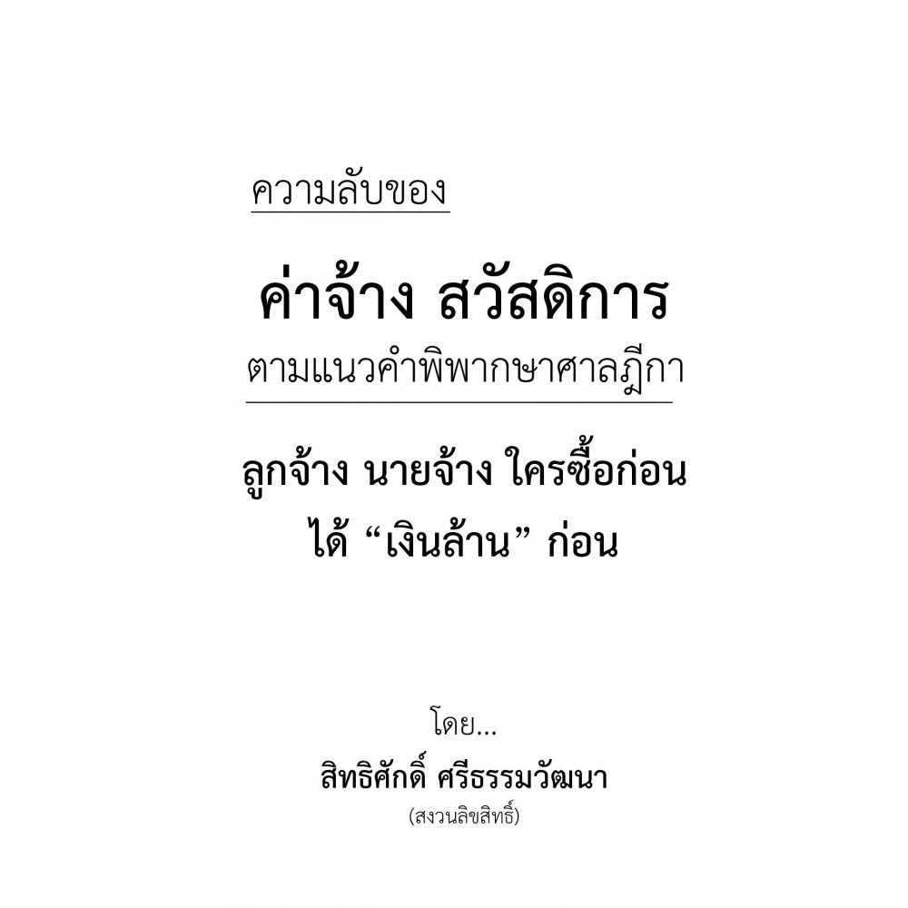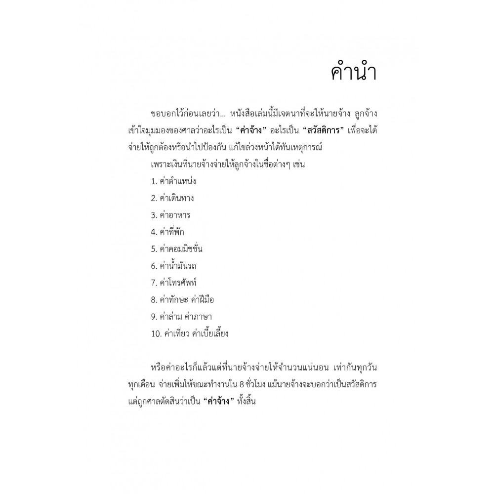 หนังสือเล่มนี้มีเจตนาที่จะให้นายจ้าง ลูกจ้าง เข้าใจมุมมองของศาลว่าอะไรเป็น “ค่าจ้าง” อะไรเป็น “สวัสดิการ” เพื่อจะได้จ่ายให้ถูกต้องหรือนำไปป้องกัน แก้ไขล่วงหน้าได้ทันเหตุการณ์ ค่าใช้จ่าย หรืออะไรก็แล้วแต่ที่นายจ้างจ่ายให้จำนวนแน่นอน เท่ากันทุกวัน ทุกเดือน จ่ายเพิ่มให้ขณะทำงานใน 8 ชั่วโมง แม้นายจ้างจะบอกว่าเป็นสวัสดิการ แต่ถูกศาลตัดสินว่าเป็น “ค่าจ้าง” ทั้งสิ้น ๏ ถ้าลูกจ้างซื้อหนังสือเล่มนี้ก่อน รู้ก่อน ไปแจ้งเจ้าหน้าที่แรงงานไปฟ้องศาล ก็จะได้เงินเพิ่มเป็นล้าน…ก่อน