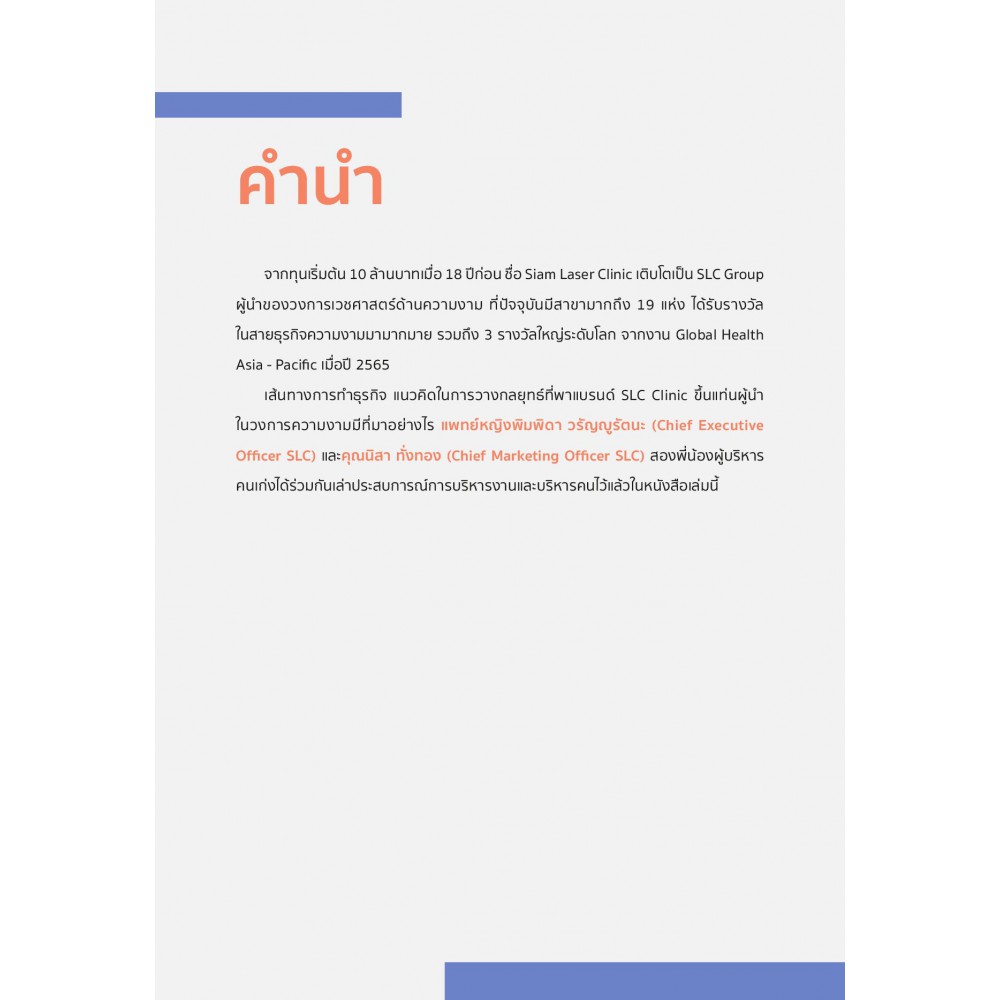 จากการสำรวจของสมาคมศัลยกรรมความงามนานาชาติ หรือ ISAPS พบว่า สหรัฐอเมริกาคือประเทศที่มีการทำศัลยกรรมความงามสูงสุด ส่วนไทยอยู่ในอันดับ 20 ของโลก ในธุรกิจเสริมความงามของไทยมีมูลค่าสูงถึง 14,000 ล้านบาท มีอัตราการเติบโตเฉลี่ยร้อยละ 10 ต่อปี ทำให้เห็นว่าศัลยกรรมเสริมความงามในประเทศไทยได้รับความนิยมมากขึ้นเรื่อยๆ และมีการแข่งขันค่อนข้างสูง การเดินทางที่ผ่านประสบการณ์และเรื่องราวอันเข้มข้น รวมถึงแนวคิดการบริหารงานและบริหารคนในธุรกิจความงามของแพทย์หญิงพิมพิดา วรัญญูรัตนะ (Chief Executive Officer SLC) และคุณนิสา ทั่งทอง (Chief Marketing Officer SLC) สองพี่น้องผู้บริหารคนเก่งของ SLC Group ผู้นำในวงการเวชศาสตร์ด้านความงามมาเกือบ 20 ปี มีสาขาให้บริการถึง 19 แห่ง ได้รับรางวัลในสายธุรกิจความงามมามากมาย รวมถึง 3 รางวัลใหญ่ระดับโลกจากงาน Global Health Asia - Pacific เมื่อปี 2565 การวางกลยุทธ์ที่จะพาแบรนด์ SLC Clinic ขึ้นแท่นผู้นำในวงการเวชศาสตร์ความงามได้สำเร็จเป็นอย่างไร หนังสือเล่มนี้มีคำตอบ