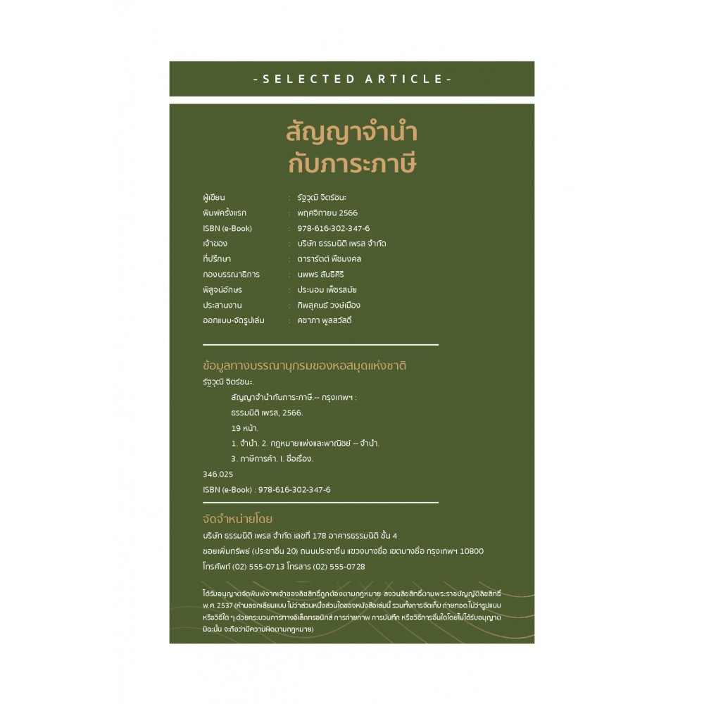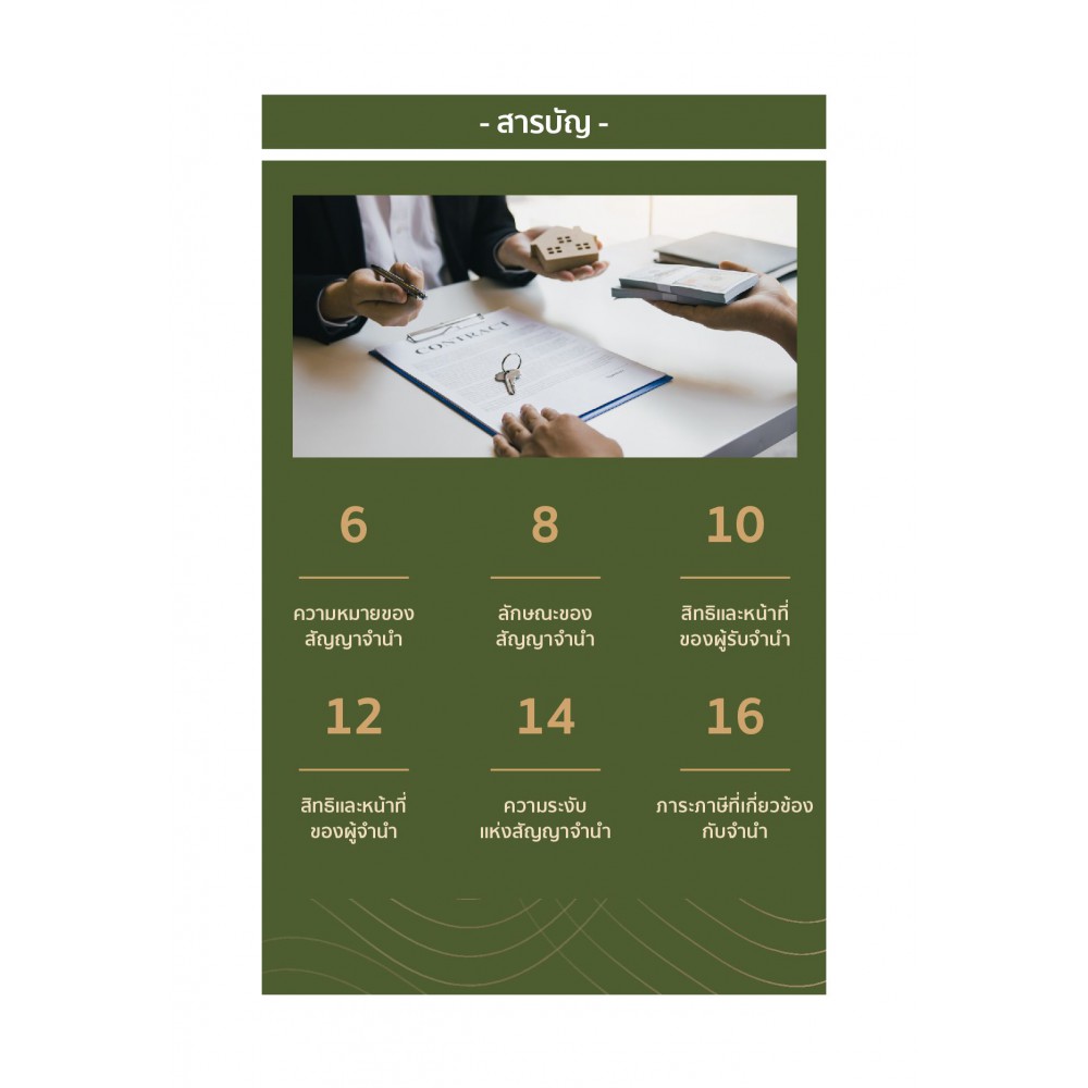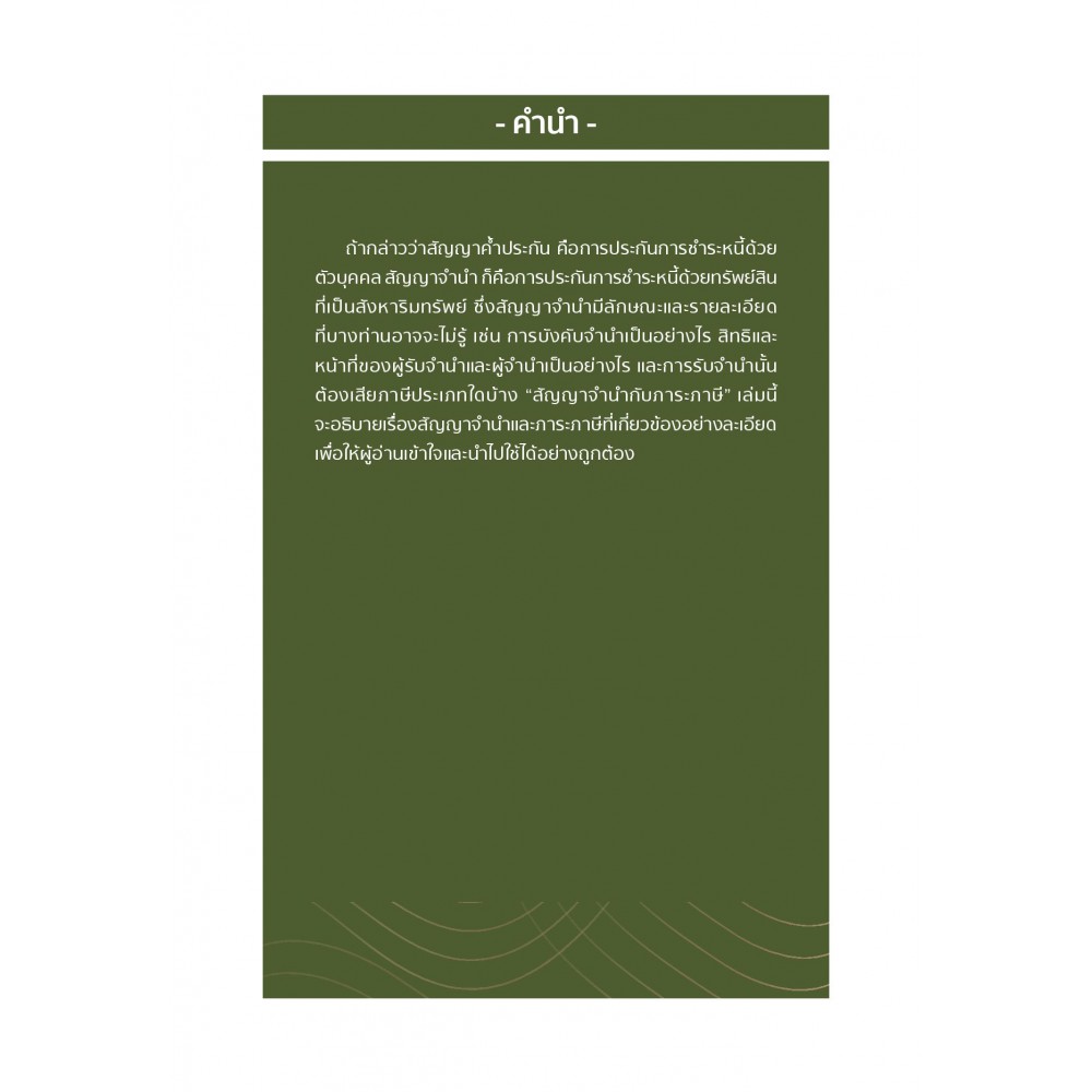 สัญญาจำนำ เป็นสัญญาระหว่างบุคคลที่มีการตกลงกัน คนหนึ่งเรียกว่า “ผู้จำนำ” อีกคนหนึ่งเรียกว่า “ผู้รับจำนำ” โดยผู้จำนำส่งมอบทรัพย์สินที่สามารถเคลื่อนที่ได้ ให้แก่ผู้รับจำนำเพื่อประกันการชำระหนี้ จึงคิดกันเองว่า ไม่มีภาระเกี่ยวพันอื่นใดนอกจากการหาเงินไปชำระหนี้เพื่อไถ่ทรัพย์สินคืนในระยะที่ระบุในสัญญา แต่ที่จริงแล้ว สัญญาจำนำมีรายละเอียดหลายประการที่ควรระวัง ซึ่งหากไม่เข้าใจอาจทำผิดพลาดจนเกิดความเสียหาย “สัญญาจำนำกับภาระภาษี” เล่มนี้จะอธิบายเรื่องสัญญาจำนำและภาระภาษีในประเด็นสำคัญอย่างละเอียด เช่น ลักษณะของสัญญาจำนำเป็นอย่างไร สิทธิและหน้าที่ของผู้จำนำ และผู้รับจำนำ ความระงับแห่งสัญญาจำนำ และภาษีที่เกี่ยวข้อง ซึ่งจะช่วยให้คุณเข้าใจไม่ต้องเสียผลประโยชน์ด้วยความไม่รู้ไปอย่างน่าเสียดาย