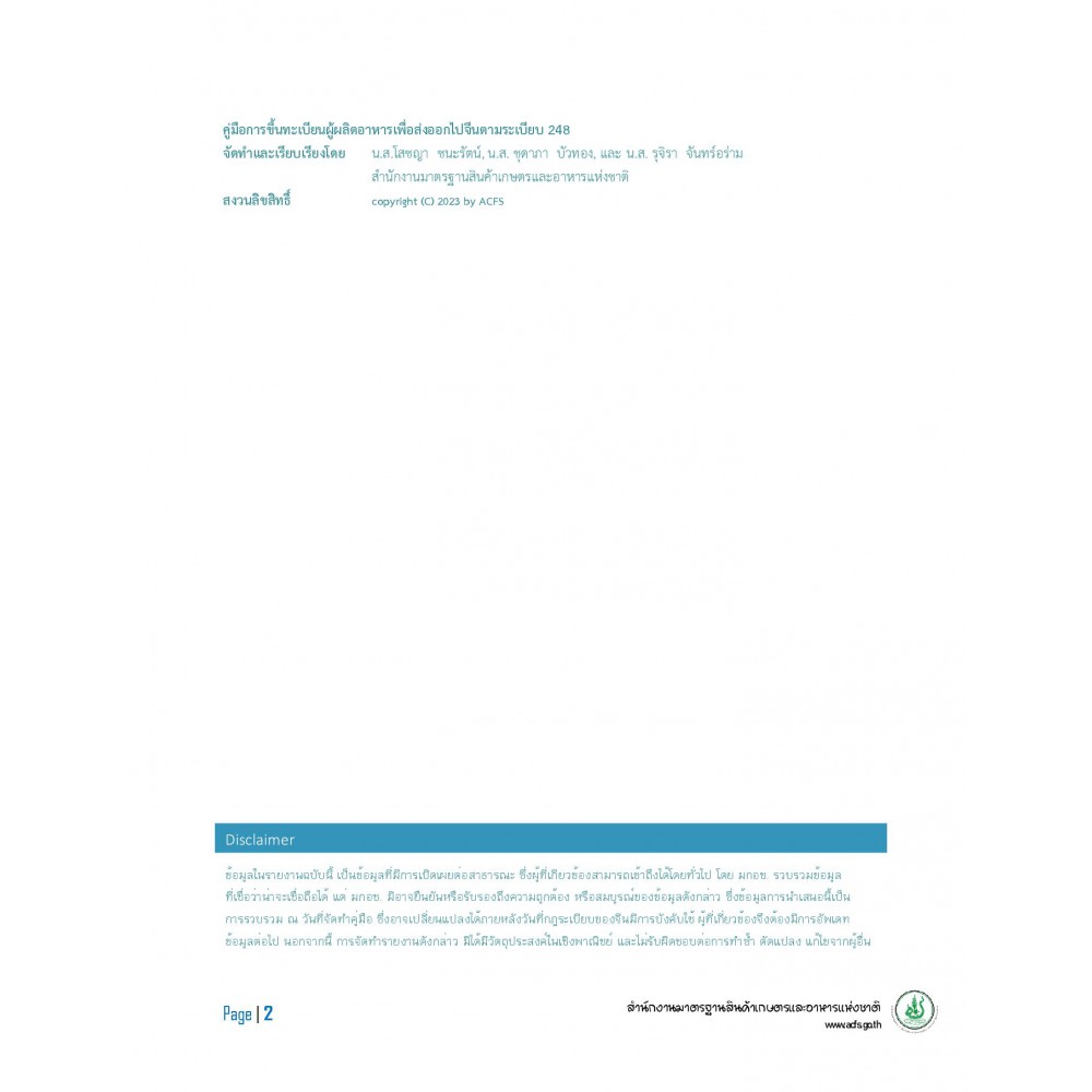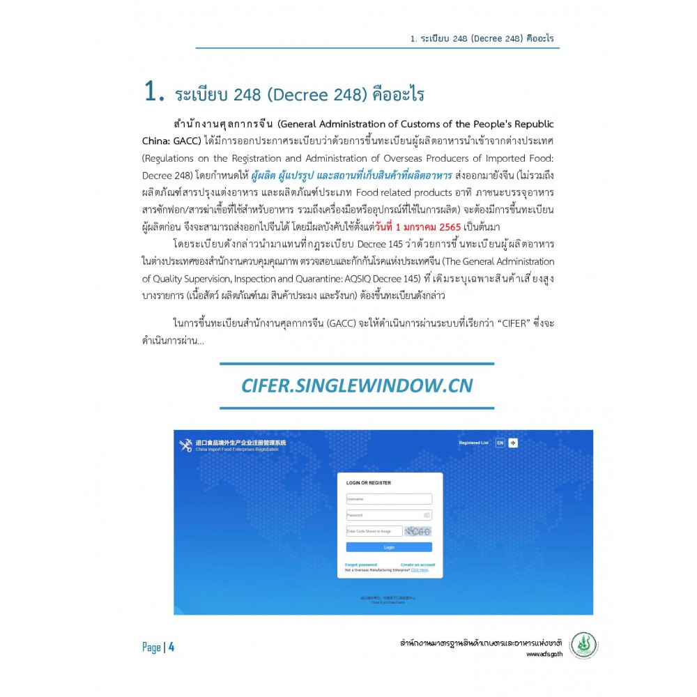 สำนักงานมาตรฐานสินค้าเกษตรและอาหารแห่งชาติ (มกอช.) ได้จัดทำคู่มือการขึ้นทะเบียนผู้ผลิตอาหารเพื่อส่งออกไปจีนตามระเบียบ 248 ซึ่งกำหนดให้ผู้ผลิตสินค้าเกษตรและอาหารที่จะส่งออกไปยังจีนต้องมีการขึ้นทะเบียนผ่านระบบ cifer.singlewindow.cn โดยสรุปแนวทางการขึ้นทะเบียนโดยเฉพาะอย่างยิ่งการขึ้นทะเบียนด้วยตัวเอง รวมไปถึงข้อมูลติดต่อสำหรับหน่วยงานกำกับดูแลของไทยกรณีที่ท่านต้องขึ้นทะเบียนผ่านหน่วยงาน โดยมีการวิเคราะห์และรวบรวมข้อมูลจากแหล่งต่างๆ เพื่อนำมาสรุปเป็นขั้นตอนแบบ step-by-step เพื่อให้ง่ายต่อการเข้าใจมากขึ้น