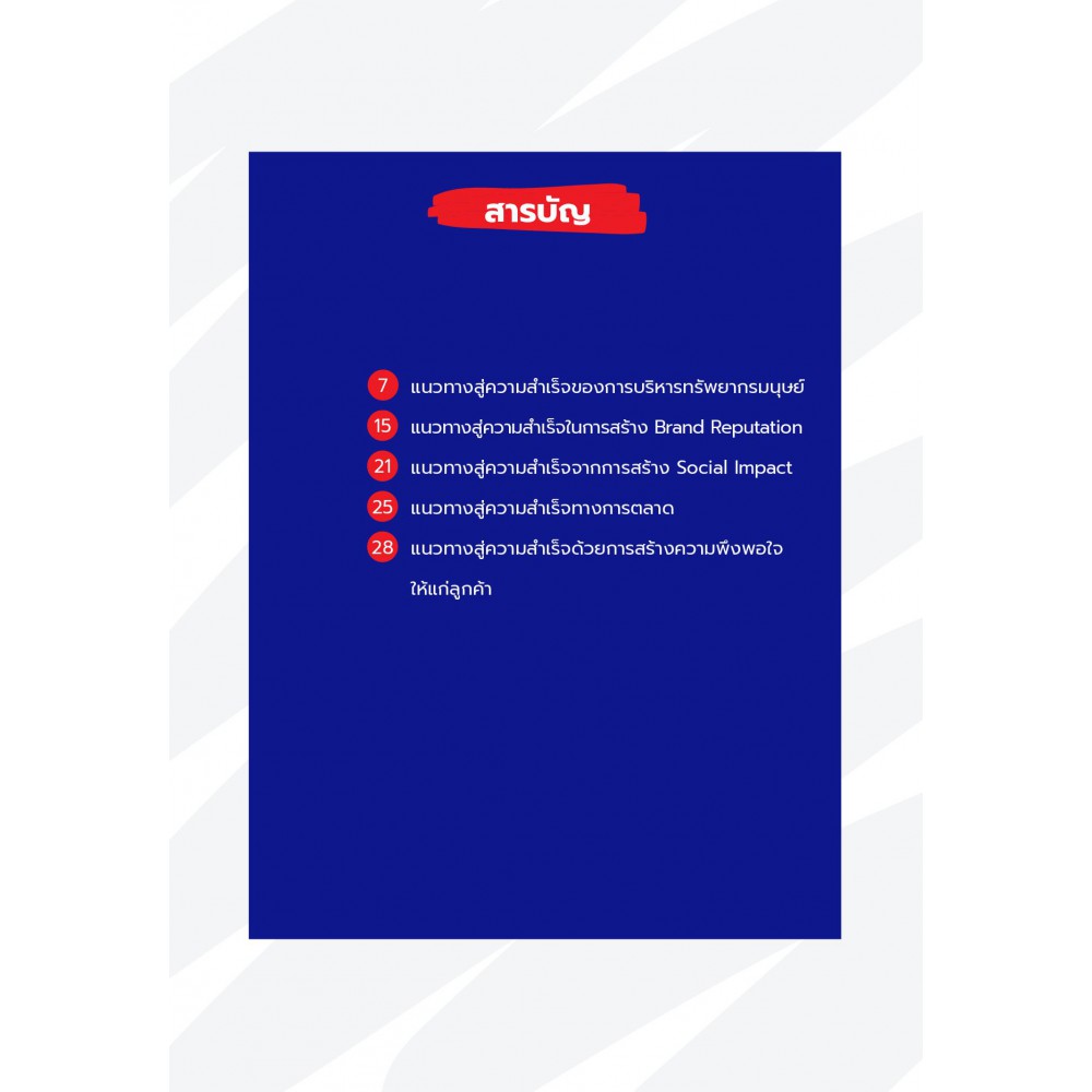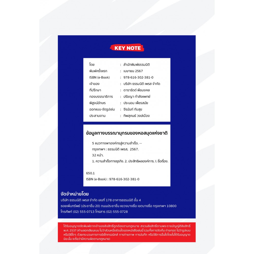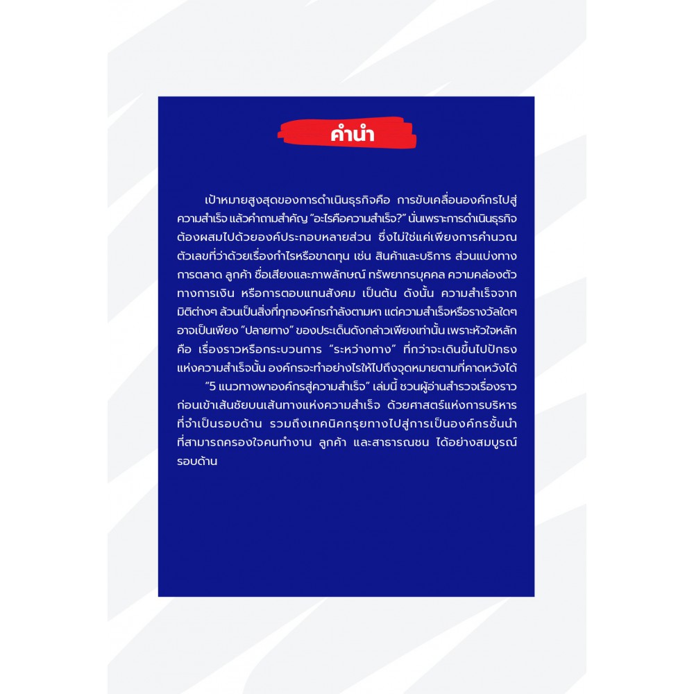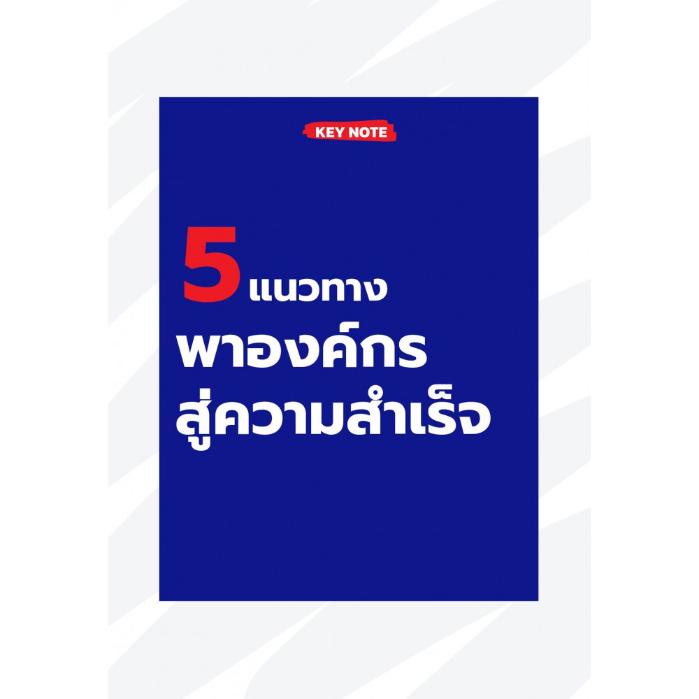 หมุดหมายของทุกๆ การบริหารองค์กร คือ การเดินไปสู่ความสำเร็จ ทว่าเป้าหมายที่ตั้งไว้จะเกิดขึ้นได้ ล้วนมีปัจจัยที่หลากหลายหลอมรวมเข้าด้วยกัน ฉะนั้น ในหนังสือ “5 แนวทางพาองค์กรสู่ความสำเร็จ” เล่มนี้ จะเป็นประโยชน์ต่อการบริหารองค์กรเพื่อบรรลุตามวัตถุประสงค์ ยกระดับองค์กรอย่างสร้างสรรค์ให้เกิดเป็นความพึงพอใจของพนักงานรวมถึงลูกค้า มุ่งสู่การเป็นองค์กรที่ประสบความสำเร็จรอบด้านและยั่งยืน