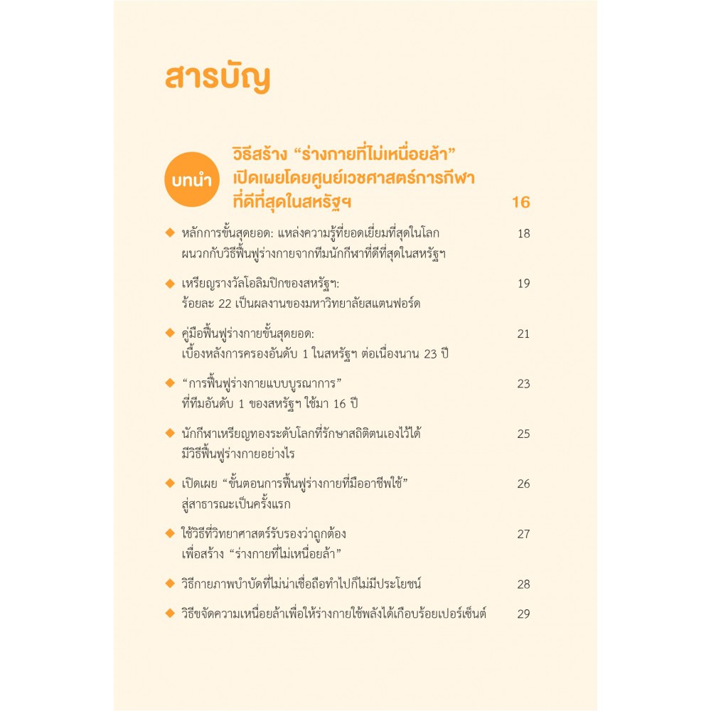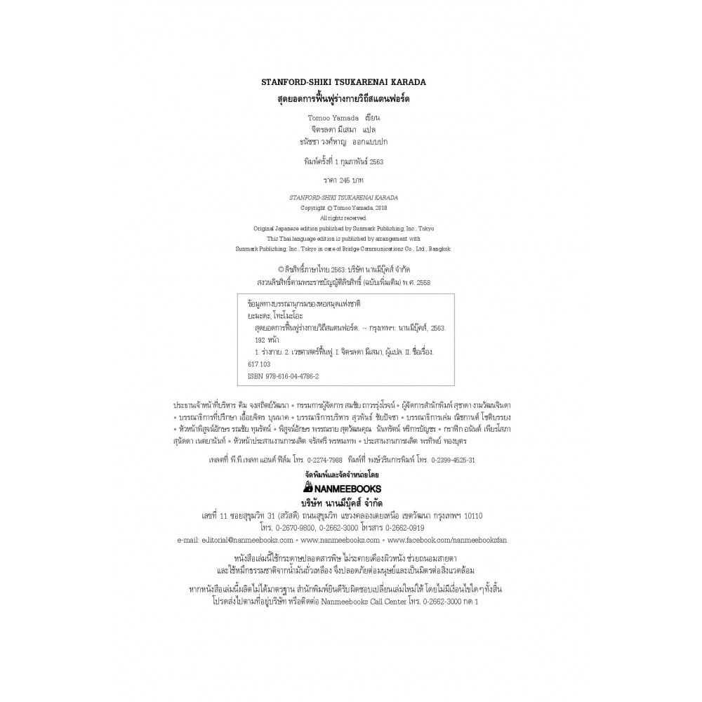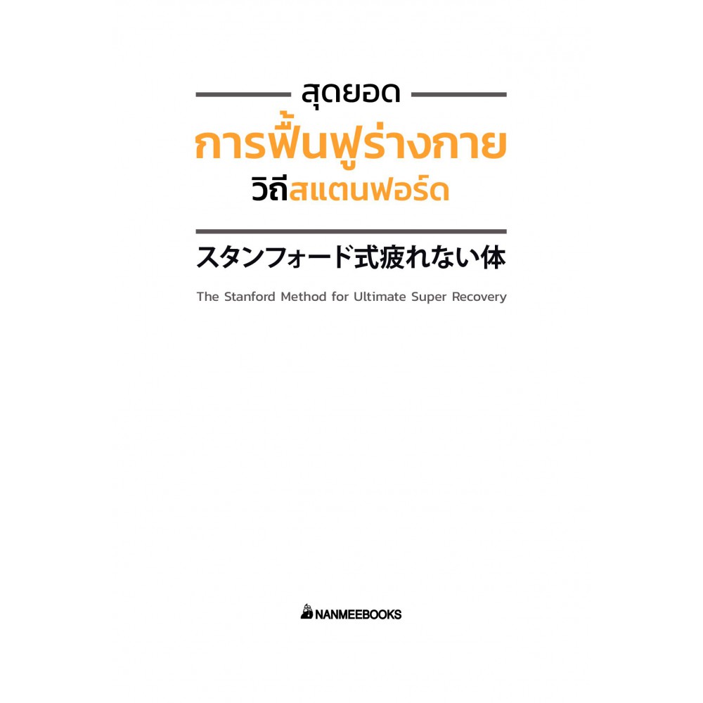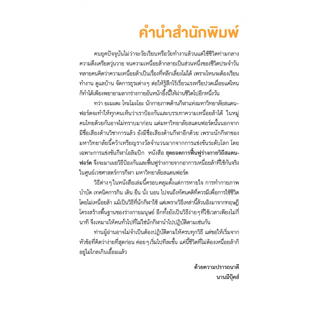 เรียนรู้วิธีป้องกันและฟื้นฟูร่างกายจากความเหนื่อยล้าด้วยเคล็ดลับจากมหาวิทยาลัยสแตนฟอร์ด มหาวิทยาลัยสแตนฟอร์ด มีชื่อเสียงทางด้านกีฬาเป็นอย่างมาก เพราะนักกีฬามหาลัยนี้คว้าเหรียญรางวัลจำนวนมากจากการแข่งกีฬาระดับโลก โดยเฉพาะการแข่งขันกีฬาโอลิมปิค ยามาดะ โทโมโอะ นักกายภาพด้านกีฬาจากศูนย์เวชศาสตร์การกีฬามหาวิทยาลัยสแตนฟอร์ด จะมาดผยเคล็ดลับของนักกีฬาเหล่านี้ว่าพวกเขามีวิธีฟื้นฟูและป้องกันร่างกายไม่ให้เกิดความเหนื่อยล้าอย่างไร วิธีต่าง ๆ ในหนังสือเล่มนี้ครอบคลุมถึง วิธีการหายใจ การทำกายภาพบำบัด เทคนิคการกิน วิธีเดิน ยืน นั่ง นอน ไปจนถึงทัศนคติที่ควรมี เพื่อให้ใช้ชีวิตโดยไม่เหนื่อย ถึงจะเป็นวิธีที่นักกีฬาอาชีพใช้ แต่คนทั่วไปก็นำไปใช้ได้ด้วยเช่นกันเขียนโดยผู้เชี่ยวชาญที่ดูแลนักกีฬาระดับโลกมากกว่า 15 ปี และเป็นตัวจริงด้านการจัดการกับความเหนื่อยล้า ด้วยเทคนิคอันหลากหลายและครอบคลุมทุกมิติของการดำเนินชีวิต ซึ่งคนทั่วไปสามารถปฏิบัติตามได้ง่าย มีอธิบายเกี่ยวกับความเหนื่อยล้าอย่างละเอียด เนื้อหามีงานวิจัยของมหาวิทยาลัยสแตนฟอร์ดรองรับ เนื้อหาใช้คำเข้าใจง่าย ไม่ได้เก่งวิทยาศาสตร์ก็มาสามารถเข้าใจได้ง่าย