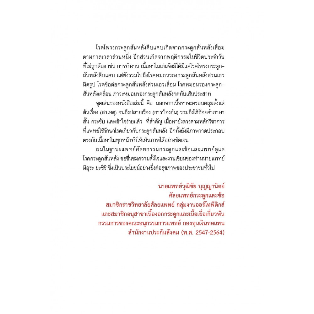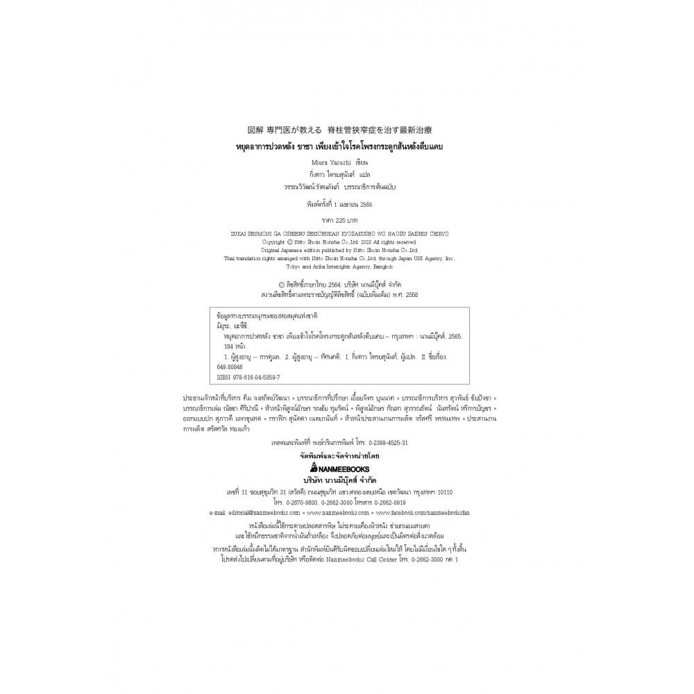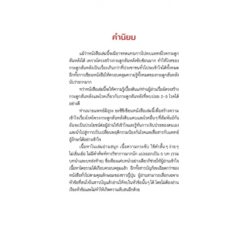 โรคโพรงกระดูกสันหลังตีบแคบเกิดจากโครงสร้างโพรงกระดูกสันหลังแคบลง เมื่อมีอายุมากขึ้น ทำให้เส้นประสาทที่อยู่ภายในถูกกดทับและได้รับความเสียหาย ส่งผลให้เกิดอาการปวดหลังหรือปวดชาที่ขาซึ่งส่งผลต่อการใช้ชีวิตประจำวัน ดังนั้น จึงควรตรวจให้พบโรคตั้งแต่เนิ่น ๆ และใช้วิธีรักษาอย่างเหมาะสม หนังสือเล่มนี้ จะอธิบายสาเหตุของโรค อาการที่สำคัญ กระบวนการตรวจวินิจฉัย การรักษา ตามอาการ รวมถึงคำแนะนำเรื่องการผ่าตัดเพื่อรักษาให้หายขาด อย่างไรก็ตาม