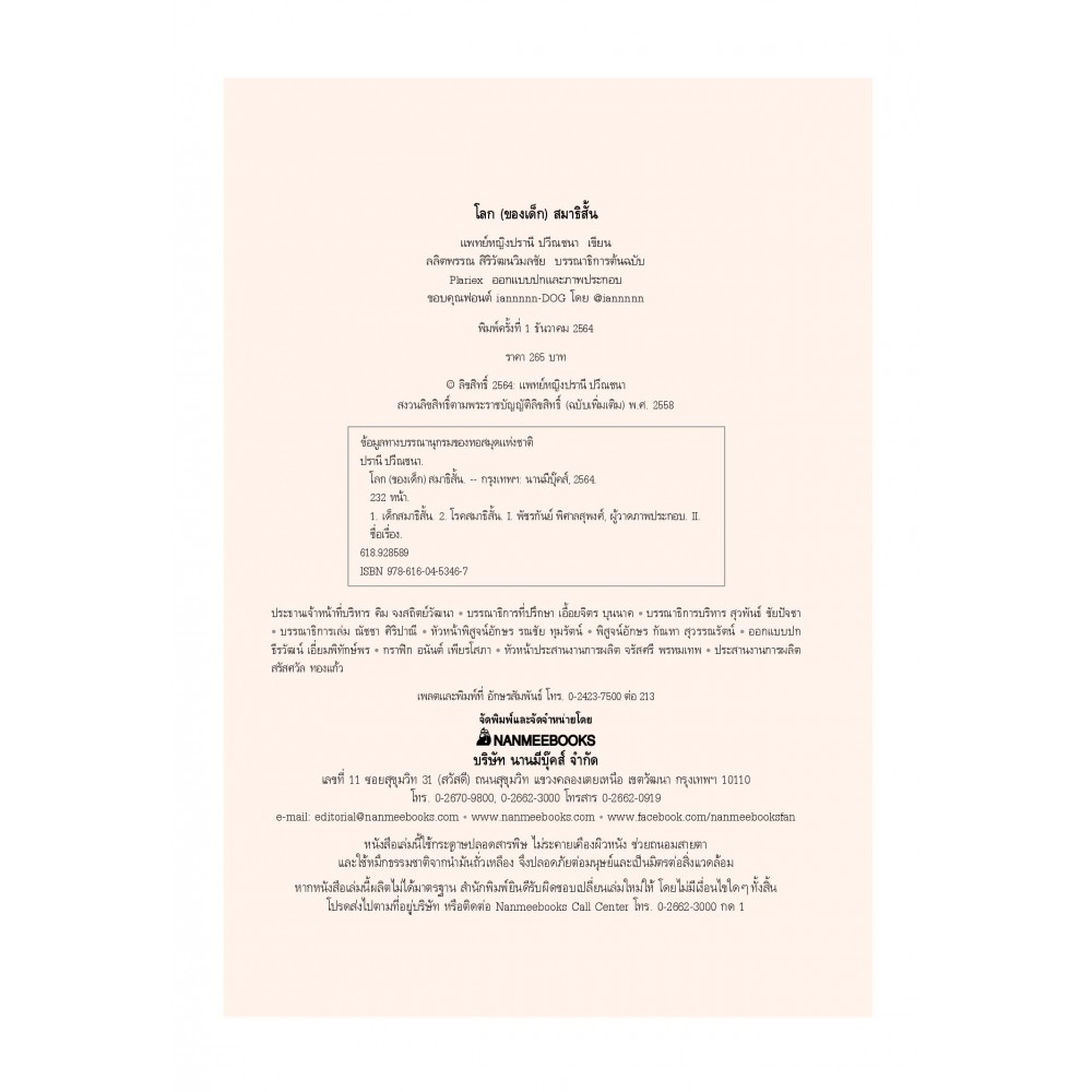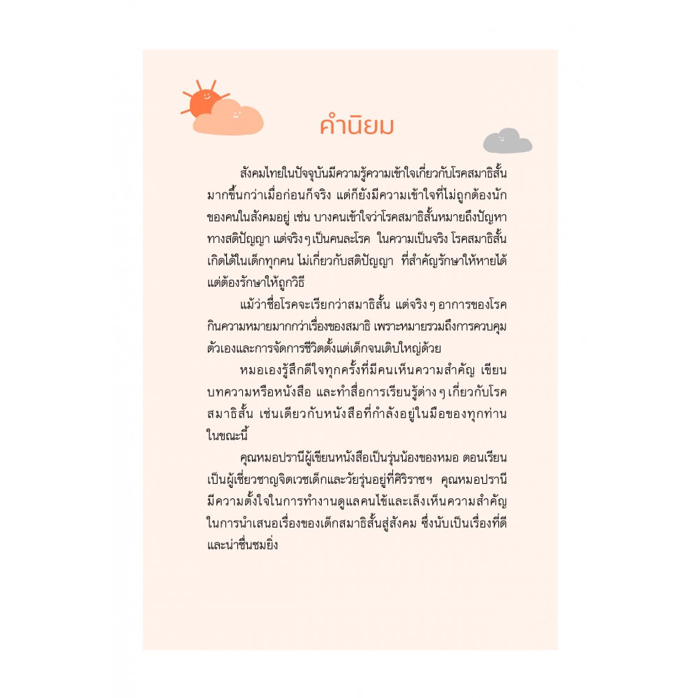 เรียนรู้และทำความเข้าใจเกี่ยวกับแง่มุมต่าง ๆ ของ “โรคสมาธิสั้น (ADHD- Attention Def icit Hyperactivity Disorder) ในเด็ก” ผ่านเรื่องราวของตะวันและน้ำฝน ตัวแทนเด็กสมาธิสั้น จากปลายปากกาของคุณหมอแมวน้ำหรือแพทย์หญิงปรานี ปวีณชนา จิตแพทย์เด็กและวัยรุ่น เจ้าของเพจ “หมอแมวน้ำเล่าเรื่อง” ตั้งแต่ข้อมูลทั่วไป ของโรค อาการแสดงของโรคที่แตกต่างกันไปในแต่ละคน