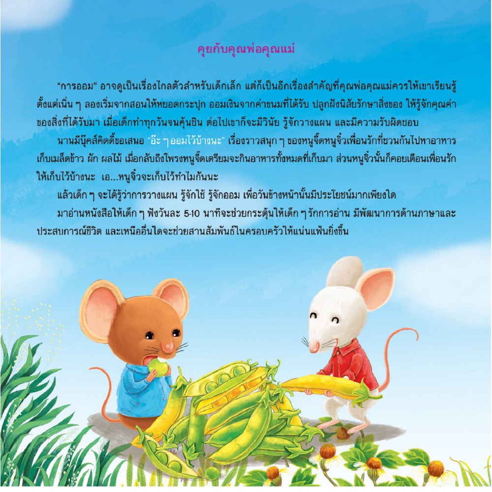 เรื่องราวน่ารักของสองเพื่อนรักหนูจี๊ดกับหนูจิ๋วที่ชวนกันไปหาอาหาร เก็บผักผลไม้ เมื่อขนมาถึงโพรง หนูจี๊ดเตรียมจะกินแต่หนูจิ๋วเตือนให้เก็บออมไว้บ้าง เอ...หนูจิ๋วจะเก็บไว้ทำอะไรกันนะ เด็ก ๆ มาอ่านไปพร้อม ๆ กันดีกว่า"