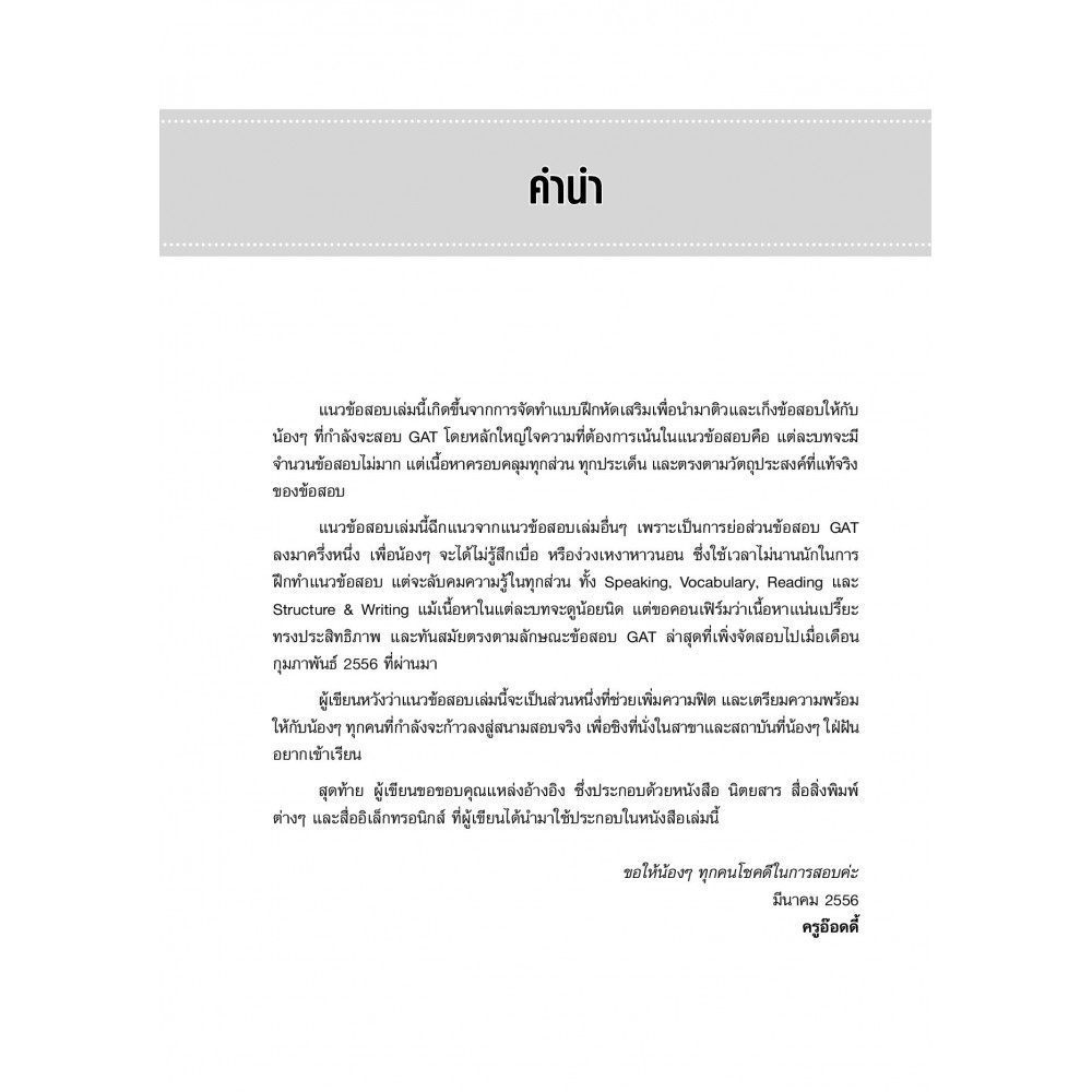 แนวข้อสอบเล่มนี้ ฉีกแนวจากแนวข้อสอบเล่มอื่นๆ เพราะเป็นการย่อส่วนข้อสอบ GAT ภาษาอังกฤษลงมาครึ่งหนึ่ง เพื่อที่น้องๆ จะได้ไม่รู็สึกเบื่อ ง่วงเหงาหาวนอน และใช้เวลาไม่นานนักในการฝึกซ้อมฝีมือ และลับความความรู้ในทุกส่วน ทั้ง Speaking, Vocabulary, Reading และ Structure & Writing แม้เนื้อหาในแต่ละบทจะดูกะทัดรัด แต่รับรองว่าอัดแน่นไปด้วยใจความสำคัญ ทรงประสิทธิภาพ และทันสมัย ตรงตามข้อสอบ GAT ล่าสุด