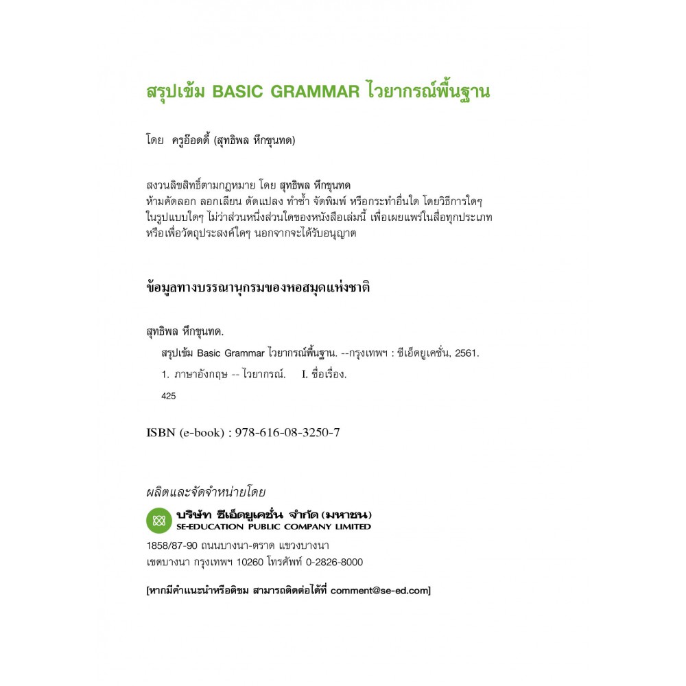 รวมความรู้พื้นฐานด้านไวยากรณ์ภาษาอังกฤษอย่างละเอียด เพื่อนำมาใช้เรียนรู้หรือทบทวนความรู้และกฎเกณฑ์พื้นฐานต่าง ๆ เกี่ยวกับไวยากรณ์ภาษาอังกฤษที่จำเป็นต้องรู้และเข้าใจ เพื่อปูพื้นฐานความรู้ด้านไวยากรณ์ให้แข็งแกร่ง ก่อนพัฒนาต่อยอดนำความรู้ที่ได้ ไปเรียนรู้ภาษาอังกฤษในระดับที่สูงขึ้นต่อไปได้อย่างรวดเร็วและมีประสิทธิภาพ นอกจากนี้ในเล่มยังได้จัดทำแนวข้อสอบที่หลากหลายมากถึง 1,600 ข้อ ที่มีประสิทธิภาพและทันสมัย ช่วยฝึกฝนและพัฒนาความรู้ด้านไวยากรณ์ให้เข้าใจและเชี่ยวชาญมากยิ่งขึ้น เป็นตัวช่วยที่ดีในการเตรียมตัวสอบ และช่วยเพิ่มคะแนนสอบภาษาอังกฤษทั้งในชั้นเรียนหรือสนามสอบต่าง ๆ ได้อย่างมั่นใจเต็มร้อย สารบัญ - Parts of Speech (ส่วนของคำพูด) - Nouns (คำนาม) - Articles (คำนำหน้านาม) - Quantifiers (คำบอกปริมาณ) - Pronouns (คำสรรพนาม) - Adjectives (คำคุณศัพท์) - Adverbs (คำกริยาวิเศษณ์) - Conjunctions (คำสันธาน) - Prepositions (คำบุพบท) - Subject-Verb Agreement (ความสอดคล้องประธานและกริยา) ฯลฯ
