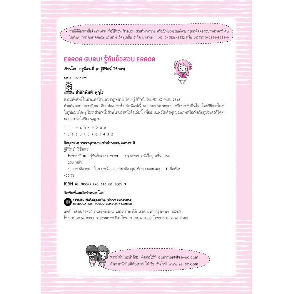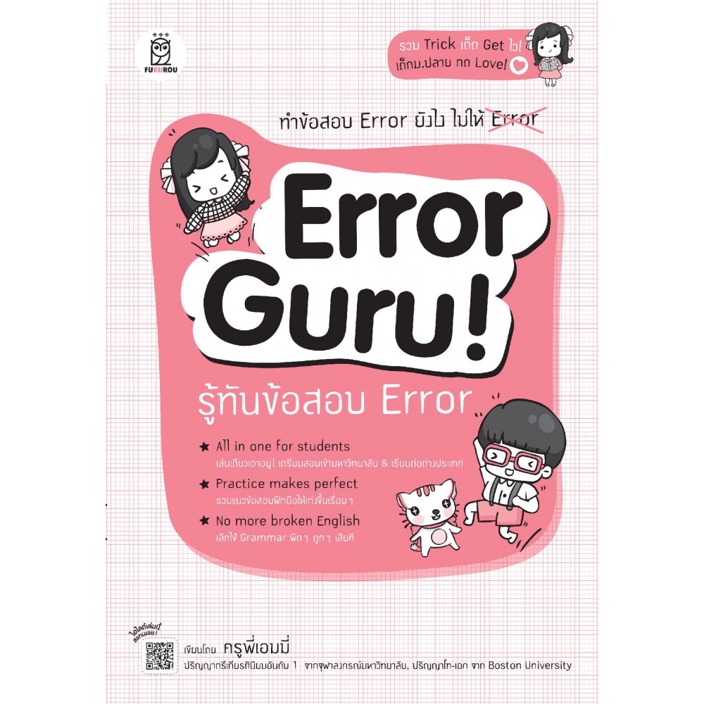 "Error Guru! รู้ทันข้อสอบ Error" หนังสือติวข้อสอบ Error สำหรับน้อง ๆ ม.ปลาย เขียนโดย "ครูพี่เอมมี่" นักเขียนเจ้าของเพจดัง "I Speak English" ซึ่งมีเทคนิคการทำข้อสอบที่จดจำได้ง่าย พร้อมแนวข้อสอบให้น้อง ๆ ฝึกทำก่อนลงสนามจริงกว่า 14 ชุด โดยมีเฉลยอย่างละเอียด แม้ Grammar ไม่แข็งแรง ก็เข้าใจได้ง่าย แถมคำศัพท์ที่ออกสอบบ่อยแบบเน้น ๆ กว่า 1,160 คำ ทั้งระดับมัธยมและอุดมศึกษา ไม่ว่าจะเตรียมสอบเข้ามหาวิทยาลัยและเรียนต่อต่างประเทศ เล่มนี้เล่มเดียว เอาอยู่!