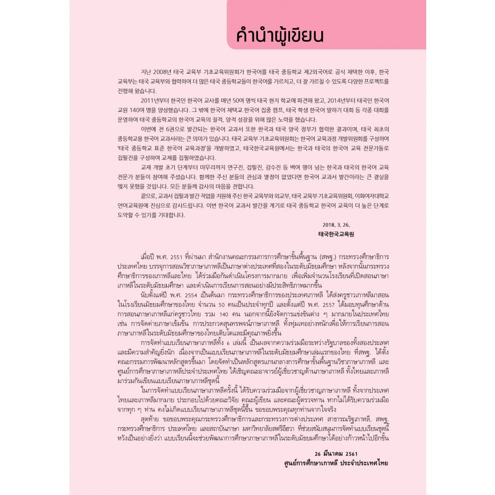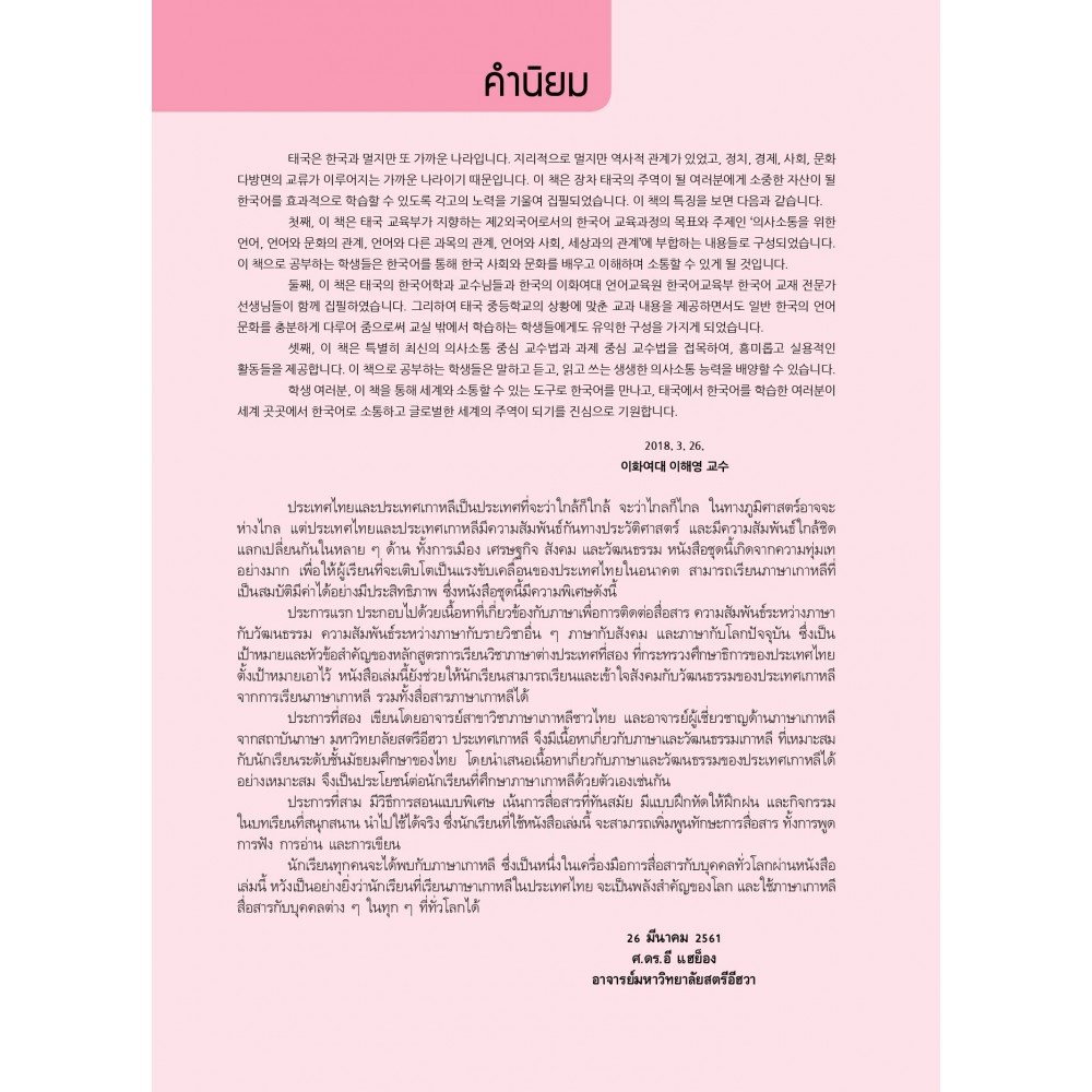 นักเรียนทุกคนจะได้พบกับภาษาเกาหลี ซึ่งเป็นหนึ่งในเครื่องมือการสื่อสารกับบุคคลทั่วโลกผ่านหนังสือเล่มนี้ หวังเป็นอย่างยิ่งว่านักเรียนที่เรียนภาษาเกาหลีในประเทศไทย จะเป็นพลังสำคัญของโลก และใช้ภาษาเกาหลีสื่อสารกับบุคคลต่าง ๆ ในทุก ๆ ที่ทั่วโลกได้
