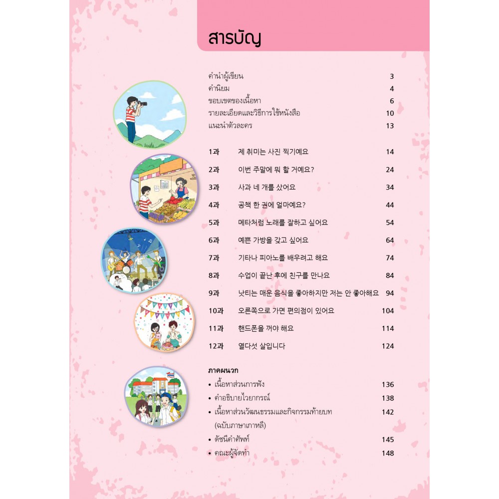 หนังสือเรียนภาษาเกาหลีที่เหมาะสำหรับนักเรียนมัธยมศึกษาและบุคคลทั่วไปที่เริ่มต้นเรียนภาษาเกาหลี มีทั้งหมด 6 เล่ม ในเล่มประกอบด้วยบทเรียนทั้งหมด 12 บท แต่ละบทมีคำศัพท์ไวยากรณ์ หลักการออกเสียง และแบบฝึกหัดสำหรับฝึกฝนทักษะด้านต่างๆ ทั้งการพูด ฟัง อ่าน และเขียน นอกจากนี้ ยังมีเนื้อหาเกี่ยวกับวัฒนธรรมและกิจกรรมท้ายบท ที่ช่วยเพิ่มความรู้และส่งเสริมให้ผู้เรียนเรียนภาษาเกาหลีได้สนุกสนานมากขึ้น