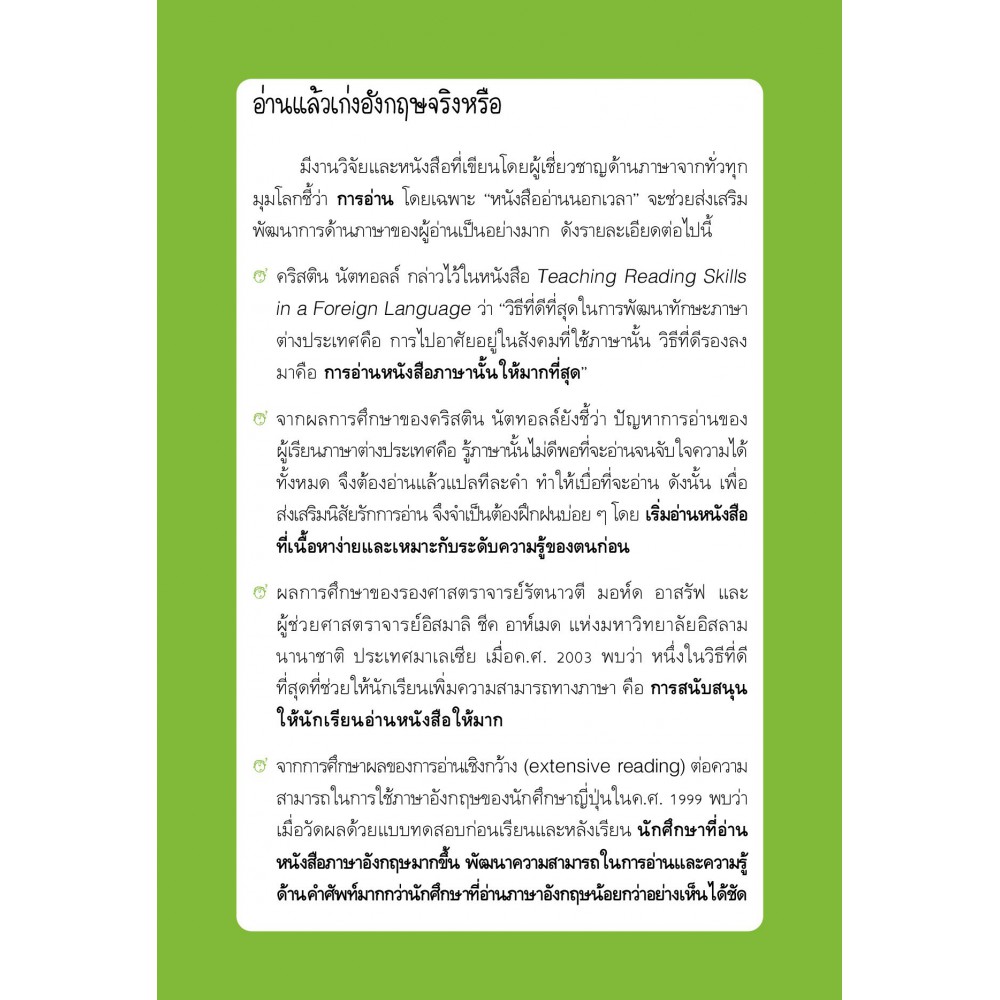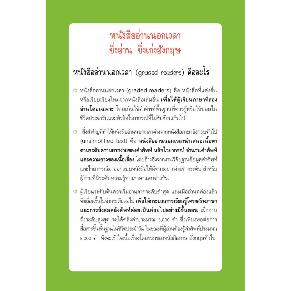 ยิ่งอ่านยิ่งเก่งอังกฤษเพราะมีคำแปลศัพท์และหน้าที่คำหน้าต่อหน้า เสริมความรู้ไวยากรณ์ กลุ่มศัพท์ สำนวน คำอ่าน และแบบฝึกหัด แบ่งจำนวนคำและโครงสร้างภาษาเป็นระดับให้เลือกอ่านตามความเหมาะสม