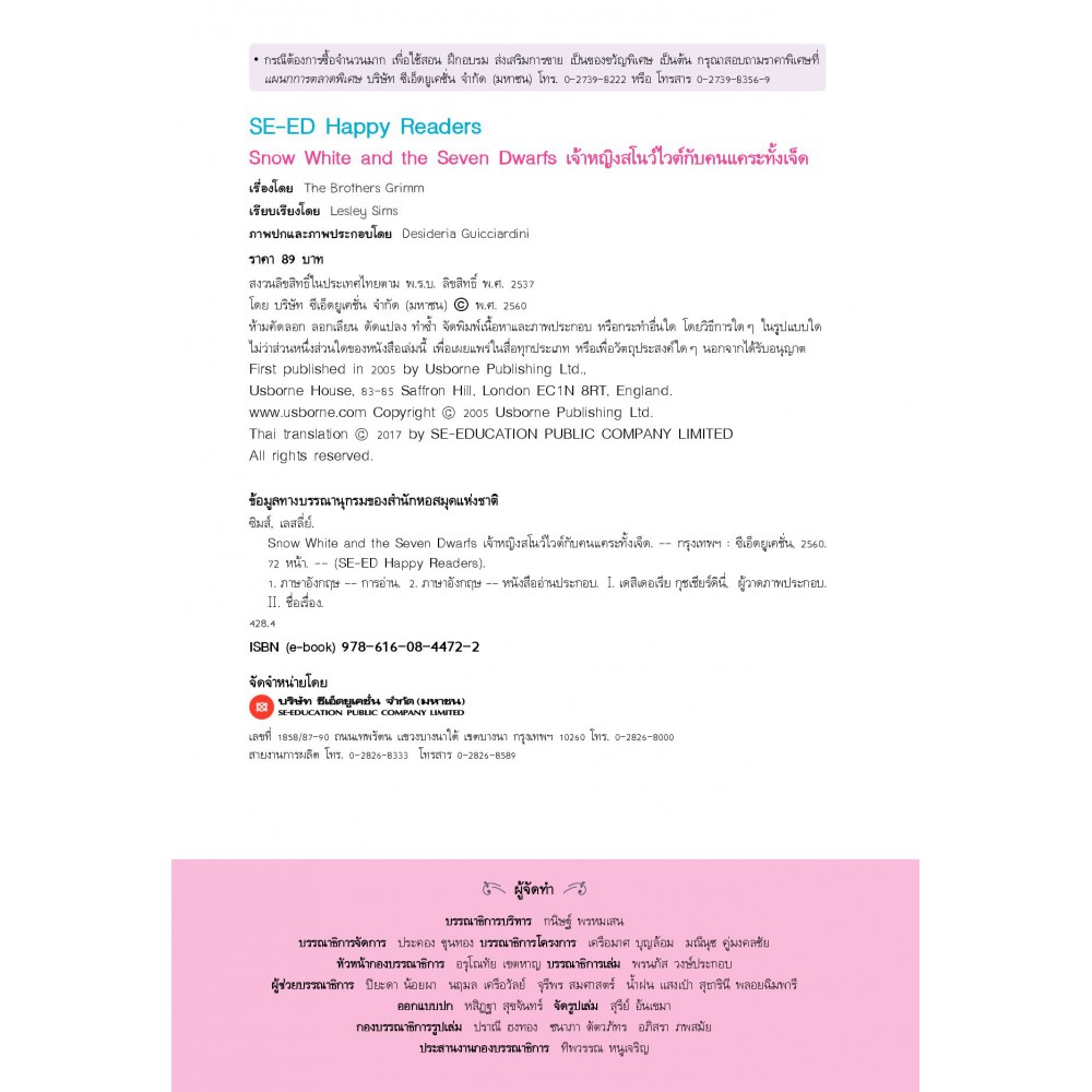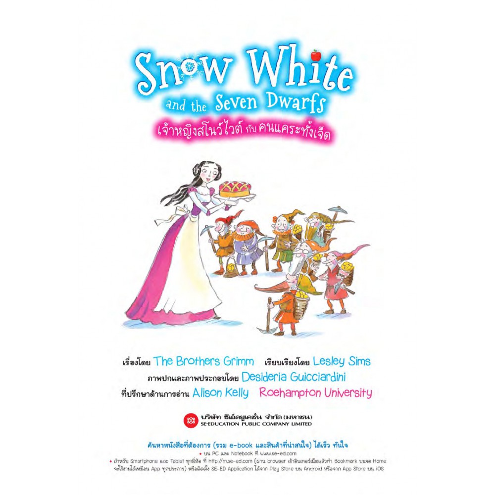 เจ้าหญิงสโนว์ไวต์ถูกราชินีแม่เลี้ยงใจร้ายหมายเอาชีวิต เพราะราชินีอยากเป็นเจ้าหญิงที่งามเลิศที่สุดในปฐพี สโนว์ไวต์รอดการปองร้ายมาได้หลายครั้งจากการช่วยเหลือของคนแคระทั้งเจ็ด ทว่าสุดท้ายสโนว์ไวต์จะเอาชีวิตรอดจากเงื้อมมือราชินีได้หรือไม่? ติดตามร่วมลุ้นพร้อมกันได้ในเล่ม