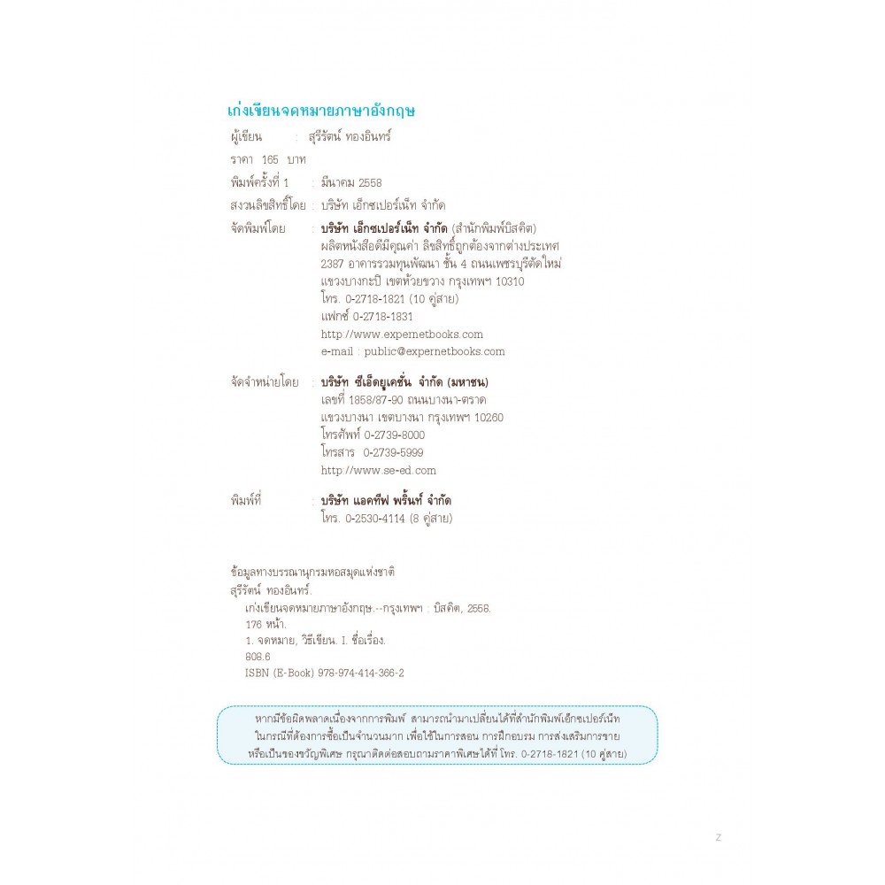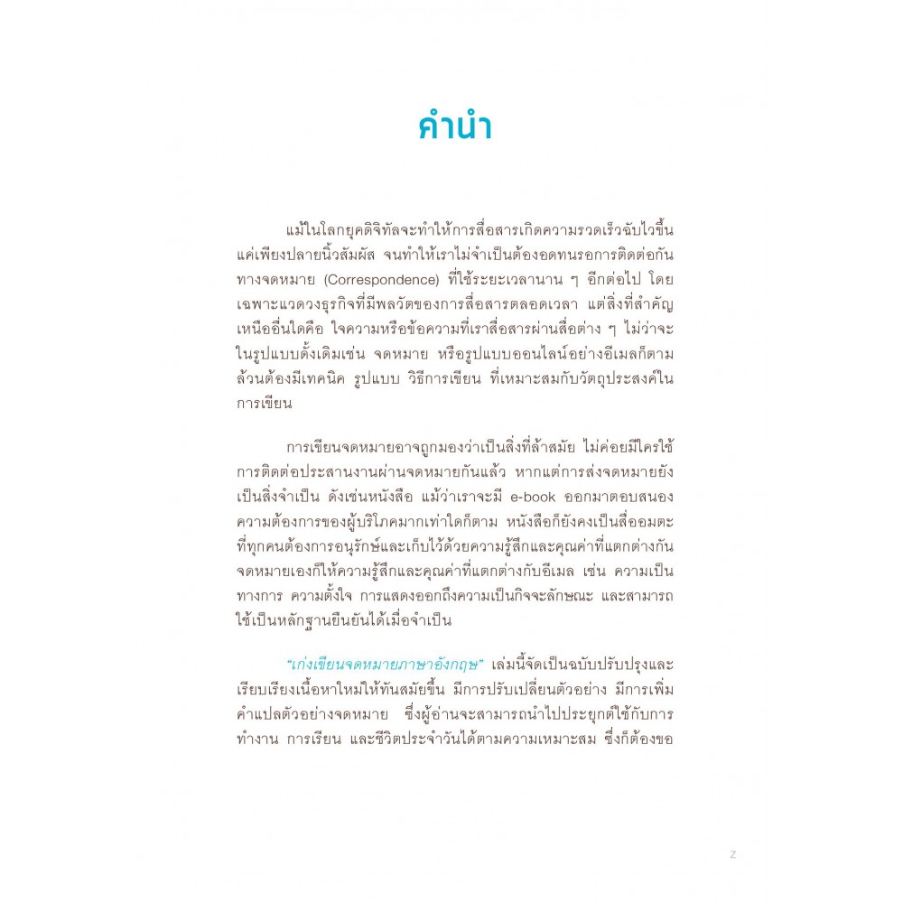 "หนังสือ "เก่งเขียนจดหมายภาษาอังกฤษ" เล่มนี้ ได้รวบรวมวิธีการเขียนจดหมาย พร้อมทั้งตัวอย่างจดหมายและประโยคภาษาอังกฤษที่ควรรู้ ไว้มากมาย อาทิ การเขียนจดหมายภาษาอังกฤษธุรกิจและจดหมายสังคม จดหมายเพื่อนัดหมาย จดหมายเพื่อการขาย จดหมายตอบปฏิเสธ จดหมายร้องเรียนบริการ จดหมายเพื่อรับรองเข้าทำงาน และจดหมายแสดงความยินดี ที่พร้อมให้คุณใช้งานได้ทันทีในทุกสถานการณ์ สารบัญ บทที่ 1 รูปแบบจดหมายธุรกิจ บทที่ 2 จดหมายแจ้งเพื่อทราบ บอกให้ทำ บทที่ 3 จดหมายธุรกิจในเชิงลบ บทที่ 4 จดหมายเพื่อการโน้มน้าวใจ บทที่ 5 จดหมายทางสังคม ตัวอย่างจดหมายเพื่อการใช้งาน - หมวดสินค้าและบริการ - การทำธุรกิจ - การทำงาน - เชื้อเชิญ - แสดงความยินดี และแสดงความเสียใจ"
