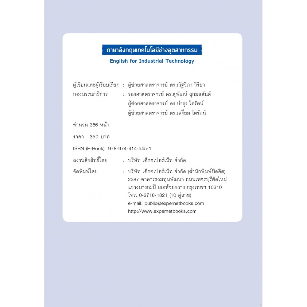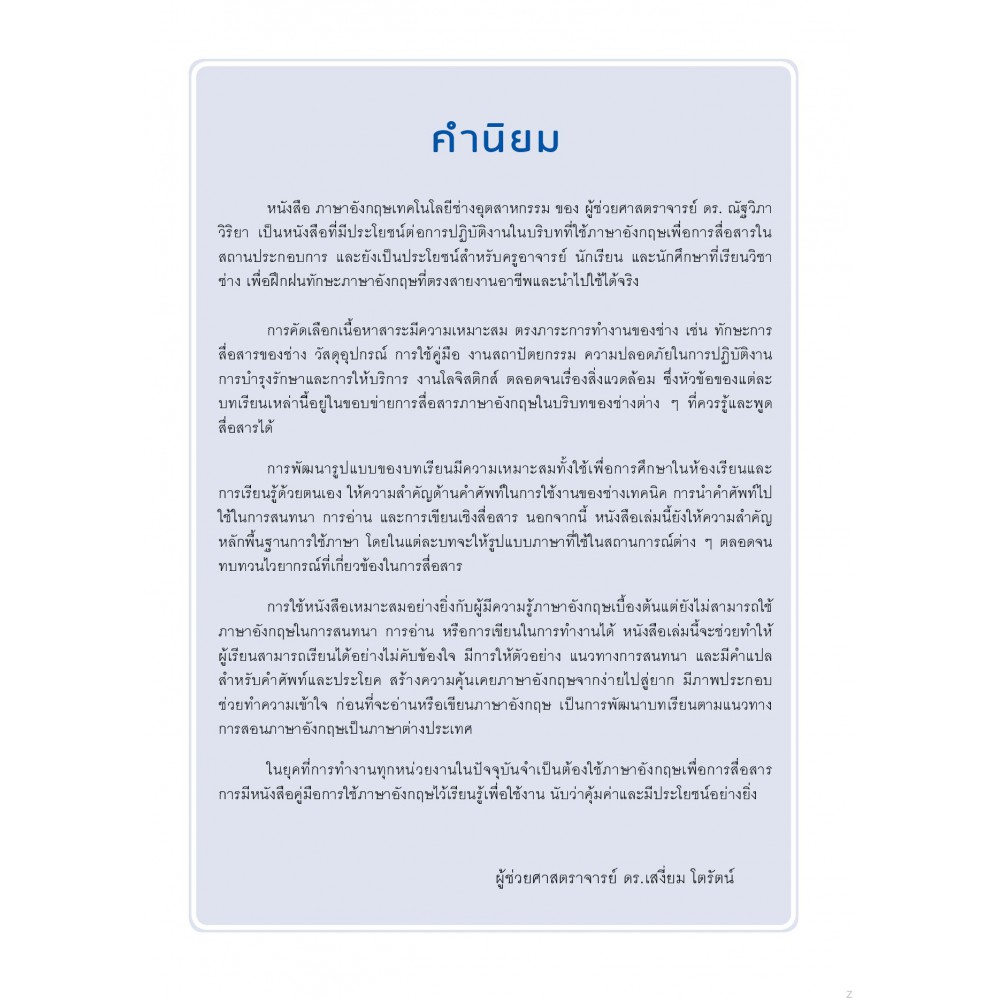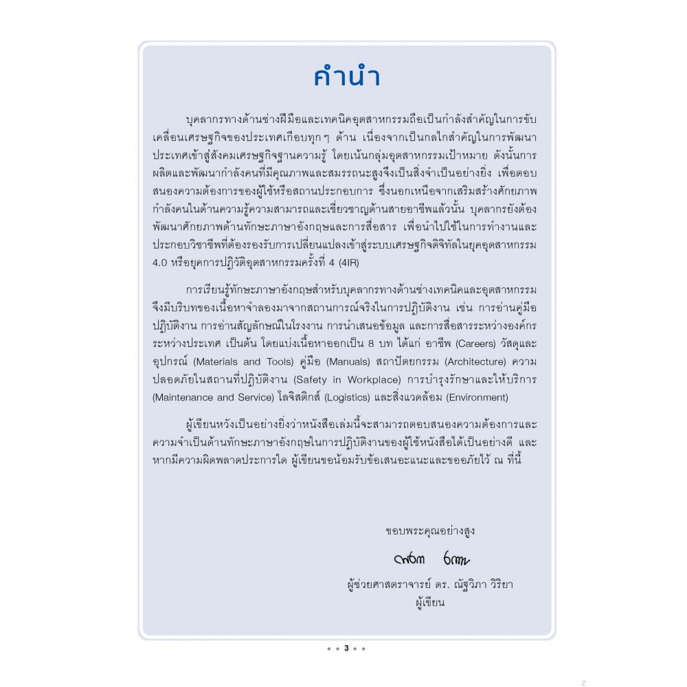 " บุคลากรทางด้านช่างฝีมือและเทคนิคอุตสาหกรรมถือเป็นกำลังสำาคัญในการขับเคลื่อนเศรษฐกิจของประเทศ ดังนั้นการผลิตและพัฒนากำาลังคนที่มีคุณภาพและสมรรถนะสูงจึงเป็นสิ่งจำาเป็นอย่างยิ่ง ซึ่งนอกเหนือจากเสริมสร้างศักยภาพกำาลังคนในด้านความรู้ความสามารถและเชี่ยวชาญด้านสายอาชีพแล้วนั้น บุคลากรยังต้องพัฒนาศักยภาพด้านทักษะภาษาอังกฤษและการสื่อสาร เพื่อนำาไปใช้ในการทำางานและประกอบวิชาชีพที่ต้องรองรับการเปลี่ยนแปลงเข้าสู่ระบบเศรษฐกิจดิจิทัลในยุคอุตสาหกรรม 4.0 หรือยุคการปฏิวัติอุตสาหกรรมครั้งที่ 4 (4IR) หนังสือเล่มนี้จะช่วยเสริมทักษะการเรียนรู้ทักษะภาษาอังกฤษสำาหรับบุคลากรทางด้านช่างเทคนิคและอุตสาหกรรม จึงมีบริบทของเนื้อหาจำาลองมาจากสถานการณ์จริงในการปฏิบัติงาน เช่น การอ่านคู่มือปฏิบัติงาน การอ่านสัญลักษณ์ในโรงงาน การนำเสนอข้อมูล และการสื่อสารระหว่างองค์กรระหว่างประเทศ เป็นต้น โดยรวมสาระสำคัญทั้ง 8 บท ไว้อย่างครบถ้วนสมบูรณ์ ตรงสายอาชีพ นำไปใช้ได้จริง! ได้แก่ • อาชีพ (Careers) • วัสดุและอุปกรณ์ (Materials and Tools) • คู่มือ (Manuals) • สถาปัตยกรรม (Architecture) • ความปลอดภัยในสถานที่ปฏิบัติงาน (Safety in Workplace) • การบำารุงรักษาและให้บริการ (Maintenance and Service) • โลจิสติกส์ (Logistics) • สิ่งแวดล้อม (Environment) "