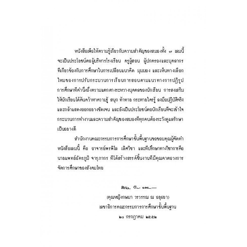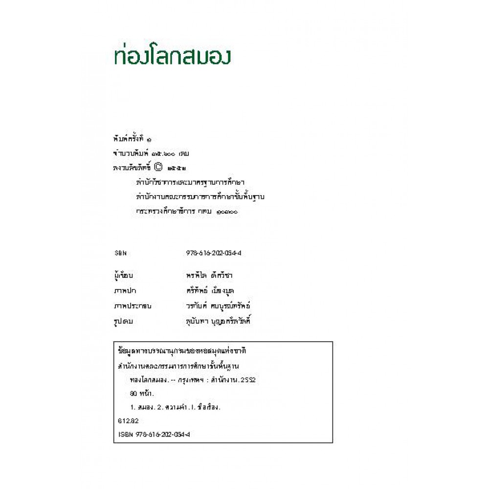 หนังสือเผยแพร่ โดย สำนักวิชาการและมาตรฐานการศึกษา สำนักงานคณะกรรมการการศึกษาขึ้นพื้นฐาน กระทรวงศึกษาธิการ หนังสือ "่ท่องโลกสมอง" เล่มนี้ เขียนขึ้นเพื่อให้เด็กๆ อ่าน ถ้าเด็กรู้จักสมองของตัวเอง ก็จะรู้จักดูแลสมอง รู้จักวิธีกาารใช้สมองอย่างมีประสิทธิภาพมากขึ้น