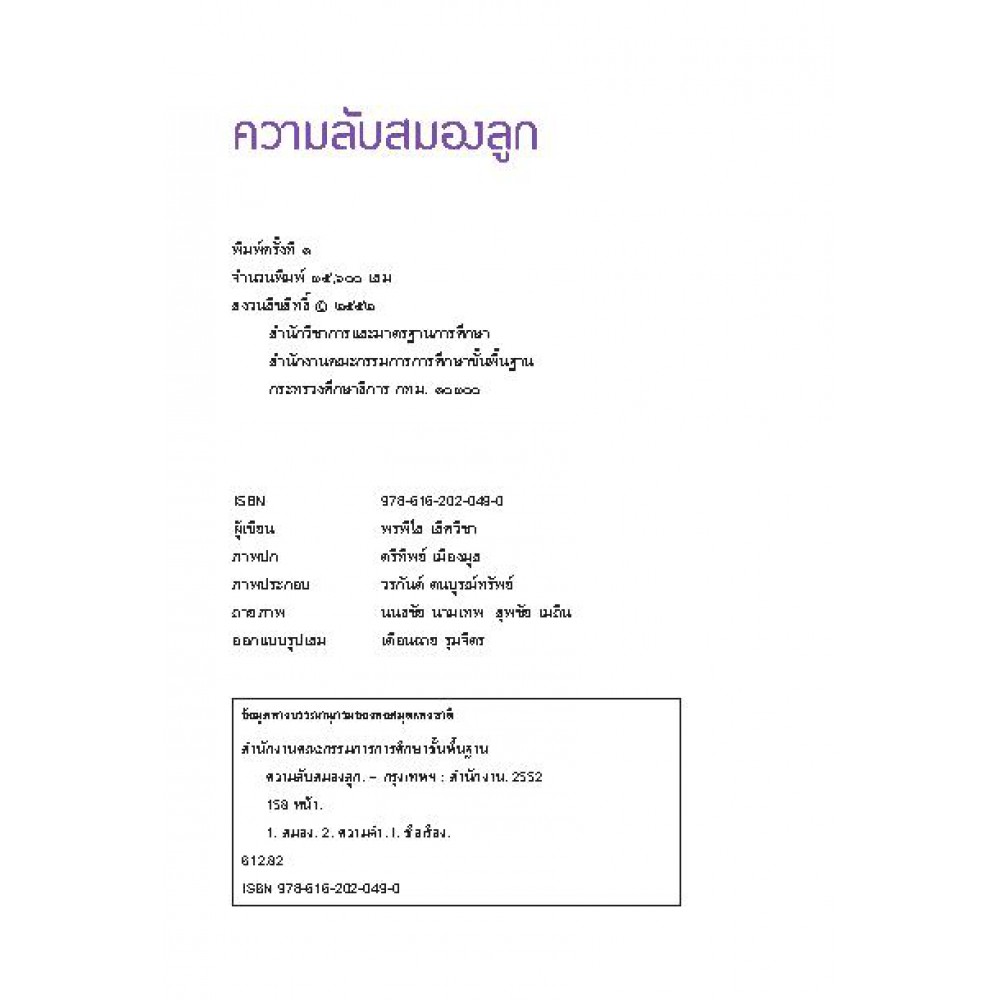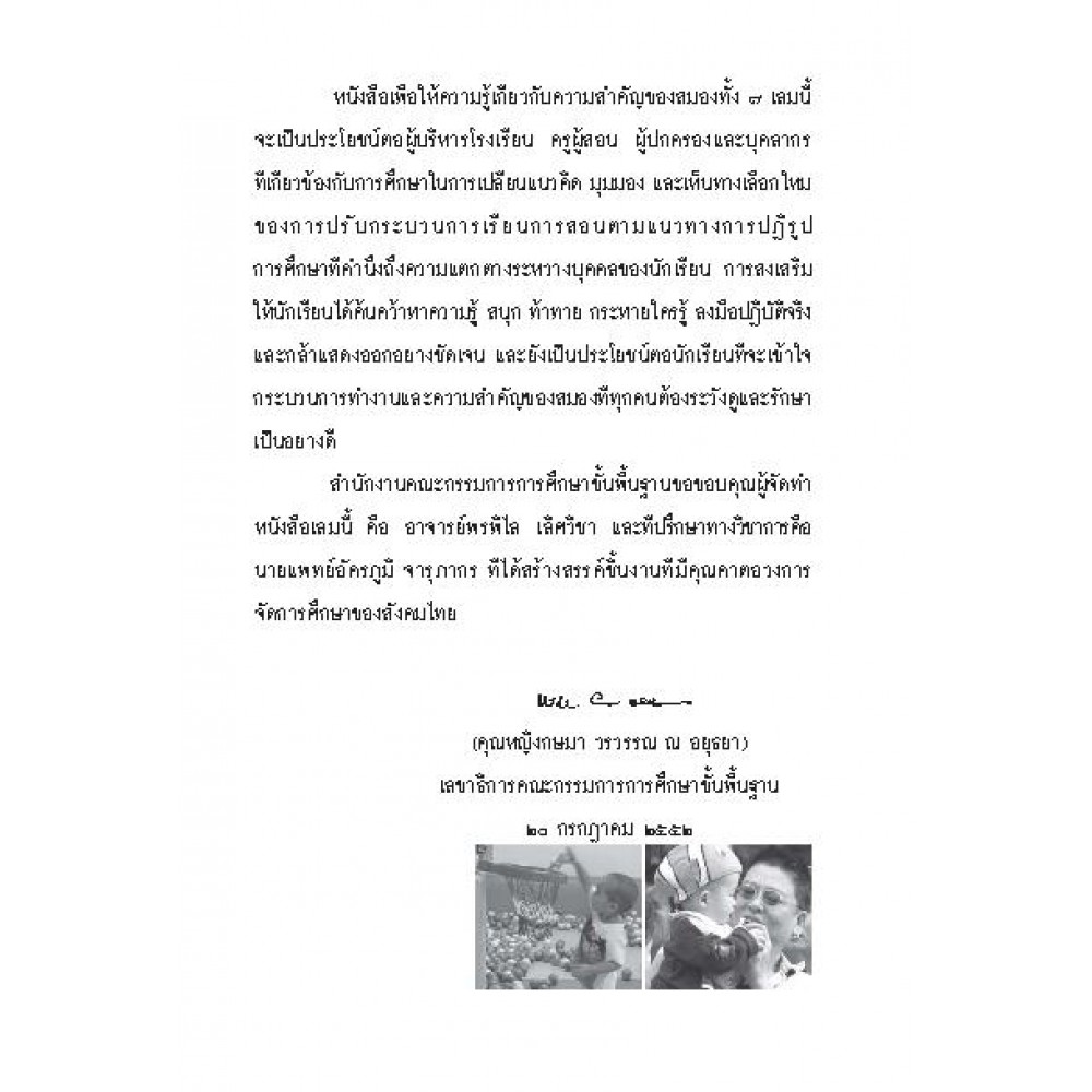 หนังสือเผยแพร่ โดย สำนักวิชาการและมาตรฐานการศึกษา สำนักงานคณะกรรมการการศึกษาขึ้นพื้นฐาน กระทรวงศึกษาธิการ หนังสือความรู้เกี่ยวกับการทำงานของสมองเด็ก กำลังเป็นสิ่งที่ผู้คนสนใจ ตื่นตัว เรียนรู้ เพราะเมื่อรู้จักสมองโอกาสที่เราจะช่วยให้เด็กมีการพัฒนาถูกทาง ถูกวิธีก็เป็นไปได้มากขึ้น